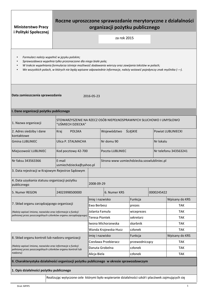 Ministerstwo Pracy ŝWŽůŝƚLJŬŝ^ƉŽųĞĐnjŶĞũ ZŽĐnjŶĞƵƉƌŽƐnjĐnjŽŶĞƐƉƌĂǁŽnjĚĂŶŝĞŵĞƌLJƚŽƌLJĐnjŶĞnjĚnjŝĂųĂůŶŽƑĐŝ ŽƌŐĂŶŝnjĂĐũŝƉŽǏLJƚŬƵƉƵďůŝĐnjŶĞŐŽ za rok 2015 • • • • &ŽƌŵƵůĂƌnjŶĂůĞǏLJǁLJƉĞųŶŝđǁũħnjLJŬƵƉŽůƐŬŝŵ͖ ^ƉƌĂǁŽnjĚĂǁĐĂǁLJƉĞųŶŝĂƚLJůŬŽƉƌnjĞnjŶĂĐnjŽŶĞĚůĂŶŝĞŐŽďŝĂųĞƉŽůĂ͖ tƚƌĂŬĐŝĞǁLJƉĞųŶŝĂŶŝĂĨŽƌŵƵůĂƌnjĂŝƐƚŶŝĞũĞŵŽǏůŝǁŽƑđĚŽĚĂǁĂŶŝĂǁŝĞƌƐnjLJŽƌĂnjnjĂǁŝũĂŶŝĂƚĞŬƐƚſǁǁƉŽůĂĐŚ͖ tĞǁƐnjLJƐƚŬŝĐŚƉŽůĂĐŚ͕ǁŬƚſƌLJĐŚŶŝĞďħĚČǁƉŝƐĂŶĞŽĚƉŽǁŝĞĚŶŝĞŝŶĨŽƌŵĂĐũĞ͕ŶĂůĞǏLJǁƐƚĂǁŝđƉŽũĞĚLJŶĐnjLJnjŶĂŬŵLJƑůŶŝŬĂ;ͲͲʹͿ͘ Data zamieszczenia sprawozdania 2016-05-23 /͘ĂŶĞŽƌŐĂŶŝnjĂĐũŝƉŽǏLJƚŬƵƉƵďůŝĐnjŶĞŐŽ 1. Nazwa organizacji ^dKtZz^E/EZK^ME/WBEK^WZtEz,^Bh,KtK/hDz^BKtK Ηh_D/,/<Η 2. Adres siedziby i dane kontaktowe Kraj Gmina LUBLINIEC POLSKA tŽũĞǁſĚnjƚǁŽ_>^</ Powiat LUBLINIECKI Ulica P. STALMACHA Nr domu 90 Nr lokalu DŝĞũƐĐŽǁŽƑđ>h>/E/ Kod pocztowy 42-700 Poczta LUBLINIEC Nr telefonu 343563241 Nr faksu 343563366 E-mail [email protected] Strona www usmiechdziecka.soswlubliniec.pl ϯ͘ĂƚĂƌĞũĞƐƚƌĂĐũŝǁ<ƌĂũŽǁLJŵZĞũĞƐƚƌnjĞ^ČĚŽǁLJŵ ϰ͘ĂƚĂƵnjLJƐŬĂŶŝĂƐƚĂƚƵƐƵŽƌŐĂŶŝnjĂĐũŝƉŽǏLJƚŬƵ publicznego 5. Numer REGON 2008-09-29 24023998500000 ϳ͘^ŬųĂĚŽƌŐĂŶƵnjĂƌnjČĚnjĂũČĐĞŐŽŽƌŐĂŶŝnjĂĐũŝ ;EĂůĞǏLJǁƉŝƐĂđŝŵŝŽŶĂ͕ŶĂnjǁŝƐŬĂŽƌĂnjŝŶĨŽƌŵĂĐũĞŽĨƵŶŬĐũŝ ƉĞųŶŝŽŶĞũƉƌnjĞnjƉŽƐnjĐnjĞŐſůŶLJĐŚĐnjųŽŶŬſǁŽƌŐĂŶƵnjĂƌnjČĚnjĂũČĐĞŐŽͿ ϴ͘^ŬųĂĚŽƌŐĂŶƵŬŽŶƚƌŽůŝůƵďŶĂĚnjŽƌƵŽƌŐĂŶŝnjĂĐũŝ ;EĂůĞǏLJǁƉŝƐĂđŝŵŝŽŶĂ͕ŶĂnjǁŝƐŬĂŽƌĂnjŝŶĨŽƌŵĂĐũĞŽĨƵŶŬĐũŝ ƉĞųŶŝŽŶĞũƉƌnjĞnjƉŽƐnjĐnjĞŐſůŶLJĐŚĐnjųŽŶŬſǁŽƌŐĂŶƵŬŽŶƚƌŽůŝůƵď nadzoru) 6. Numer KRS 0000245422 /ŵŝħŝŶĂnjǁŝƐŬŽ Funkcja Wpisany do KRS Ewa Berbesz prezes TAK :ŽůĂŶƚĂ&ĂŵƵųĂ wiceprezes TAK Teresa Piontek sekretarz TAK Iwona Michorzewska skarbnik TAK Wanda Krajewska-Hucz ĐnjųŽŶĞŬ TAK /ŵŝħŝŶĂnjǁŝƐŬŽ Funkcja njĞƐųĂǁĂWƌnjĞďŝĞƌĂĐnj ƉƌnjĞǁŽĚŶŝĐnjČĐLJ TAK Danuta Grobelna ĐnjųŽŶĞŬ TAK Alicja Biela ĐnjųŽŶĞŬ TAK Wpisany do KRS //͘ŚĂƌĂŬƚĞƌLJƐƚLJŬĂĚnjŝĂųĂůŶŽƑĐŝŽƌŐĂŶŝnjĂĐũŝƉŽǏLJƚŬƵƉƵďůŝĐnjŶĞŐŽǁŽŬƌĞƐŝĞƐƉƌĂǁŽnjĚĂǁĐnjLJŵ ϭ͘KƉŝƐĚnjŝĂųĂůŶŽƑĐŝƉŽǏLJƚŬƵƉƵďůŝĐnjŶĞŐŽ ZĞĂůŝnjƵũČĐǁLJƚLJĐnjŽŶĞĐĞůĞŬƚſƌLJŵŝďLJųŽǁƐƉŝĞƌĂŶŝĞĚnjŝĂųĂůŶŽƑĐŝƐnjŬſųŝƉůĂĐſǁĞŬnjĂũŵƵũČĐLJĐŚƐŝħ Druk: MPiPS 1 ϭ͘ϭ͘KƉŝƐŐųſǁŶLJĐŚ ĚnjŝĂųĂŷƉŽĚũħƚLJĐŚ ƉƌnjĞnjŽƌŐĂŶŝnjĂĐũħ ĚnjŝĞđŵŝŝŵųŽĚnjŝĞǏČŶŝĞƉĞųŶŽƐƉƌĂǁŶČƐųƵĐŚŽǁŽŝƵŵLJƐųŽǁŽ^ƚŽǁĂƌnjLJƐnjĞŶŝĞ͗ ͻŽĨŝŶĂŶƐŽǁĂųŽƚƵƌŶƵƐƌĞŚĂďŝůŝƚĂĐLJũŶLJǁ:ĂƌŽƐųĂǁĐƵĚůĂƵĐnjŶŝſǁ^njŬŽųLJWŽĚƐƚĂǁŽǁĞũŝ'ŝŵŶĂnjũƵŵ͘ ͻKƉųĂĐŝųŽƵĚnjŝĂųƵĐnjŶŝſǁǁyyĚLJĐũŝZĞŐŝŽŶĂůŶĞŐŽ<ŽŶŬƵƌƐƵͣEĂũƐƉƌĂǁŶŝĞũƐnjLJǁĂǁŽĚnjŝĞ͟ǁ kategorii ; kucharz, stolarz. ͻŽĨŝŶĂŶƐŽǁĂųŽŬŽŶŬƵƌƐŶĂŬĂƌƚŬħƑǁŝČƚĞĐnjŶČŝǁŝnjĞƌƵŶĞŬͣDŝŬŽųĂũĂ͛ŽƌŐĂŶŝnjŽǁĂŶĞŐŽƉƌnjĞnj^K^t1. ͻ^ĨŝŶĂŶƐŽǁĂųŽŬŽƐnjƚLJƉŽďLJƚƵǁtĂƌƐnjĂǁŝĞƵĐnjĞƐƚŶŝĐnjŬŝys///KŐſůŶŽƉŽůƐŬŝĞŐŽ<ŽŶŬƵƌƐƵ ͣKĚĐnjLJƚLJǁĂŶŝĂDŽǁLJnjhƐƚͣ͟KĐnjLJWŽŵĂŐĂũČ^ųLJƐnjĞđ͘͟ ͻ^ĨŝŶĂŶƐŽǁĂųŽŶĂŐƌŽĚħĚůĂƵĐnjĞƐƚŶŝŬĂ/KŐſůŶŽƉŽůƐŬŝĞŐŽ<ŽŶŬƵƌƐƵWŽůƐŬŽʹŶŐŝĞůƐŬŝĞũtŝĞĚnjLJ 'ĂƐƚƌŽŶŽŵŝĐnjŶĞũĚůĂƵĐnjŶŝſǁEŝĞƐųLJƐnjČĐLJĐŚŝ^ųĂďŽƐųLJƐnjČĐLJĐŚ͘ ͻŽĨŝŶĂŶƐŽǁĂųŽƚƌnjLJĚŶŝŽǁČǁLJĐŝĞĐnjŬħƉŽ:ƵƌnjĞ<ƌĂŬŽǁƐŬŽʹnjħƐƚŽĐŚŽǁƐŬŝĞũ͘ ͻĂŬƵƉŝųŽŶĂŐƌŽĚLJĚůĂƵĐnjĞƐƚŶŝŬſǁͣEĂƌŽĚŽǁĞŐŽnjLJƚĂŶŝĂ͘͟ ͻKƉųĂĐŝųŽƵƐųƵŐħƉƌĂĐŽǁŶŝŬĂtĞƐŽųĞŐŽDŝĂƐƚĞĐnjŬĂƉƌnjĞƉƌŽǁĂĚnjĂũČĐĞŐŽŐƌLJŝnjĂďĂǁLJǁƚƌĂŬĐŝĞ ŝŵƉƌĞnjLJŽƌŐĂŶŝnjŽǁĂŶĞũnjŽŬĂnjũŝŶŝĂ'ųƵĐŚĞŐŽ͘ ͻĂŬƵƉŝųŽďƌĂŵŬħĚŽƉŝųŬŝŶŽǏŶĞũǁƌĂnjnjǁLJƉŽƐĂǏĞŶŝĞŵ͘ ͻĂŬƵƉŝųŽĂƌƚLJŬƵųLJĚĞŬŽƌĂĐLJũŶĞŝƉĂƉŝĞƌŬƐĞƌŽŶĂƌnjĞĐnjŐƌƵƉLJs//ĐŚųŽƉĐſǁ;njǁƐŬĂnjĂŶŝĞŵnj1%). ^ƚǁĂƌnjĂũČĐǁĂƌƵŶŬŝĚŽƌŽnjǁŽũƵƉƐLJĐŚŽƌƵĐŚŽǁĞŐŽŽƌĂnjƐƉŽųĞĐnjŶĞŐŽĚnjŝĞĐŝŝŵųŽĚnjŝĞǏLJ͗ ͻŽƌŐĂŶŝnjŽǁĂųŽŝƉƌnjĞƉƌŽǁĂĚnjŝųŽs///ŶƚĞŐƌĂĐLJũŶLJdƵƌŶŝĞũdĞŶŝƐĂ^ƚŽųŽǁĞŐŽ͘ ͻKƉųĂĐŝųŽŬŽŶƐƵůƚĂĐũħŽƌƚŽƉĞĚLJĐnjŶČĚůĂƚƌnjĞĐŚǁLJĐŚŽǁĂŶŬſǁ^K^t͘ ͻŽĨŝŶĂŶƐŽǁĂųŽŽƌŐĂŶŝnjĂĐũħŵĞĐnjƵƉŝųŬŝƐŝĂƚŬŽǁĞũƉŽŵŝħĚnjLJŽƑƌŽĚŬĂŵŝ^K^tʹtƌŽĐųĂǁŝ>ƵďůŝŶŝĞĐ͘ ͻŽĨŝŶĂŶƐŽǁĂųŽŬŽŶŬƵƌƐͣtŝĞĚnjLJŽǁŝŽƑŶŝĞ͟ŽƌŐĂŶŝnjŽǁĂŶĞŐŽƉƌnjĞnj^K^t1. ͻKƉųĂĐŝųŽnjĂũħĐŝĂƚĞƌĂƉĞƵƚLJĐnjŶĞnjŽŐŽƚĞƌĂƉŝŝ͘ ͻŽƌŐĂŶŝnjŽǁĂųŽ^ƉŽƌƚŽǁLJnjŝĞŷnjŝĞĐŬĂ͘ ͻŽĨŝŶĂŶƐŽǁĂųŽǁLJũĂnjĚƚƵƌLJƐƚLJĐnjŶŽʹƌĞŚĂďŝůŝƚĂĐLJũŶLJĚŽ^njĐnjĂǁŶŝĐLJĚůĂŐƌƵƉLJǁLJĐŚŽǁĂǁĐnjĞũ͘ ͻŽĨŝŶĂŶƐŽǁĂųŽǁLJĐŝĞĐnjŬħĚŽWĂƌŬƵZŽnjƌLJǁŬŝǁĂƚŽƌnjĞ;ĚůĂĐnjųŽŶŬſǁŐƌƵƉLJƚĞĂƚƌĂůŶĞũͣŝĐŚŽ
