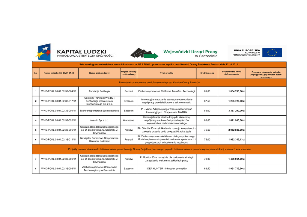 Lista rankingowa wniosków w ramach konkursu nr 1/8.1.2/IN/11 powstała w wyniku prac Komisji Oceny Projeków - Errata z dnia 12.10.2011 r. Lp. Numer wniosku KSI SIMIK 07-13 Nazwa projektodawcy Miejsce siedziby projektodawcy Tytuł projektu Średnia ocena Proponowana kwota dofinansowania Przyczyna odrzucenia wniosku (w przypadku gdy wniosek został odrzucony ) Projekty rekomendowane do dofiansowania przez Komisję Oceny Projeków 1 WND-POKL.08.01.02-32-004/11 Fundacja ProRegio Poznań Zachodniopomorska Platforma Transferu Technologii 89,00 1 064 730,00 zł 2 WND-POKL.08.01.02-32-017/11 Centrum Transferu Wiedzy i Technologii Uniwersytetu Szczecinskiego Sp. z o.o. Szczecin Innowacyjne nauczanie szansą na wzmocnienie współpracy przedsiebiorców z sektorem nauki 87,50 1 295 726,00 zł 3 WND-POKL.08.01.02-32-001/11 Zachodniopomorska Szkoła Biznesu Szczecin PI - Model Adaptacyjnego Transferu Rozwiązań Innowacyjnych i Eksperckich: MATRIX 85,00 3 387 292,00 zł 4 WND-POKL.08.01.02-32-020/11 Investin Sp. z o.o. Warszawa Komercjalizacja wiedzy drogą do skutecznej współpracy naukowców i przedsiębiorców województwa zachodniopomorskiego 85,00 1 611 900,00 zł 5 WND-POKL.08.01.02-32-005/11 Centrum Doradztwa Strategicznego s.c. D. Bieńkowska, C. Ulasiński, J. Szymańska Kraków PI - 50+ dla 50+ czyli Akademia rozwoju kompetencji z zakresie uczenia osób powyzej 50. roku Ŝycia 75,50 2 052 886,00 zł 6 WND-POKL.08.01.02-32-014/11 Nawigator Doradztwo Gospodarcze Sławomir Kośmicki Poznań 75,00 1 922 342,13 zł PI: Zachodniopomorskie liderem dialogu społecznego. Model wspierania aktywności partnerów społecznych i gospodarczych w budowaniu mozliwości adaptacyjnych przedsiębiorstw Projekty rekomendowane do dofinansowania przez Komisję Oceny Projektów, lecz nie przyjęte do dofinansowania z powodu wyczerpania alokacji w ramach w/w konkursu 7 WND-POKL.08.01.02-32-006/11 Centrum Doradztwa Strategicznego s.c. D. Bieńkowska, C. Ulasiński, J. Szymańska Kraków PI Monitor 50+ - narzędzie dla budowania strategii zarządzania wiekiem w zakładach pracy 70,00 1 466 061,00 zł 8 WND-POKL.08.01.02-32-008/11 Zachodniopomorski Uniwersytet Technologiczny w Szczecinie Szczecin IDEA HUNTER - Inkubator pomysłów 68,50 1 991 713,50 zł Projekty odrzucone 9 WND-POKL.08.01.02-32-003/11 Investin Sp. z o.o. Warszawa Interaktywny system analizy innowacji województwa zachodniopomorskiego 67,50 Wniosek nie spełnia minimum 0,00 zł punktowego w częściach 3.5 oraz 3.4, 3.6 i 3.7. 10 WND-POKL.08.01.02-32-015/11 Instytut Organizacji Przedsiębiorstw i Technik Informacyjnych InBIT Sp. z o.o. Szczecin Zachodniopomorski Klaster Turystyki Kulturowej drogą do innowacyjności regionu 63,00 Projekt nie spełnia minimum 0,00 zł punktowego w częściach 3.1, 3.5 oraz IV. 11 WND-POKL.08.01.02-32-012/11 Szczecinski Park Naukowo Technologiczny Sp. z o.o. Szczecin REAKTOR - model budowania i realizacji projektów w interdyscyplinarnych zespołach naukowych 59,00 Projekt nie spełnia minimum 0,00 zł punktowego ogółem oraz w częściach 3.1, 3.3 oraz IV. 12 WND-POKL.08.01.02-32-011/11 Forum Turystyki Regionów Szczecin Turystyczna 6 - system procesowego wsparcia i współpracy w sektorze turystyki 57,50 Projekt nie spełnia minimum 0,00 zł punktowego ogółem oraz w częściach 3.1 oraz 3.2. 13 WND-POKL.08.01.02-32-018/11 CENTRUM "OKEY" Sp. z o.o. Ostróda Zarządzanie wiekiem w MSP "SYSTEM ZW" 56,50 Projekt nie spełnia minimum 0,00 zł punktowego ogółem oraz w częściach 3.1, 3.3, 3.5 oraz IV. 14 WND-POKL.08.01.02-32-013/11 Stowarzyszenie Czas Przestrzeń ToŜsamość Szczecin 50 latkowie na start - holistyczny model wsparcia zawodowego i społecznego pracowników 50+ 50,00 15 WND-POKL.08.01.02-32-002/11 Fundacja "Forum Gryf" Szczecin Centrum Rozwoju Biznesu - szansą dla województwa zachodniopomorskiego 46,50 16 WND-POKL.08.01.02-32-007/11 WyŜsza Szkoła Pedagogiczna Towarzystwa Wiedzy Powszechnej w Warszawie Warszawa PI 50 plus Zachodniopomorskie 44,50 17 WND-POKL.08.01.02-32-010/11 Przedsiębiorstwo Organizacji WdroŜeń "AYA" Sp. z o.o. Koszalin 50 Z PLUSEM! Innowacyjny model kształcenia ustawicznego w zakresie nowoczesnych technologii informacyjnych osób powyŜej 50 roku Ŝycia 0,00 Wniosek nie spełnia kryterium 0,00 zł horyzontalnego gdyŜ jest niezgodny z zasadami pomocy publicznej Projekt nie spełnia minimum 0,00 zł punktowego ogółem oraz w częściach 3.1, 3.2, 3.3 oraz IV. Wniosek nie spełnia minimum 0,00 zł punktowego ogółem oraz w częściach 3.1, 3.2 oraz 3.3. Wniosek nie spełnia minimum 0,00 zł punktowego ogółem oraz w częściach 3.1, 3.2, 3.3 oraz IV. 18 WND-POKL.08.01.02-32-019/11 Koszalińska WyŜsza Szkoła Nauk Humanistycznych Koszalin Razem moŜemy więcej! 0,00 Wniosek nie spełnia kryteriów horyzontalnych gdyŜ jest niezgodny z zasadami pomocy publicznej oraz 0,00 zł zasadą równości szans kobiet i męŜczyzn (na podstawie standardu minimum). 19 WND-POKL.08.01.02-32-009/11 WyŜsza Szkoła Integracji Europejskiej Szczecin Mentoring 50+ jako innowacyjne wykorzystanie potencjału zawodowego dojrzałych pracowników 0,00 0,00 zł Projekt nie spełnia kryterium dostępu. 20 WND-POKL.08.01.02-32-016/11 Północna Izba Gospodarcza Szczecin Grupa Innowacyjnego Wsparcia szansą na sukces B+R 0,00 0,00 zł Projekt nie spełnia kryterium dostępu.