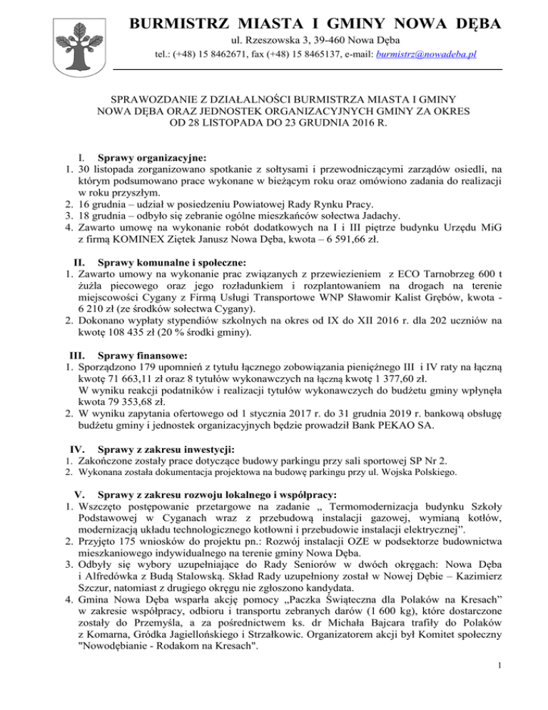BURMISTRZ MIASTA I GMINY NOWA DĘBA ul. Rzeszowska 3, 39-460 Nowa Dęba tel.: (+48) 15 8462671, fax (+48) 15 8465137, e-mail: [email protected] SPRAWOZDANIE Z DZIAŁALNOŚCI BURMISTRZA MIASTA I GMINY NOWA DĘBA ORAZ JEDNOSTEK ORGANIZACYJNYCH GMINY ZA OKRES OD 28 LISTOPADA DO 23 GRUDNIA 2016 R. 1. 2. 3. 4. I. Sprawy organizacyjne: 30 listopada zorganizowano spotkanie z sołtysami i przewodniczącymi zarządów osiedli, na którym podsumowano prace wykonane w bieżącym roku oraz omówiono zadania do realizacji w roku przyszłym. 16 grudnia – udział w posiedzeniu Powiatowej Rady Rynku Pracy. 18 grudnia – odbyło się zebranie ogólne mieszkańców sołectwa Jadachy. Zawarto umowę na wykonanie robót dodatkowych na I i III piętrze budynku Urzędu MiG z firmą KOMINEX Ziętek Janusz Nowa Dęba, kwota – 6 591,66 zł. II. Sprawy komunalne i społeczne: 1. Zawarto umowy na wykonanie prac związanych z przewiezieniem z ECO Tarnobrzeg 600 t żużla piecowego oraz jego rozładunkiem i rozplantowaniem na drogach na terenie miejscowości Cygany z Firmą Usługi Transportowe WNP Sławomir Kalist Grębów, kwota 6 210 zł (ze środków sołectwa Cygany). 2. Dokonano wypłaty stypendiów szkolnych na okres od IX do XII 2016 r. dla 202 uczniów na kwotę 108 435 zł (20 % środki gminy). III. Sprawy finansowe: 1. Sporządzono 179 upomnień z tytułu łącznego zobowiązania pieniężnego III i IV raty na łączną kwotę 71 663,11 zł oraz 8 tytułów wykonawczych na łączną kwotę 1 377,60 zł. W wyniku reakcji podatników i realizacji tytułów wykonawczych do budżetu gminy wpłynęła kwota 79 353,68 zł. 2. W wyniku zapytania ofertowego od 1 stycznia 2017 r. do 31 grudnia 2019 r. bankową obsługę budżetu gminy i jednostek organizacyjnych będzie prowadził Bank PEKAO SA. IV. Sprawy z zakresu inwestycji: 1. Zakończone zostały prace dotyczące budowy parkingu przy sali sportowej SP Nr 2. 2. Wykonana została dokumentacja projektowa na budowę parkingu przy ul. Wojska Polskiego. V. Sprawy z zakresu rozwoju lokalnego i współpracy: 1. Wszczęto postępowanie przetargowe na zadanie „ Termomodernizacja budynku Szkoły Podstawowej w Cyganach wraz z przebudową instalacji gazowej, wymianą kotłów, modernizacją układu technologicznego kotłowni i przebudowie instalacji elektrycznej”. 2. Przyjęto 175 wniosków do projektu pn.: Rozwój instalacji OZE w podsektorze budownictwa mieszkaniowego indywidualnego na terenie gminy Nowa Dęba. 3. Odbyły się wybory uzupełniające do Rady Seniorów w dwóch okręgach: Nowa Dęba i Alfredówka z Budą Stalowską. Skład Rady uzupełniony został w Nowej Dębie – Kazimierz Szczur, natomiast z drugiego okręgu nie zgłoszono kandydata. 4. Gmina Nowa Dęba wsparła akcję pomocy „Paczka Świąteczna dla Polaków na Kresach” w zakresie współpracy, odbioru i transportu zebranych darów (1 600 kg), które dostarczone zostały do Przemyśla, a za pośrednictwem ks. dr Michała Bajcara trafiły do Polaków z Komarna, Gródka Jagiellońskiego i Strzałkowic. Organizatorem akcji był Komitet społeczny "Nowodębianie - Rodakom na Kresach". 1 BURMISTRZ MIASTA I GMINY NOWA DĘBA ul. Rzeszowska 3, 39-460 Nowa Dęba tel.: (+48) 15 8462671, fax (+48) 15 8465137, e-mail: [email protected] VI. Sprawy z zakresu melioracji: 1. Zostały zawarte umowy z Zakładem Usług Leśnych i Melioracyjnych Lucjan Paterek Jamnica na: „Remont rowu i zjazdów przy drodze gminnej nr 1 00 338 R Szubienice w km 0+1050+318 na działce nr ewid. 465 obręb Tarnowska Wola, kwota - 29 114,72 zł oraz na „Remont przepustu na działce nr ewid. 2622/4 obręb Chmielów, kwota - 13 877,36 zł. 2. Zawarto umowę ze Zbigniewem Kotulskim Tarnobrzeg na usługę nadzoru inwestorskiego przy realizacji zadania pn. „Remont rowu i zjazdów przy drodze gminnej nr 1 00 338 R Szubienice w km 0+105-0+318 na działce nr ewid. 465 obręb Tarnowska Wola”, kwota – 1 400 zł. VII. Sprawy z zakresu bezpieczeństwa publicznego i profilaktyki: 1. W okresie sprawozdawczym Straż Miejska przeprowadziła 68 interwencji, ujawniono 54 sprawców wykroczeń, 8 sprawców ukarano mandatami karnymi na łączną kwotę 700 zł, 45 sprawców pouczono, do sądu rejonowego skierowano 1 wniosek o ukaranie. 2. Funkcjonariusze przeprowadzili 10 wspólnych służb z policją. 3. 16 grudnia odbyło się posiedzenie Miejsko - Gminnej Komisji Rozwiązywania Problemów Alkoholowych, Komisja zaopiniowała 4 wnioski i wydała 10 postanowień w sprawie sprzedaży napojów alkoholowych. Na posiedzenie wezwano 2 osoby w celu przeprowadzenia z nimi rozmów motywacyjnych. VIII. Sprawy obywatelskie, obrona cywilna: 1. 9 grudnia przeprowadzono trening łączności Powiatowej Radiowej Sieci Zarządzania Kryzysowego. 2. Sporządzono oraz uzgodniono z Wojskową Komendą Uzupełnień w Nisku wykaz osób podlegających obowiązkowi świadczeń osobistych. 3. 16 grudnia - udział w odprawie rocznej komendantów gminnych oraz naczelników OSP z powiatu tarnobrzeskiego poświęconej aktualnemu stanowi bezpieczeństwa przeciwpożarowego na terenie powiatu tarnobrzeskiego oraz planom szkoleniowym na rok 2017. IX. Sprawy z zakresu pomocy społecznej: 1. W ramach działalności Miejsko-Gminnego Ośrodka Pomocy Społecznej: 1) 7 grudnia zorganizowano imprezę mikołajkową, w której uczestniczyło 52 dzieci, w tym dzieci uczęszczające na zajęcia świetlicowe Klubu Aktywności „Emka”. Dzięki przeprowadzonej przez pracowników MGOPS akcji „Pomóż Dzieciom Przetrwać Zimę”, każde dziecko otrzymało prezent - niespodziankę. Ponadto 19 rodzin otrzymało paczki żywnościowe, przygotowane z artykułów zebranych podczas w/w akcji. 2) w wyniku przetargu nieograniczonego zawarto umowę na zadanie „Dożywianie prowadzone przez MGOPS w Nowej Dębie na terenie Miasta i Gminy Nowa Dęba w okresie od 1 stycznia do 31 grudnia 2017 r. z P.H.U. „Oliwier” Anna Głowacka Kielce, cena za 1 posiłek - 3,95 zł, 3) w wyniku zapytania 