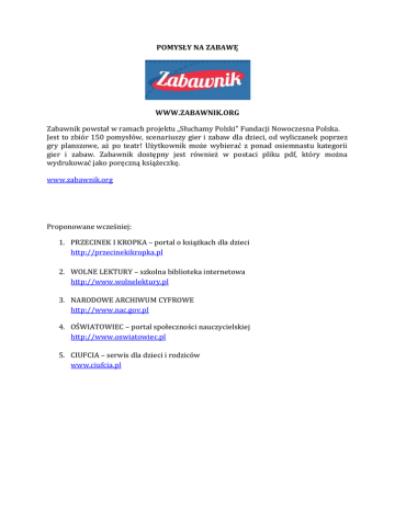 POMYSŁY NA ZABAWĘ WWW.ZABAWNIK.ORG Zabawnik powstał w ramach projektu „Słuchamy Polski” Fundacji Nowoczesna Polska. Jest to zbiór 150 pomysłów, scenariuszy gier i zabaw dla dzieci, od wyliczanek poprzez gry planszowe, aż po teatr! Użytkownik może wybierać z ponad osiemnastu kategorii gier i zabaw. Zabawnik dostępny jest również w postaci pliku pdf, który można wydrukować jako poręczną książeczkę. www.zabawnik.org Proponowane wcześniej: 1. PRZECINEK I KROPKA – portal o książkach dla dzieci http://przecinekikropka.pl 2. WOLNE LEKTURY – szkolna biblioteka internetowa http://www.wolnelektury.pl 3. NARODOWE ARCHIWUM CYFROWE http://www.nac.gov.pl 4. OŚWIATOWIEC – portal społeczności nauczycielskiej http://www.oswiatowiec.pl 5. CIUFCIA – serwis dla dzieci i rodziców www.ciufcia.pl