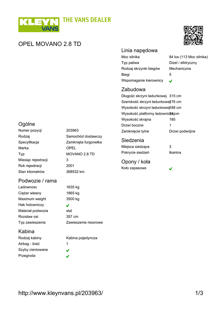 http://www.kleynvans.pl/203963/ 1/3 OPEL MOVANO 2.8 TD