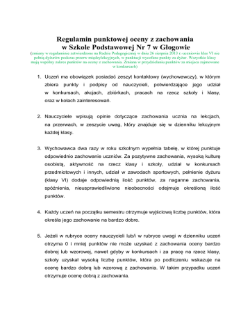 Regulamin punktowej oceny z zachowania w Szkole Podstawowej Nr 7 w Głogowie (zmiany w regulaminie zatwierdzone na Radzie Pedagogicznej w dniu 26 sierpnia 2013 r.-uczniowie klas VI nie pełnią dyżurów podczas przerw międzylekcyjnych, w punktacji wycofane punkty za dyżur. Wszystkie klasy mają wspólny zakres punktów na oceny z zachowania. Zmiana w przydzielaniu punktów za miejsca zajmowane w konkursach) 1. Uczeń ma obowiązek posiadać zeszyt kontaktowy (wychowawczy), w którym zbiera punkty i podpisy od nauczycieli, potwierdzające jego udział w konkursach, akcjach, zbiórkach, pracach na rzecz szkoły i klasy, oraz w kołach zainteresowań. 2. Nauczyciele wpisują opinie dotyczące zachowania ucznia na lekcjach, na przerwach, w zeszycie uwag, który znajduje się w dzienniku lekcyjnym każdej klasy. 3. Wychowawca dwa razy w roku szkolnym wypełnia tabelę, w której punktuje odpowiednio zachowanie uczniów. Za pozytywne zachowania, wysoką kulturę osobistą, aktywność na rzecz klasy i szkoły, udział w konkursach przedmiotowych i innych, udział w zawodach sportowych, pełnienie dyżuru (klasy VI) dodaje odpowiednią ilość punktów, za naganne zachowania, spóźnienia, nieusprawiedliwione nieobecności odejmuje określoną ilość punktów. 4. Każdy uczeń na początku semestru otrzymuje wyjściową liczbę punktów, która określa jego zachowanie na bardzo dobre. 5. Jeżeli w rubryce oceny nauczycieli lub/i w rubryce uwagi w dzienniku uczeń otrzyma 0 i mniej punktów nie może uzyskać z zachowania oceny bardzo dobrej lub wzorowej, nawet gdyby w konkursach i za pracę na rzecz klasy, szkoły uzyskał wysoką liczbę punktów, która po podliczeniu wskazuje na ocenę bardzo dobrą lub wzorową z zachowania. W takim przypadku uczeń otrzymuje ocenę dobrą z zachowania. 6. Wychowawca klasy może zwrócić się do dyrektora szkoły z wnioskiem o powołanie zespołu wychowawczego w przypadku, gdy uczeń otrzymał bardzo dużo nagannych uwag dotyczących zachowania, a zebrał tyle punktów za udział w konkursach i pracę na rzecz klasy szkoły, która wskazuje na ocenę wzorową, bardzo dobrą lub dobrą. Zespół wychowawczy ustali ocenę z zachowania po analizie uwag nagannych, jakiego rodzaju zachowania dotyczą. Zasady przydzielania i odejmowania punktów-tabela opis liczba punktów punkty początkowe 50pkt Oceny wystawiane przez nauczycieli za zachowanie na lekcji w semestrze (w tabeli liczba punktów wyjściowa 12pkt) wszystkie oceny wzorowe 12pkt oceny wzorowe i bardzo dobre 10pkt za każde 2 oceny dobre -1pkt za każdą ocenę poprawną - 1pkt za każdą ocenę nieodpowiednią -2pkt za każdą ocenę naganną -5pkt wszystkie nieobecności usprawiedliwione 10pkt za każdą godzinę nieusprawiedliwioną -1pkt Nieobecności (w tabeli liczba punktów wyjściowa 10pkt) Spóźnienia (w tabeli liczba punktów wyjściowa 10pkt) Zachowania naganne w zeszycie uwag w dzienniku (w tabeli liczba punktów wyjściowa 20pkt) brak spóźnień 10pkt za każde spóźnienie -1pkt nie ma uwag nagannych 20pkt przykłady zachowań nagannych: Odejmowana liczba punktów -rozmowy na lekcjach, -niewykonywanie polecenia nauczyciela, -niewypełnienie obowiązków dyżurnego, -zaśmiecanie klasy, korytarzy, - krzyki, i inne tego typu. -wulgarne słownictwo, -ubliżanie kolegom, - przebywanie notoryczne na innym piętrze na przerwach, niż wyznaczone dla klasy, i inne tego typu. -aroganckie zachowanie w stosunku do nauczycieli, pracowników szkoły, -udział w bójce-prowokowanie do niej, -niszczenie mienia szkolnego, -kradzieże, -palenie papierosów, i inne tego typu. - 1pkt -2pkt od -5pkt do -10pkt -nagana dyrektora szkoły od-11 do -20pkt Udział w konkursach szkolnych ZAWODY SPORTOWE KONKURSY PRZEDMIOTOWE I INNE Etap szkolny I miejsce II miejsce III miejsce IV miejsce pozostałe-udział punktacja 5pkt 4pkt 3pkt 2pkt 1pkt Rejon, województwo I miejsce II miejsce III miejsce IV-X miejsce pozostałe-udział 5pkt 4pkt 3pkt 2pkt 1pkt Ogólnopolskie, międzynarodowe I-III miejsce IV-VII miejsce VII-X miejsce XI-XV miejsce pozostałe, udział 5pkt 4pkt 3pkt 2pkt 1pkt ZAWODY SPORTOWE punktacja Rozgrywki międzyklasowe, międzyszkolne I miejsce II miejsce III miejsce pozostałe, udział 4pkt 3pkt 2pt 1pkt Rejon, województwo I miejsce II miejsce III miejsce pozostałe, udział 4pkt 3pkt 2pt 1pkt Ogólnopolskie, międzynarodowe I miejsce II miejsce III miejsce IV miejsce pozostałe, udział 5pkt 4pkt 3pkt 2pkt 1pkt Praca na rzecz klasy, szkoły (nauczyciele wpisują punkty do zeszytu kontaktowego, oceniając zaangażowanie ucznia) -pełnienie funkcji przewodniczącego klasy, skarbnika. -praca w samorządzie szkolnym, -pomoc w organizowaniu imprez szkolnych. -podlewanie kwiatów w sali, -wykonanie gazetki, -organizowanie uroczystości klasowych, -wzbogacanie wyposażenia pracowni. -praca w kołach zainteresowań, w bibliotece szkolnej, SKS. 0-5pkt 0-5pkt 0-5pkt 0-5pkt Wzór tabeli dla wychowawcy klasy i zakres punktów na daną ocenę Klasy IV, V, VI - początek semestru l.p. Nazwisko i imię ucznia 1. 2. 3. 4. pkt. pocz. oceny nauczycieli uwagi w dzienniku 50 50 50 50 12 12 12 12 20 20 20 20 wzorowe 121 pkt- i więcej bardzo dobre 120-95 pkt dobre 94-80 pkt poprawne 79-50 pkt nieodpowiednie 49-21 pkt naganne udział w konkursach 20 i mniej pkt praca na rzecz klasy szkoły spóźnienia Usprawiedli wione nieobecności Suma pkt Ocena zachowania 10 10 10 10 10 10 10 10 102 102 102 102 bardzo dobre bardzo dobre bardzo dobre bardzo dobre