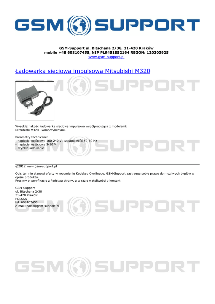 GSM-Support ul. Bitschana 2/38, 31-420 Kraków mobile +48 608107455, NIP PL9451852164 REGON: 120203925 www.gsm-support.pl Ładowarka sieciowa impulsowa Mitsubishi M320 Wysokiej jakości ładowarka sieciowa impulsowa współpracująca z modelami: Mitsubishi M320 i kompatybilnymi. Parametry techniczne: - napięcie wejściowe 100-240 V, częstotliwość 50-60 Hz - napięcie wyjściowe 5-10 V - szybkie ładowanie ©2012 www.gsm-support.pl Opis ten nie stanowi oferty w rozumieniu Kodeksu Cywilnego. GSM-Support zastrzega sobie prawo do możliwych błędów w opisie produktu. Prosimy o weryfikację z Państwa strony, a w razie wątpliwości o kontakt. GSM-Support ul. Bitschana 2/38 31-420 Kraków POLSKA tel. 608107455 e-mail: [email protected] Powered by TCPDF (www.tcpdf.org)