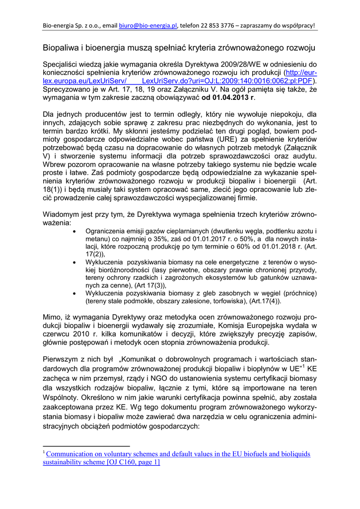 Bio-energia Sp. z o.o., email [email protected], telefon 22 853 3776 – zapraszamy do współpracy! Biopaliwa i bioenergia muszą spełniać kryteria zrównoważonego rozwoju Specjaliści wiedzą jakie wymagania określa Dyrektywa 2009/28/WE w odniesieniu do konieczności spełnienia kryteriów zrównoważonego rozwoju ich produkcji (http://eurlex.europa.eu/LexUriServ/ LexUriServ.do?uri=OJ:L:2009:140:0016:0062:pl:PDF). Sprecyzowano je w Art. 17, 18, 19 oraz Załączniku V. Na ogół pamięta się także, że wymagania w tym zakresie zaczną obowiązywać od 01.04.2013 r. Dla jednych producentów jest to termin odległy, który nie wywołuje niepokoju, dla innych, zdających sobie sprawę z zakresu prac niezbędnych do wykonania, jest to termin bardzo krótki. My skłonni jesteśmy podzielać ten drugi pogląd, bowiem podmioty gospodarcze odpowiedzialne wobec państwa (URE) za spełnienie kryteriów potrzebować będą czasu na dopracowanie do własnych potrzeb metodyk (Załącznik V) i stworzenie systemu informacji dla potrzeb sprawozdawczości oraz audytu. Wbrew pozorom opracowanie na własne potrzeby takiego systemu nie będzie wcale proste i łatwe. Zaś podmioty gospodarcze będą odpowiedzialne za wykazanie spełnienia kryteriów zrównoważonego rozwoju w produkcji biopaliw i bioenergii (Art. 18(1)) i będą musiały taki system opracować same, zlecić jego opracowanie lub zlecić prowadzenie całej sprawozdawczości wyspecjalizowanej firmie. Wiadomym jest przy tym, że Dyrektywa wymaga spełnienia trzech kryteriów zrównoważenia: Ograniczenia emisji gazów cieplarnianych (dwutlenku węgla, podtlenku azotu i metanu) co najmniej o 35%, zaś od 01.01.2017 r. o 50%, a dla nowych instalacji, które rozpoczną produkcję po tym terminie o 60% od 01.01.2018 r. (Art. 17(2)), Wykluczenia pozyskiwania biomasy na cele energetyczne z terenów o wysokiej bioróżnorodności (lasy pierwotne, obszary prawnie chronionej przyrody, tereny ochrony rzadkich i zagrożonych ekosystemów lub gatunków uznawanych za cenne), (Art 17(3)), Wykluczenia pozyskiwania biomasy z gleb zasobnych w węgiel (próchnicę) (tereny stale podmokłe, obszary zalesione, torfowiska), (Art.17(4)). Mimo, iż wymagania Dyrektywy oraz metodyka ocen zrównoważonego rozwoju produkcji biopaliw i bioenergii wydawały się zrozumiałe, Komisja Europejska wydała w czerwcu 2010 r. kilka komunikatów i decyzji, które zwiększyły precyzję zapisów, głównie postępowań i metodyk ocen stopnia zrównoważenia produkcji. Pierwszym z nich był „Komunikat o dobrowolnych programach i wartościach standardowych dla programów zrównoważonej produkcji biopaliw i biopłynów w UE”1 KE zachęca w nim przemysł, rządy i NGO do ustanowienia systemu certyfikacji biomasy dla wszystkich rodzajów biopaliw, łącznie z tymi, które są importowane na teren Wspólnoty. Określono w nim jakie warunki certyfikacja powinna spełnić, aby została zaakceptowana przez KE. Wg tego dokumentu program zrównoważonego wykorzystania biomasy i biopaliw może zawierać dwa narzędzia w celu ograniczenia administracyjnych obciążeń podmiotów gospodarczych: Communication on voluntary schemes and default values in the EU biofuels and bioliquids sustainability scheme [OJ C160, page 1] 1 Bio-energia Sp. z o.o., email [email protected], telefon 22 853 3776 – zapraszamy do współpracy! 1. Opcję „dobrowolnych programów” lub „dwustronnych oraz wielostronnych umów”, których celem jest wykazanie zgodności z niektórymi lub wszystkimi kryteriami zrównoważonej produkcji. 2. Opcję stosowania „standardowych ograniczeń emisji gazów cieplarnianych” określonych w Załączniku V Dyrektywy w celu wykazania zgodności z kryteriami zrównoważenia w zakresie ograniczenia emisji gazów cieplarnianych. W przypadku opcji pierwszej podmiot gospodarczy powinien wykazać odpowiedzialnemu urzędowi w kraju, że kryteria zrównoważenia odnoszące się do ograniczenia emisji gazów cieplarnianych, nie pozyskiwania biomasy z obszarów o wysokiej bioróżnorodności oraz obszarów prawnie chronionej przyrody zostały osiągnięte. Może tego dokonać na trzech drogach: Poprzez dostarczenie odpowiedzialnemu urzędowi danych zgodnych z wymaganiami określonymi w prawodawstwie krajowym, Poprzez przystąpienie do „dobrowolnego programu”, który KE rozpatrzy i zaakceptuje, Poprzez przestrzeganie ustaleń umów dwu- lub wielostronnych zawartych przez UE z krajami trzecimi i które KE przyjęła w tym celu. Tak więc w tej części dokument doprecyzował jedynie odpowiedzialność podmiotu gospodarczego za przygotowanie potrzebnych danych lub opracowanie stosownego programu. Przed przystąpieniem do „dobrowolnego programu” zakład musi być poddany audytowi zewnętrznemu, który określi czy kryteria zrównoważenia są osiągane i w jakim stopniu. Bardzo duża zachętą do wybrania opcji drugiej jest uproszczenie procedur w zakresie wykazywania ograniczeń w emisji gazów cieplarnianych. Dyrektywa (Art. 19(1,2)) z małymi wyjątkami nakładała na podmiot gospodarczy obowiązek liczenia rzeczywistych ograniczeń emisji. Opcja druga dopuszcza stosowanie dla poszczególnych ścieżek produkcji standardowych ograniczeń emisji (rys. 1). Będą one poszerzane przez KE o nowe szlaki i aktualizowane dla podanych w Dyrektywie co dwa lata poczynając od 2010 r. Najbliższy raport w tej sprawie spodziewany jest w 2012 r. Ponieważ jednak nowelizacja może w razie potrzeby być dokonywana częściej należy śledzić nowości w tym zakresie w witrynie JRC (http://re.jrc.ec.europa.eu/biof/html/input_data_ghg.htm). Opcja ta zwalnia więc podmioty gospodarcze w pewnych przypadkach ze żmudnych i wcale nie prostych obliczeń rzeczywistych ograniczeń emisji (rys. 1). Drugim istotnym dla podmiotów gospodarczych dokumentem jest ”Komunikat o praktycznym wprowadzeniu w życie programów zrównoważenia dla biopaliw i biopłynów produkowanych w UE oraz zasad obli