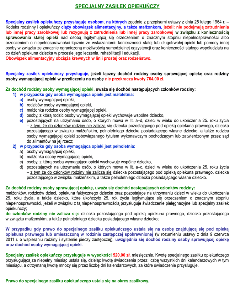 SPECJALNY ZASIŁEK OPIEKUŃCZY Specjalny zasiłek opiekuńczy przysługuje osobom, na których zgodnie z przepisami ustawy z dnia 25 lutego 1964 r. – Kodeks rodzinny i opiekuńczy ciąży obowiązek alimentacyjny, a także małżonkom, jeżeli: nie podejmują zatrudnienia lub innej pracy zarobkowej lub rezygnują z zatrudnienia lub innej pracy zarobkowej w związku z koniecznością sprawowania stałej opieki nad osobą legitymującą się orzeczeniem o znacznym stopniu niepełnosprawności albo orzeczeniem o niepełnosprawności łącznie ze wskazaniami: konieczności stałej lub długotrwałej opieki lub pomocy innej osoby w związku ze znacznie ograniczoną możliwością samodzielnej egzystencji oraz konieczności stałego współudziału na co dzień opiekuna dziecka w procesie jego leczenia, rehabilitacji i edukacji. Obowiązek alimentacyjny obciąża krewnych w linii prostej oraz rodzeństwo. Specjalny zasiłek opiekuńczy przysługuje, jeżeli łączny dochód rodziny osoby sprawującej opiekę oraz rodziny osoby wymagającej opieki w przeliczeniu na osobę nie przekracza kwoty 764,00 zł. Za dochód rodziny osoby wymagającej opieki, uważa się dochód następujących członków rodziny: 1) w przypadku gdy osoba wymagająca opieki jest małoletnia: a) osoby wymagającej opieki, b) rodziców osoby wymagającej opieki, c) małżonka rodzica osoby wymagającej opieki, d) osoby, z którą rodzic osoby wymagającej opieki wychowuje wspólne dziecko, e) pozostających na utrzymaniu osób, o których mowa w lit. a–d, dzieci w wieku do ukończenia 25. roku życia – z tym, że do członków rodziny nie zalicza się dziecka pozostającego pod opieką opiekuna prawnego, dziecka pozostającego w związku małżeńskim, pełnoletniego dziecka posiadającego własne dziecko, a także rodzica osoby wymagającej opieki zobowiązanego tytułem wykonawczym pochodzącym lub zatwierdzonym przez sąd do alimentów na jej rzecz; 2) w przypadku gdy osoba wymagająca opieki jest pełnoletnia: a) osoby wymagającej opieki, b) małżonka osoby wymagającej opieki, c) osoby, z którą osoba wymagająca opieki wychowuje wspólne dziecko, d) pozostających na utrzymaniu osób, o których mowa w lit. a–c, dzieci w wieku do ukończenia 25. roku życia – z tym że do członków rodziny nie zalicza się dziecka pozostającego pod opieką opiekuna prawnego, dziecka pozostającego w związku małżeńskim, a także pełnoletniego dziecka posiadającego własne dziecko. Za dochód rodziny osoby sprawującej opiekę, uważa się dochód następujących członków rodziny: małżonków, rodziców dzieci, opiekuna faktycznego dziecka oraz pozostające na utrzymaniu dzieci w wieku do ukończenia 25. roku życia, a także dziecko, które ukończyło 25. rok życia legitymujące się orzeczeniem o znacznym stopniu niepełnosprawności, jeżeli w związku z tą niepełnosprawnością przysługuje świadczenie pielęgnacyjne lub specjalny zasiłek opiekuńczy; do członków rodziny nie zalicza się: dziecka pozostającego pod opieką opiekuna prawnego, dziecka pozostającego w związku małżeńskim, a także pełnoletniego dziecka posiadającego własne dziecko; W przypadku gdy prawo do specjalnego zasiłku opiekuńczego ustala się na osobę znajdującą się pod opieką opiekuna prawnego lub umieszczoną w rodzinie zastępczej spokrewnionej (w rozumieniu ustawy z dnia 9 czerwca 2011 r. o wspieraniu rodziny i systemie pieczy zastępczej), uwzględnia się dochód rodziny osoby sprawującej opiekę oraz dochód osoby wymagającej opieki. Specjalny zasiłek opiekuńczy przysługuje w wysokości 520,00 zł. miesięcznie. Kwotę specjalnego zasiłku opiekuńczego przysługującą za niepełny miesiąc ustala się, dzieląc kwotę świadczenia przez liczbę wszystkich dni kalendarzowych w tym miesiącu, a otrzymaną kwotę mnoży się przez liczbę dni kalendarzowych, za które świadczenie przysługuje. Prawo do specjalnego zasiłku opiekuńczego ustala się na okres zasiłkowy. W przypadku, gdy o świadczenie to ubiegają się rolnicy, małżonkowie rolników bądź domownicy, świadczenie przysługuje odpowiednio: 1) rolnikom w przypadku zaprzestania prowadzenia przez nich gospodarstwa rolnego; 2) małżonkom rolników lub domownikom w przypadku zaprzestania prowadzenia przez nich gospodarstwa rolnego albo wykonywania przez nich pracy w gospodarstwie rolnym. Zaprzestanie prowadzenia gospodarstwa rolnego lub zaprzestanie wykonywania pracy w gospodarstwie rolnym, o których mowa w pkt. 1, potwierdza się stosownym oświadczeniem złożonym pod rygorem odpowiedzialności karnej za składanie fałszywych zeznań. Składający oświadczenie jest obowiązany do zawarcia w nim klauzuli następującej treści: „Jestem świadomy odpowiedzialności karnej za złożenie fałszywego oświadczenia.”. Klauzula ta zastępuje pouczenie organu o odpowiedzialności karnej za składanie fałszywych zeznań. Specjalny zasiłek opiekuńczy nie przysługuje, jeżeli: 1) osoba sprawująca opiekę: a) ma ustalone prawo do emerytury, renty, renty rodzinnej z tytułu śmierci małżonka przyznanej w przypadku zbiegu prawa do renty rodzinnej i innego świadczenia emerytalno-rentowego, renty socjalnej, zasiłku stałego, nauczycielskiego świadczenia kompensacyjnego, zasiłku przedemerytalnego lub świadczenia przedemerytalnego, b) ma ustalone prawo do specjalnego zasiłku opiekuńczego, świadczenia pielęgnacyjnego lub zasiłku dla opiekuna, c) legitymuje się orzeczeniem o znacznym stopniu niepełnosprawności; 2) osoba wymagająca opieki została umieszczona: w rodzinie zastępczej, z wyjątkiem rodziny zastępczej spokrewnionej, w rodzinnym domu dziecka albo, w związku z koniecznością kształcenia, rewalidacji lub rehabilitacji, w placówce zapewniającej całodobową opiekę, w tym w specjalnym ośrodku szkolno-wychowawczym, z wyjątkiem podmiotu wykonującego działalność leczniczą, i korzysta w niej z całodobowej opieki