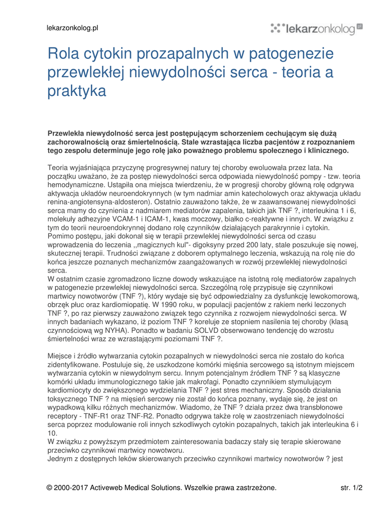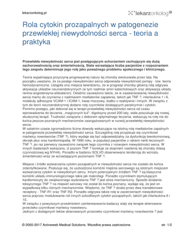 lekarzonkolog.pl Rola cytokin prozapalnych w patogenezie przewlekłej niewydolności serca - teoria a praktyka Przewlekła niewydolność serca jest postępującym schorzeniem cechującym się dużą zachorowalnością oraz śmiertelnością. Stale wzrastająca liczba pacjentów z rozpoznaniem tego zespołu determinuje jego rolę jako poważnego problemu społecznego i klinicznego. Teoria wyjaśniająca przyczynę progresywnej natury tej choroby ewoluowała przez lata. Na początku uważano, że za postęp niewydolności serca odpowiada niewydolność pompy - tzw. teoria hemodynamiczne. Ustąpiła ona miejsca twierdzeniu, że w progresji choroby główną rolę odgrywa aktywacja układów neuroendokrynnych (w tym nadmiar amin katecholowych oraz aktywacja układu renina-angiotensyna-aldosteron). Ostatnio zauważono także, że w zaawansowanej niewydolności serca mamy do czynienia z nadmiarem mediatorów zapalenia, takich jak TNF ?, interleukina 1 i 6, molekuły adhezyjne VCAM-1 i ICAM-1, kwas moczowy, białko c-reaktywne i innych. W związku z tym do teorii neuroendokrynnej dodano rolę czynników działających parakrynnie i cytokin. Pomimo postępu, jaki dokonał się w terapii przewlekłej niewydolności serca od czasu wprowadzenia do leczenia ,,magicznych kul"- digoksyny przed 200 laty, stale poszukuje się nowej, skutecznej terapii. Trudności związane z doborem optymalnego leczenia, wskazują na rolę nie do końca jeszcze poznanych mechanizmów zaangażowanych w rozwój przewlekłej niewydolności serca. W ostatnim czasie zgromadzono liczne dowody wskazujące na istotną rolę mediatorów zapalnych w patogenezie przewlekłej niewydolności serca. Szczególną rolę przypisuje się czynnikowi martwicy nowotworów (TNF ?), który wydaje się być odpowiedzialny za dysfunkcję lewokomorową, obrzęk płuc oraz kardiomiopatię. W 1990 roku, w populacji pacjentów z rakiem nerki leczonych TNF ?, po raz pierwszy zauważono związek tego czynnika z rozwojem niewydolności serca. W innych badaniach wykazano, iż poziom TNF ? koreluje ze stopniem nasilenia tej choroby (klasą czynnościową wg NYHA). Ponadto w badaniu SOLVD obserwowano tendencję do wzrostu śmiertelności wraz ze wzrastającymi poziomami TNF ?. Miejsce i źródło wytwarzania cytokin pozapalnych w niewydolności serca nie zostało do końca zidentyfikowane. Postuluje się, że uszkodzone komórki mięśnia sercowego są istotnym miejscem wytwarzania cytokin w niewydolnym sercu. Innym potencjalnym źródłem TNF ? są klasyczne komórki układu immunologicznego takie jak makrofagi. Ponadto czynnikiem stymulującym kardiomiocyty do zwiększonego wydzielania TNF ? jest stres mechaniczny. Sposób działania toksycznego TNF ? na mięsień sercowy nie został do końca poznany, wydaje się, że jest on wypadkową kilku różnych mechanizmów. Wiadomo, że TNF ? działa przez dwa transbłonowe receptory - TNF-R1 oraz TNF-R2. Ponadto odgrywa także rolę w zaostrzeniach niewydolności serca poprzez modulowanie roli innych szkodliwych cytokin pozapalnych, takich jak interleukina 6 i 10. W związku z powyższym przedmiotem zainteresowania badaczy stały się terapie skierowane przeciwko czynnikowi martwicy nowotworu. Jednym z dostępnych leków skierowanych przeciwko czynnikowi martwicy nowotworów ? jest © 2000-2017 Activeweb Medical Solutions. Wszelkie prawa zastrzeżone. str. 1/2 lekarzonkolog.pl etanercept - rozpuszczalny receptor dla TNF?. Z zastosowaniem tego leku przeprowadzono dwa podobnie zaprojektowane podwójnie ślepe, randomizowane, wieloośrodkowe badania kliniczne. Były to badanie RECOVER (Research into Etanercept CytOkine antagonism in VEntriculaR dysfunction) oraz RENAISSANCE (North American Strategy to Study AntagoNism of CytokinEs). Badania te różniły się jedynie w sposobie dawkowania etanerceptu. W badaniu RECOVER pacjenci zostali zrandomizowani do grupy placebo oraz otrzymującej lek w dawce 25mg raz lub dwa razy w tygodniu, natomiast w badaniu RENAISSANCE chorych zrandomizowano do grupy placebo oraz otrzymujących lek w dawce jak w badaniu RECOVER dwa lub trzy razy w tygodniu. Łącznie do obu tych badań włączono 2048 pacjentów z niewydolnością serca. W żadnym z tych badań nie wykazano korzyści u chorych z niewydolnością serca z zastosowania etanerceptu, pomimo obiecujących wyników badań wstępnych, sugerujących terapeutyczną rolę czynników działających antagonistycznie w stosunku do TNF ?. Ten brak korzyści próbuje się tłumaczyć w różny sposób. Po pierwsze mediatory zapalenia mogą jednak nie odgrywać znaczącej roli w patogenezie niewydolności serca, po drugie zastosowane dawki leków mogły być niewystarczające, aby skutecznie zneutralizować nadmiar TNF ?. Problemem w zastosowaniu tego leku jest konieczność podawania go parenteralnie, a dodatkowo, paradoksalnie, powtarzane wlewy etanerceptu mogą skutkować wzrostem stężenia TNF ?. Ponadto skupienie się w opisanych badaniach tylko na czynniku wzrostu fibroblastów nie wyeliminowało skutecznie innych, istotnych w patogenezie niewydolności serca, mediatorów zapalenia (np. interleukiny 1, 6). Na uwagę zasługuje także badanie ATTACH (Anti-TNF-?in Congestive Heart Failure), w którym oceniano wpływ leczenia infliximabem w grupie 150 pacjentów. W badaniu tym, po 28 tygodniach leczenia, obserwowano znamiennie częściej przypadki zgonów i hospitalizacji z powodu niewydolności serca w grupie chorych leczonych infliximabem w dawce 10mg/kg. Pomimo niekorzystnych wyników opisanych powyżej badań, nie można wykluczyć, że modulowanie poziomu cytokin może zostać jednym ze schematów leczenia chorych z niewydolnością serca. Być może obranie za cel terapii tylko jednego elementu kaskady cytokin prozapalnych nie daje korzyści w chorobie o tak złożonej patogenezie jak przewlekła niewydolność serca. Ponadto, nie w każdej jednostce chorobowej, w której patogenezie istotną rolę odgrywa TNF ?, terapia sk