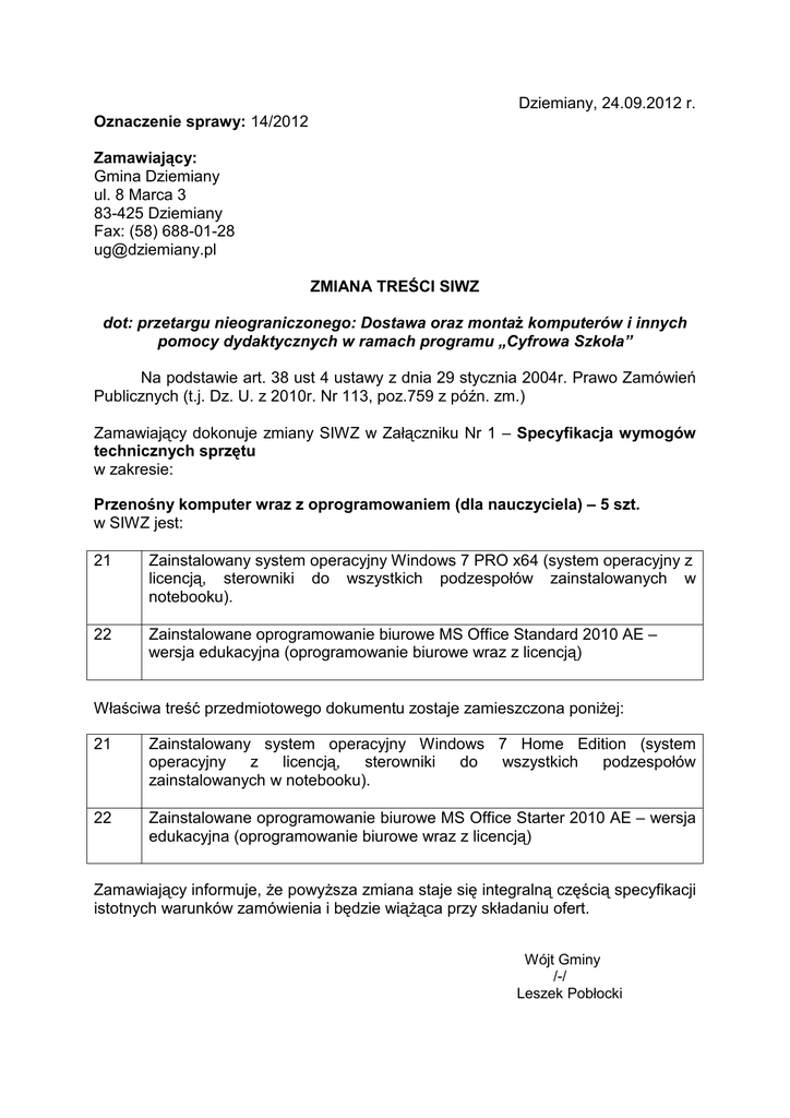 Dziemiany, 24.09.2012 r. Oznaczenie sprawy: 14/2012 Zamawiający: Gmina Dziemiany ul. 8 Marca 3 83-425 Dziemiany Fax: (58) 688-01-28 [email protected] ZMIANA TREŚCI SIWZ dot: przetargu nieograniczonego: Dostawa oraz montaż komputerów i innych pomocy dydaktycznych w ramach programu „Cyfrowa Szkoła” Na podstawie art. 38 ust 4 ustawy z dnia 29 stycznia 2004r. Prawo Zamówień Publicznych (t.j. Dz. U. z 2010r. Nr 113, poz.759 z późn. zm.) Zamawiający dokonuje zmiany SIWZ w Załączniku Nr 1 – Specyfikacja wymogów technicznych sprzętu w zakresie: Przenośny komputer wraz z oprogramowaniem (dla nauczyciela) – 5 szt. w SIWZ jest: 21 Zainstalowany system operacyjny Windows 7 PRO x64 (system operacyjny z licencją, sterowniki do wszystkich podzespołów zainstalowanych w notebooku). 22 Zainstalowane oprogramowanie biurowe MS Office Standard 2010 AE – wersja edukacyjna (oprogramowanie biurowe wraz z licencją) Właściwa treść przedmiotowego dokumentu zostaje zamieszczona poniżej: 21 Zainstalowany system operacyjny Windows 7 Home Edition (system operacyjny z licencją, sterowniki do wszystkich podzespołów zainstalowanych w notebooku). 22 Zainstalowane oprogramowanie biurowe MS Office Starter 2010 AE – wersja edukacyjna (oprogramowanie biurowe wraz z licencją) Zamawiający informuje, że powyższa zmiana staje się integralną częścią specyfikacji istotnych warunków zamówienia i będzie wiążąca przy składaniu ofert. Wójt Gminy /-/ Leszek Pobłocki