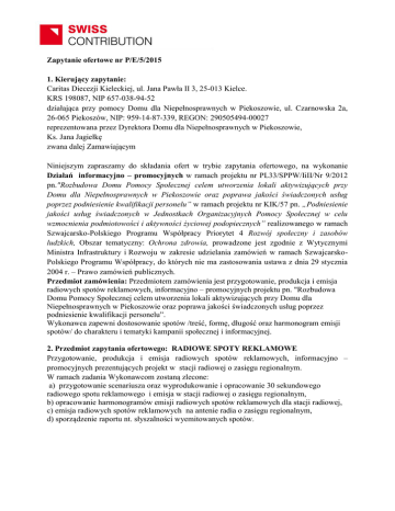 Zapytanie ofertowe nr P/E/5/2015 1. Kierujący zapytanie: Caritas Diecezji Kieleckiej, ul. Jana Pawła II 3, 25-013 Kielce. KRS 198087, NIP 657-038-94-52 działająca przy pomocy Domu dla Niepełnosprawnych w Piekoszowie, ul. Czarnowska 2a, 26-065 Piekoszów, NIP: 959-14-87-339, REGON: 290505494-00027 reprezentowana przez Dyrektora Domu dla Niepełnosprawnych w Piekoszowie, Ks. Jana Jagiełkę zwana dalej Zamawiającym Niniejszym zapraszamy do składania ofert w trybie zapytania ofertowego, na wykonanie Działań informacyjno – promocyjnych w ramach projektu nr PL33/SPPW/IiII/Nr 9/2012 pn."Rozbudowa Domu Pomocy Społecznej celem utworzenia lokali aktywizujących przy Domu dla Niepełnosprawnych w Piekoszowie oraz poprawa jakości świadczonych usług poprzez podniesienie kwalifikacji personelu” w ramach projektu nr KIK/57 pn. „Podniesienie jakości usług świadczonych w Jednostkach Organizacyjnych Pomocy Społecznej w celu wzmocnienia podmiotowości i aktywności życiowej podopiecznych” realizowanego w ramach Szwajcarsko-Polskiego Programu Współpracy Priorytet 4 Rozwój społeczny i zasobów ludzkich, Obszar tematyczny: Ochrona zdrowia, prowadzone jest zgodnie z Wytycznymi Ministra Infrastruktury i Rozwoju w zakresie udzielania zamówień w ramach SzwajcarskoPolskiego Programu Współpracy, do których nie ma zastosowania ustawa z dnia 29 stycznia 2004 r. – Prawo zamówień publicznych. Przedmiot zamówienia: Przedmiotem zamówienia jest przygotowanie, produkcja i emisja radiowych spotów reklamowych, informacyjno – promocyjnych projektu pn. "Rozbudowa Domu Pomocy Społecznej celem utworzenia lokali aktywizujących przy Domu dla Niepełnosprawnych w Piekoszowie oraz poprawa jakości świadczonych usług poprzez podniesienie kwalifikacji personelu”. Wykonawca zapewni dostosowanie spotów /treść, formę, długość oraz harmonogram emisji spotów/ do charakteru i tematyki kampanii społecznej i informacyjnej. 2. Przedmiot zapytania ofertowego: RADIOWE SPOTY REKLAMOWE Przygotowanie, produkcja i emisja radiowych spotów reklamowych, informacyjno – promocyjnych prezentujących projekt w stacji radiowej o zasięgu regionalnym. W ramach zadania Wykonawcom zostaną zlecone: a) przygotowanie scenariusza oraz wyprodukowanie i opracowanie 30 sekundowego radiowego spotu reklamowego i emisja w stacji radiowej o zasięgu regionalnym, b) opracowanie harmonogramów emisji radiowych spotów reklamowych dla stacji radiowej, c) emisja radiowych spotów reklamowych na antenie radia o zasięgu regionalnym, d) sporządzenie raportu nt. słyszalności wyemitowanych spotów. 3. Kody CPV: 79342200-5 - Usługi w zakresie promocji 92210000-6 - Usługi radiowe 92211000-3 - Usługi produkcji radiowej 4. Zadania Wykonawcy: W ramach zadania Wykonawcom zostaną zlecone: 1. Przygotowanie scenariusza oraz wyprodukowanie radiowego spotu reklamowego. 2. Opracowanie harmonogramów emisji radiowych spotów reklamowych dla stacji radiowej. 3. Wyemitowanie 30 - sekundowego radiowego spotu reklamowego 5 razy dziennie przez 20 dni na antenie stacji radiowej o zasięgu regionalnym. 4. Sporządzenie raportu słuchalności wyemitowanych radiowych spotów reklamowych. 5. Przedmiot zamówienia będzie wykonany z materiałów Wykonawcy i na sprzęcie Wykonawcy. 6. Wszystkie koszty związane z wykonaniem przedmiotu zamówienia spoczywają na Wykonawcy. 7. Wykonawca zapewni profesjonalną jakość wyprodukowanych radiowych spotów reklamowych. 8. Wykonawca na potrzeby produkcji spotów sam zapewni lektora, rekwizyty niezbędne do realizacji scenariusza a także licencjonowaną muzykę z uwzględnieniem opłaty licencyjnej za ewentualnie wykorzystane utwory. 9. Wykonawca przekaże Zamawiającemu majątkowe prawa autorskie do wykorzystywania wszelkich materiałów zawartych w spotach reklamowych, w tym prawa autorskie do wykorzystywania motywów muzycznych oraz wszelkich utworów powstałych w wyniku realizacji umowy, do eksploatacji w celach promocyjnych poprzez emisję radiową, internetową oraz wszelkie możliwe prezentacje publiczne. 5. Termin związania ofertą: 21 dni, licząc od daty upływu terminu składania ofert. 6. Warunki udziału w postępowaniu: O udzielenie zamówienia mogą ubiegać się Wykonawcy, którzy przedstawią aktualny odpis z właściwego rejestru albo aktualne zaświadczenie o wpisie do ewidencji działalności gospodarczej, wystawione nie wcześniej niż 6 miesięcy przed upływem terminu składania ofert. 7. Ocena spełniania warunków udziału w postępowaniu: Ocena spełniania warunków udziału w postępowaniu dokonywana będzie na podstawie złożonych dokumentów. W przypadku podania innej kwoty wyrażonej liczbowo, a innej wyrażonej słownie – Zamawiający przyjmie za prawidłową kwotę podaną słownie. 8. Dopuszczalna liczba ofert składanych przez jednego Wykonawcę. Oferty wspólne. Każdy Wykonawca może złożyć tylko jedną ofertę w formie pisemnej pod rygorem nieważności. Zamawiający nie dopuszcza możliwości składania ofert częściowych. Zamawiający nie dopuszcza możliwości składania ofert wariantowych. Zamawiający nie przewiduje udzielania zamówień uzupełniających. Zamawiający dopuszcza możliwość składania ofert wspólnych. 9. Kryteria oceny oferty. Opis kryteriów. Cena – 100 % Zamawiający jako najkorzystniejszą wybierze ofertę, która będzie zawierała najniższą cenę, z poniższymi zastrzeżeniami: W przypadku, gdyby wszystkie ważne oferty zawierały cenę wyższą niż kwota jaką Zamawiający może wydać na sfinansowanie zamówienia, Zamawiający przewiduje możliwość negocjacji ceny z Wykonawcą, który przedstawił najkorzystniejszą ofertę. 10. Termin i miejsce składania ofert. Oferty należy składać do 24.09.2015 r. do godz. 10:00 w siedzibie Zamawiającego w Piekoszowie - Dom dla Niepełnosprawnych w Piekoszowie, ul. Czarnowska 2a, 26 -065 Piekoszów, pokój nr 107 - Kancelaria, osobiście albo listem poleconym (liczy s