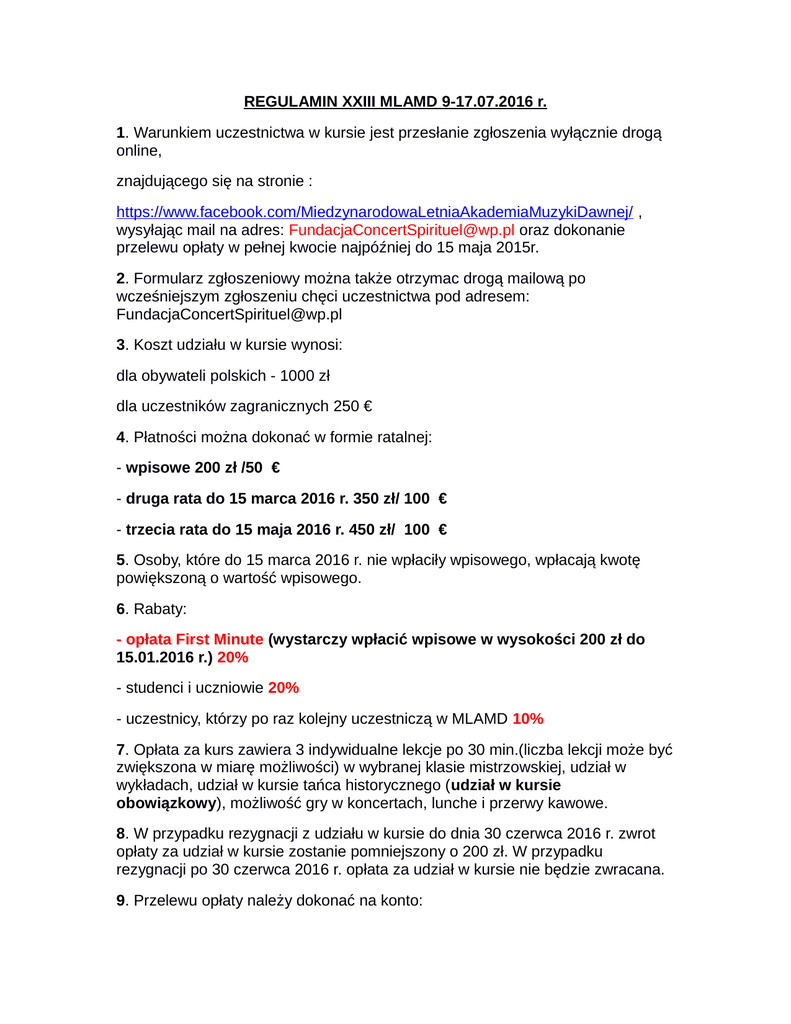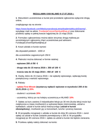 REGULAMIN XXIII MLAMD 9-17.07.2016 r. 1. Warunkiem uczestnictwa w kursie jest przesłanie zgłoszenia wyłącznie drogą online, znajdującego się na stronie : https://www.facebook.com/MiedzynarodowaLetniaAkademiaMuzykiDawnej/ , wysyłając mail na adres: [email protected] oraz dokonanie przelewu opłaty w pełnej kwocie najpóźniej do 15 maja 2015r. 2. Formularz zgłoszeniowy można także otrzymac drogą mailową po wcześniejszym zgłoszeniu chęci uczestnictwa pod adresem: [email protected] 3. Koszt udziału w kursie wynosi: dla obywateli polskich - 1000 zł dla uczestników zagranicznych 250 € 4. Płatności można dokonać w formie ratalnej: - wpisowe 200 zł /50 € - druga rata do 15 marca 2016 r. 350 zł/ 100 € - trzecia rata do 15 maja 2016 r. 450 zł/ 100 € 5. Osoby, które do 15 marca 2016 r. nie wpłaciły wpisowego, wpłacają kwotę powiększoną o wartość wpisowego. 6. Rabaty: - opłata First Minute (wystarczy wpłacić wpisowe w wysokości 200 zł do 15.01.2016 r.) 20% - studenci i uczniowie 20% - uczestnicy, którzy po raz kolejny uczestniczą w MLAMD 10% 7. Opłata za kurs zawiera 3 indywidualne lekcje po 30 min.(liczba lekcji może być zwiększona w miarę możliwości) w wybranej klasie mistrzowskiej, udział w wykładach, udział w kursie tańca historycznego (udział w kursie obowiązkowy), możliwość gry w koncertach, lunche i przerwy kawowe. 8. W przypadku rezygnacji z udziału w kursie do dnia 30 czerwca 2016 r. zwrot opłaty za udział w kursie zostanie pomniejszony o 200 zł. W przypadku rezygnacji po 30 czerwca 2016 r. opłata za udział w kursie nie będzie zwracana. 9. Przelewu opłaty należy dokonać na konto: „Fundacja Concert Spirituel”, Bank PEKAO S.A. nr 26 1240 1040 1111 0000 0136 2297 koniecznie z wpisem w tytule wpłaty „XXIII MLAMD + imię i nazwisko uczestnika" KOSZTY PRZELEWU BANKOWEGO POKRYWA WPŁACAJĄCY 10. Opłata za kurs zostanie potwierdzona wystawioną przez „Fundację Concert Spirituel” fakturą - uczestnicy proszeni są o dokładne wypełnianie danych osobowych w formularzach przelewowych. 11. Zgłoszenia przesłane po terminie będą rozpatrywane w miarę wolnych miejsc. 12. W przypadku osób niepełnoletnich dodatkowo wymagane jest dostarczenie w dniu rozpoczęcia kursu pisemnej zgody rodziców lub opiekunów prawnych (wzór oświadczenia na stronie https://www.facebook.com/MiedzynarodowaLetniaAkademiaMuzykiDawnej/) . 13. Repertuar koncertu kończącego XXIII MLAMD będzie podany do 15 marca 2016 r. 14. Szczegółowy program wszystkich zajęć zostanie przesłany uczestnikom drogą mailową do dnia 15 czerwca 2016r. 15. Harmonogram konsultacji indywidualnych ustalany jest przez uczestnika z wykładowcą w dniu rozpoczęcia kursu lub podczas pierwszych zajęć. 16. Organizatorzy rezerwują sobie prawo korekty harmonogramu zajęć lub zamiany wykładowcy z powodu nagłych i nieprzewidywalnych konieczności losowych. 17. Opłata za udział w XXIII MLAMD nie obejmuje: kosztów noclegów, wyżywienia ( oprócz obiadów), ubezpieczenia od następstw nieszczęśliwych wypadków etc. Uczestnikom kursu zaleca się posiadanie ubezpieczenia od kosztów leczenia. 18. Organizatorzy zastrzegają sobie prawo do fotografowania i rejestrowania seminariów, wykładów, koncertów uczestników Kursu oraz do publikowania tych materiałów służących promocji imprezy na stronie internetowej https://www.facebook.com/MiedzynarodowaLetniaAkademiaMuzykiDawnej/ oraz www.MLAMD.pl bez żadnych zobowiązań finansowych w stosunku do wykonawców. 19. Organizatorzy kursu nie ponoszą odpowiedzialności za wypadki, kradzieże, zagubione rzeczy osobiste, pieniądze czy dokumenty. 20. Uczestnik wyraża zgodę na przetwarzanie danych osobowych zawartych w moim Formularzu Zgłoszeniowym przez Fundację Concert Spirituel niezbędne do realizacji zobowiązań wobec uczestników XXIII MLAMD (zgodnie z Ustawą z dnia 29.08.1997 roku o Ochronie Danych Osobowych; tekst jednolity: Dz. U. z 2002r. Nr 101, poz. 926 ze zm.).