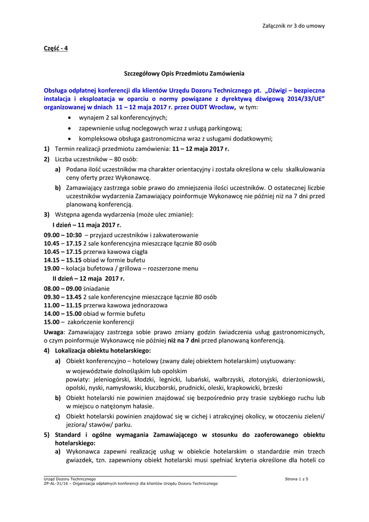 Załącznik nr 3 do umowy Część - 4 Szczegółowy Opis Przedmiotu Zamówienia Obsługa odpłatnej konferencji dla klientów Urzędu Dozoru Technicznego pt. „Dźwigi – bezpieczna instalacja i eksploatacja w oparciu o normy powiązane z dyrektywą dźwigową 2014/33/UE” organizowanej w dniach 11 – 12 maja 2017 r. przez OUDT Wrocław, w tym: wynajem 2 sal konferencyjnych; zapewnienie usług noclegowych wraz z usługą parkingową; kompleksowa obsługa gastronomiczna wraz z usługami dodatkowymi; 1) Termin realizacji przedmiotu zamówienia: 11 – 12 maja 2017 r. 2) Liczba uczestników – 80 osób: a) Podana ilość uczestników ma charakter orientacyjny i została określona w celu skalkulowania ceny oferty przez Wykonawcę. b) Zamawiający zastrzega sobie prawo do zmniejszenia ilości uczestników. O ostatecznej liczbie uczestników wydarzenia Zamawiający poinformuje Wykonawcę nie później niż na 7 dni przed planowaną konferencją. 3) Wstępna agenda wydarzenia (może ulec zmianie): I dzień – 11 maja 2017 r. 09.00 – 10:30 – przyjazd uczestników i zakwaterowanie 10.45 – 17.15 2 sale konferencyjna mieszczące łącznie 80 osób 10.45 – 17.15 przerwa kawowa ciągła 14.15 – 15.15 obiad w formie bufetu 19.00 – kolacja bufetowa / grillowa – rozszerzone menu II dzień – 12 maja 2017 r. 08.00 – 09.00 śniadanie 09.30 – 13.45 2 sale konferencyjne mieszczące łącznie 80 osób 11.00 – 11.15 przerwa kawowa jednorazowa 14.00 – 15.00 obiad w formie bufetu 15.00 – zakończenie konferencji Uwaga: Zamawiający zastrzega sobie prawo zmiany godzin świadczenia usług gastronomicznych, o czym poinformuje Wykonawcę nie później niż na 7 dni przed planowaną konferencją. 4) Lokalizacja obiektu hotelarskiego: a) Obiekt konferencyjno – hotelowy (zwany dalej obiektem hotelarskim) usytuowany: w województwie dolnośląskim lub opolskim powiaty: jeleniogórski, kłodzki, legnicki, lubański, wałbrzyski, złotoryjski, dzierżoniowski, opolski, nyski, namysłowski, kluczborski, prudnicki, oleski, krapkowicki, brzeski b) Obiekt hotelarski nie powinien znajdować się bezpośrednio przy trasie szybkiego ruchu lub w miejscu o natężonym hałasie. c) Obiekt hotelarski powinien znajdować się w cichej i atrakcyjnej okolicy, w otoczeniu zieleni/ jeziora/ stawów/ parku. 5) Standard i ogólne wymagania Zamawiającego w stosunku do zaoferowanego obiektu hotelarskiego: a) Wykonawca zapewni realizację usług w obiekcie hotelarskim o standardzie min trzech gwiazdek, tzn. zapewniony obiekt hotelarski musi spełniać kryteria określone dla hoteli co _________________________________________________________________________ Urząd Dozoru Technicznego ZP-AL-31/16 – Organizacja odpłatnych konferencji dla klientów Urzędu Dozoru Technicznego Strona 1 z 5 najmniej trzygwiazdkowych – *** zgodnie z załącznikiem nr 1 do Rozporządzenia Ministra Gospodarki i Pracy z dnia 19 sierpnia 2004 r. w sprawie obiektów hotelarskich i innych obiektów, w których są świadczone usługi hotelarskie (Dz. U. z 2006 r. Nr 22, poz.169 z pózn.zm.) b) Obiekt hotelarski powinien być oddany do użytku lub wyremontowany nie wcześniej niż 10 lat przed dniem opublikowania niniejszego postępowania. c) Obiekt hotelarski nie może być w trakcie prac remontowych w czasie realizacji usług, tj. w czasie konferencji. d) Jeśli w obiekcie hotelarskim, w terminie realizacji przedmiotu zamówienia, będzie jednocześnie organizowana inna impreza/konferencja, nie może ona w jakikolwiek sposób kolidować lub wpływać na przebieg konferencji Zamawiającego, komfort uczestników, identyfikację konferencji Zamawiającego, czy w inny sposób powodować np. hałas, mieszanie się uczestników, połączenie oznaczeń, stoisk czy punktów rejestracji uczestników itp. e) Wykonawca zobligowany jest do świadczenia usługi konferencyjnej i gastronomicznej oraz noclegowej w tym samym obiekcie (dopuszczalne jest kilka budynków pod tym samym adresem z dogodnym przejściem z jednego budynku do drugiego). f) Na terenie obiektu – bar/restauracja do skorzystania przez uczestników konferencji we własnym zakresie (zakup napojów zimnych, gorących, alkoholowych, przekąsek). 6) Wykonawca zapewni obiekt hotelarski spełniający poniższe szczegółowe wymagania: a) Odpowiednia ilości pokoi do ułożenia grupy max 80 osób, w tym co najmniej 15 osób, nie więcej jednak niż 30 osób do ułożenia w pokojach jednoosobowych lub dwuosobowych z możliwością pojedynczego wykorzystania (WAŻNE) oraz pozostałe osoby do ułożenia w pokojach dwuosobowych (z dwoma oddzielnymi łóżkami - WAŻNE). Wszystkie pokoje posiadające wyposażenie wg standardu minimum *** (trzygwiazdkowy) zgodnie z załącznikiem nr 1 do Rozporządzenia Ministra Gospodarki i Pracy z dnia 19 sierpnia 2004 r. w sprawie obiektów hotelarskich i innych obiektów, w których są świadczone usługi hotelarskie (Dz. U. z 2006 r. Nr. 22, poz. 169, z późn. zm.) Uwaga: Zamawiający może, w uzgodnieniu z Wykonawcą, zamówić usługi noclegowe w dobie hotelowej poprzedzającej dzień rozpoczęcia konferencji, lub dobie następującej po ostatnim dniu konferencji, w miarę dostępności pokoi w obiekcie hotelarskim. Sumaryczna liczba noclegów w ramach realizowanych usług nie przekroczy 80. b) Sale konferencyjne: - swobodnie mieszczące grupę 80 osób w ustawieniu szkolnym lub w podkowę/literę U po zewnętrznej stronie (ustawienie sal w każdym dniu konferencji do uzgodnienia z Zamawiającym); - wyposażone w nagłośnienie, mównicę, stół prezydialny dla 5 osób, rzutnik multimedialny, ekran, co najmniej 2 mikrofony bezprzewodowe, tablica (papierowa lub tablica biała sucho ścieralna), markery do tablicy; ekran jest dobrze widoczny z każdego miejsca sal; - wskazane jest, by sale miała dwa wyjścia z przodu i z tyłu; - z możliwością regulacji oświetlenia sztucznego; - sale klimatyzowane z możliwością regulacji temperatury; - ka