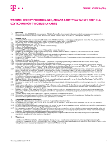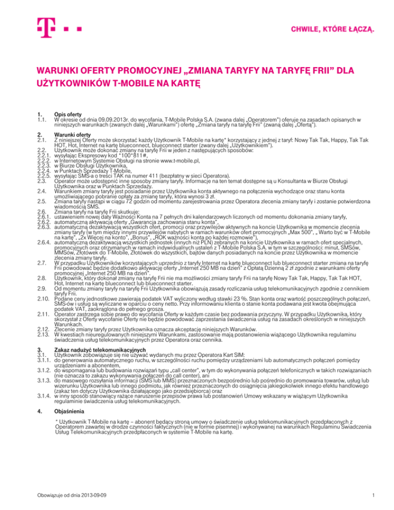 Warunki Oferty PrOmOcyjnej „zmiana taryfy na taryfę frii” dla użytkOWnikóW t-mObile na kartę 1. 1.1. Opis oferty W okresie od dnia 09.09.2013r. do wycofania, T-Mobile Polska S.A. (zwana dalej „Operatorem”) oferuje na zasadach opisanych w niniejszych warunkach (zwanych dalej „Warunkami”) ofertę „Zmiana taryfy na taryfę Frii” (zwaną dalej „Ofertą”). 2. 2.1. Warunki oferty Z niniejszej Oferty może skorzystać każdy Użytkownik T-Mobile na kartę* korzystający z jednej z taryf: Nowy Tak Tak, Happy, Tak Tak HOT, Hot, Internet na kartę blueconnect, blueconnect starter (zwany dalej „Użytkownikiem”). Użytkownik może dokonać zmiany na taryfę Frii w jeden z następujących sposobów: wysyłając Ekspresowy kod *100*811#, w Internetowym Systemie Obsługi na stronie www.t-mobile.pl, w Biurze Obsługi Użytkownika, w Punktach Sprzedaży T-Mobile, wysyłając SMS-a o treści TAK na numer 411 (bezpłatny w sieci Operatora). Operator może udostępnić inne sposoby zmiany taryfy. Informacje na ten temat dostępne są u Konsultanta w Biurze Obsługi Użytkownika oraz w Punktach Sprzedaży. Warunkiem zmiany taryfy jest posiadanie przez Użytkownika konta aktywnego na połączenia wychodzące oraz stanu konta umożliwiającego pobranie opłaty za zmianę taryfy, która wynosi 3 zł. Zmiana taryfy nastąpi w ciągu 72 godzin od momentu zarejestrowania przez Operatora zlecenia zmiany taryfy i zostanie potwierdzona wiadomością SMS. Zmiana taryfy na taryfę Frii skutkuje: ustawieniem nowej daty Ważności Konta na 7 pełnych dni kalendarzowych liczonych od momentu dokonania zmiany taryfy, automatyczną aktywacją oferty „Gwarancja zachowania stanu konta”, automatyczną dezaktywacją wszystkich ofert, promocji oraz przywilejów aktywnych na koncie Użytkownika w momencie zlecenia zmiany taryfy (w tym między innymi przywilejów nabytych w ramach warunków ofert promocyjnych „Max 500”, „ Warto być w T-Mobile na kartę”, „2x Więcej na konto”, „Bonus”, „ROK ważności konta po każdej rozmowie”), automatyczną dezaktywacją wszystkich jednostek (innych niż PLN) zebranych na koncie Użytkownika w ramach ofert specjalnych, promocyjnych oraz otrzymanych w ramach indywidualnych ustaleń z T-Mobile Polska S.A. w tym w szczególności: minut, SMSów, MMSów, Złotówek do T-Mobile, Złotówek do wszystkich, bajtów danych posiadanych na koncie przez Użytkownika w momencie zlecenia zmiany taryfy. W przypadku Użytkowników korzystających uprzednio z taryfy Internet na kartę blueconnect lub blueconnect starter zmiana na taryfę Frii powodować będzie dodatkowo aktywację oferty „Internet 250 MB na dzień” z Opłatą Dzienną 2 zł zgodnie z warunkami oferty promocyjnej „Internet 250 MB na dzień”. Użytkownik, który dokonał zmiany na taryfę Frii nie ma możliwości zmiany taryfy Frii na taryfę Nowy Tak Tak, Happy, Tak Tak HOT, Hot, Internet na kartę blueconnect lub blueconnect starter. Od momentu zmiany taryfy na taryfę Frii Użytkownika obowiązują zasady rozliczania usług telekomunikacyjnych zgodnie z cennikiem taryfy Frii. Podane ceny jednostkowe zawierają podatek VAT wyliczony według stawki 23 %. Stan konta oraz wartość poszczególnych połączeń, SMS-ów i usług są wyliczane w oparciu o ceny netto. Przy informowaniu klienta o stanie konta podawana jest kwota obejmująca podatek VAT, zaokrąglona do pełnego grosza. Operator zastrzega sobie prawo do wycofania Oferty w każdym czasie bez podawania przyczyny. W przypadku Użytkownika, który skorzystał z Oferty wycofanie Oferty nie będzie powodować zaprzestania świadczenia usług na zasadach określonych w niniejszych Warunkach. Zlecenie zmiany taryfy przez Użytkownika oznacza akceptację niniejszych Warunków. W kwestiach nieuregulowanych niniejszymi Warunkami, zastosowanie mają postanowienia wiążącego Użytkownika regulaminu świadczenia usług telekomunikacyjnych przez Operatora oraz cennika. 2.2. 2.2.1. 2.2.2. 2.2.3. 2.2.4. 2.2.5. 2.3. 2.4. 2.5. 2.6. 2.6.1. 2.6.2. 2.6.3. 2.6.4. 2.7. 2.8. 2.9. 2.10. 2.11. 2.12. 2.13. 3. Zakaz nadużyć telekomunikacyjnych 3.1. Użytkownik zobowiązuje się nie używać wydanych mu przez Operatora Kart SIM: 3.1.1. do generowania automatycznego ruchu, w szczególności ruchu pomiędzy urządzeniami lub automatycznych połączeń pomiędzy urządzeniami a abonentem, 3.1.2. do wspomagania lub budowania rozwiązań typu „call center”, w tym do wykonywania połączeń telefonicznych w takich rozwiązaniach (nie oznacza to zakazu wykonywania połączeń do call center), ani 3.1.3. do masowego rozsyłania informacji (SMS lub MMS) przeznaczonych bezpośrednio lub pośrednio do promowania towarów, usług lub wizerunku Użytkownika lub innego podmiotu, jak również przeznaczonych do osiągnięcia jakiegokolwiek innego efektu handlowego (zakaz ten dotyczy Użytkownika działającego jako przedsiębiorca) oraz 3.1.4. w inny sposób stanowiący rażące naruszenie przepisów prawa lub postanowień Umowy wskazany w wiążącym Użytkownika regulaminie świadczenia usług telekomunikacyjnych. 4. Objaśnienia * Użytkownik T-Mobile na kartę – abonent będący stroną umowy o świadczenie usług telekomunikacyjnych przedpłaconych z Operatorem zawartej w drodze czynności faktycznych (nie w formie pisemnej) i wykonywanej na warunkach Regulaminu Świadczenia Usług Telekomunikacyjnych przedpłaconych w systemie T-Mobile na kartę. Obowiązuje od dnia 2013-09-09 1