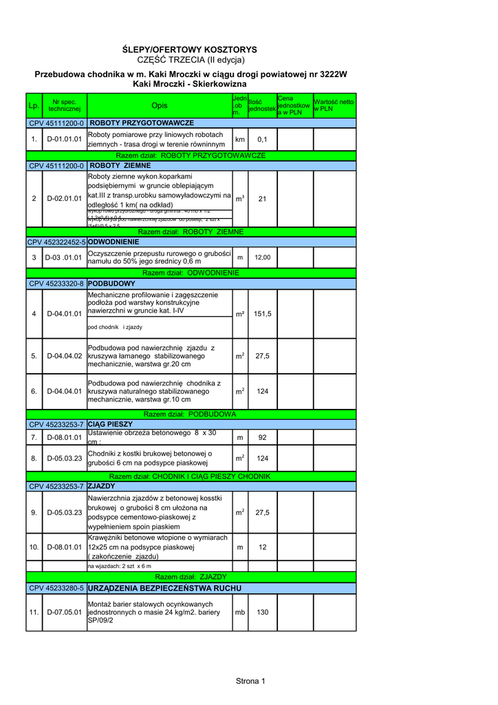 ŚLEPY/OFERTOWY KOSZTORYS CZĘŚĆ TRZECIA (II edycja) Przebudowa chodnika w m. Kaki Mroczki w ciągu drogi powiatowej nr 3222W Kaki Mroczki - Skierkowizna Lp. Nr spec. technicznej Opis Jedn Cena Ilość Wartość netto .ob jednostkow jednostek w PLN m. a w PLN CPV 45111200-0 ROBOTY PRZYGOTOWAWCZE 1. D-01.01.01 Roboty pomiarowe przy liniowych robotach ziemnych - trasa drogi w terenie równinnym km 0,1 Razem dział: ROBOTY PRZYGOTOWAWCZE CPV 45111200-0 ROBOTY ZIEMNE Roboty ziemne wykon.koparkami podsiębiernymi w gruncie oblepiającym 2 D-02.01.01 kat.III z transp.urobku samowyładowczymi na m³ 21 odległość 1 km( na odkład) wykop rowu przydrożnego - droga gminna : 40 mb x 1/2 (wykop 1,2+0,4) x 0,4 koryta pod nawierzchnię zjazdów do posesji; 2 szt x (5+6)/0,5 x 2,5 Razem dział: ROBOTY ZIEMNE ODWODNIENIE CPV 452322452-5 3 D-03 .01.01 Oczyszczenie przepustu rurowego o grubości m namułu do 50% jego średnicy 0,6 m 12,00 Razem dział: ODWODNIENIE CPV 45233320-8 PODBUDOWY 4 Mechaniczne profilowanie i zagęszczenie podłoża pod warstwy konstrukcyjne D-04.01.01 nawierzchni w gruncie kat. I-IV m² 151,5 pod chodnik i zjazdy 5. Podbudowa pod nawierzchnię zjazdu z D-04.04.02 kruszywa łamanego stabilizowanego mechanicznie, warstwa gr.20 cm m² 27,5 6. Podbudowa pod nawierzchnię chodnika z D-04.04.01 kruszywa naturalnego stabilizowanego mechanicznie, warstwa gr.10 cm m² 124 Razem dział: PODBUDOWA CPV 45233253-7 CIĄG PIESZY Ustawienie obrzeża betonowego 8 x 30 7. D-08.01.01 m cm : 8. D-05.03.23 Chodniki z kostki brukowej betonowej o grubości 6 cm na podsypce piaskowej m² 92 124 Razem dział: CHODNIK I CIĄG PIESZY CHODNIK CPV 45233253-7 ZJAZDY 9. Nawierzchnia zjazdów z betonowej kosstki brukowej o grubości 8 cm ułożona na D-05.03.23 podsypce cementowo-piaskowej z wypełnieniem spoin piaskiem m² 27,5 10. Krawężniki betonowe wtopione o wymiarach D-08.01.01 12x25 cm na podsypce piaskowej ( zakończenie zjazdu) m 12 na wjazdach: 2 szt x 6 m Razem dział: ZJAZDY CPV 45233280-5 URZĄDZENIA BEZPIECZEŃSTWA RUCHU 11. Montaż barier stalowych ocynkowanych D-07.05.01 jednostronnych o masie 24 kg/m2. bariery SP/09/2 mb 130 Strona 1 ŚLEPY/OFERTOWY KOSZTORYS CZĘŚĆ TRZECIA (II edycja) Przebudowa chodnika w m. Kaki Mroczki w ciągu drogi powiatowej nr 3222W Kaki Mroczki - Skierkowizna Lp. Nr spec. technicznej 12. Montaż zakończenia barier stalowych D-07.05.01 ocynkowanych jednostronnych o masie 24 kg/m2. bariery SP/09/2 Opis Jedn Cena Ilość Wartość netto .ob jednostkow jednostek w PLN m. a w PLN mb 20 Razem dział: URZĄDZENIA BEZPIECZEŃSTWA RUCHU Razem netto Vat 23% Razem brutto Słownie złotych: ……………………………, dn. ……………………………….Podpis Wykonawcy lub upoważnionego przedstawiciela Strona 2