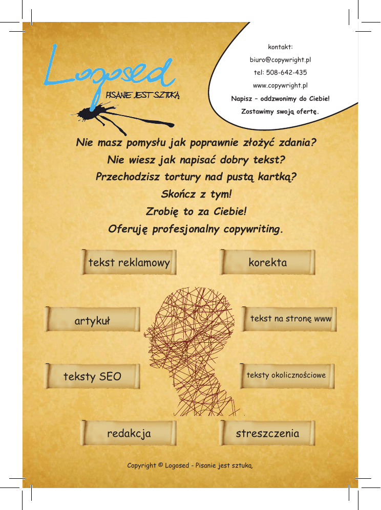 kontakt: [email protected] tel: 508-642-435 www.copywright.pl Napisz – oddzwonimy do Ciebie! Zostawimy swoją ofertę. Nie masz pomysłu jak poprawnie złożyć zdania? Nie wiesz jak napisać dobry tekst? Przechodzisz tortury nad pustą kartką? Skończ z tym! Zrobię to za Ciebie! Oferuję profesjonalny copywriting. tekst reklamowy korekta tekst na stronę www artykuł teksty SEO teksty okolicznościowe redakcja streszczenia Copyright © Logosed - Pisanie jest sztuką. Potrzebna Ci korekta pracy maturalnej, magisterskiej czy jakiejkolwiek innej? Skontaktuj się ze mną, wykonam to za Ciebie! Mam dość zindywidualizowany styl, więc jeśli chcesz się wyróżnić, to serdecznie zapraszam! Stawiam na kreację! Jeśli Cię zainteresowałam, zapraszam na stronę www.copywright.pl Copyright © Logosed - Pisanie jest sztuką.