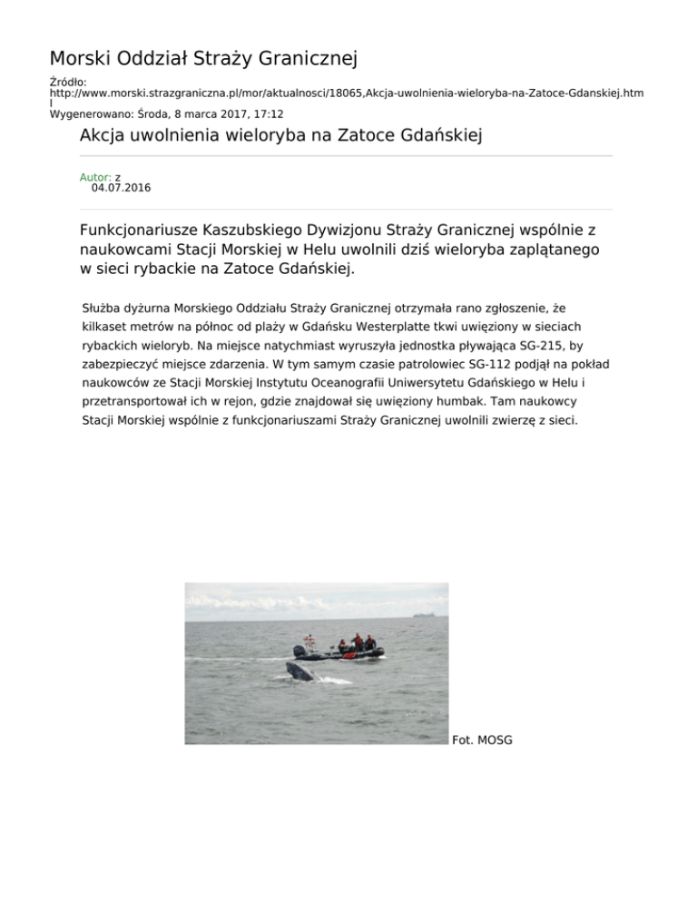 Morski Oddział Straży Granicznej Źródło: http://www.morski.strazgraniczna.pl/mor/aktualnosci/18065,Akcja-uwolnienia-wieloryba-na-Zatoce-Gdanskiej.htm l Wygenerowano: Środa, 8 marca 2017, 17:12 Akcja uwolnienia wieloryba na Zatoce Gdańskiej Autor: z 04.07.2016 Funkcjonariusze Kaszubskiego Dywizjonu Straży Granicznej wspólnie z naukowcami Stacji Morskiej w Helu uwolnili dziś wieloryba zaplątanego w sieci rybackie na Zatoce Gdańskiej. Służba dyżurna Morskiego Oddziału Straży Granicznej otrzymała rano zgłoszenie, że kilkaset metrów na północ od plaży w Gdańsku Westerplatte tkwi uwięziony w sieciach rybackich wieloryb. Na miejsce natychmiast wyruszyła jednostka pływająca SG-215, by zabezpieczyć miejsce zdarzenia. W tym samym czasie patrolowiec SG-112 podjął na pokład naukowców ze Stacji Morskiej Instytutu Oceanografii Uniwersytetu Gdańskiego w Helu i przetransportował ich w rejon, gdzie znajdował się uwięziony humbak. Tam naukowcy Stacji Morskiej wspólnie z funkcjonariuszami Straży Granicznej uwolnili zwierzę z sieci. Fot. MOSG Fot. MOSG Fot. MOSG Fot. MOSG