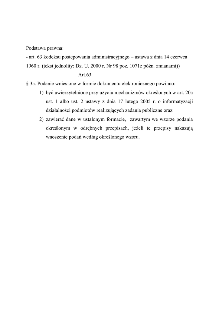 Podstawa prawna: - art. 63 kodeksu postępowania administracyjnego – ustawa z dnia 14 czerwca 1960 r. (tekst jednolity: Dz. U. 2000 r. Nr 98 poz. 1071z późn. zmianami)) Art.63 § 3a. Podanie wniesione w formie dokumentu elektronicznego powinno: 1) być uwierzytelnione przy użyciu mechanizmów określonych w art. 20a ust. 1 albo ust. 2 ustawy z dnia 17 lutego 2005 r. o informatyzacji działalności podmiotów realizujących zadania publiczne oraz 2) zawierać dane w ustalonym formacie, zawartym we wzorze podania określonym w odrębnych przepisach, jeżeli te przepisy nakazują wnoszenie podań według określonego wzoru.