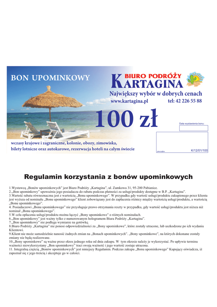 BON UPOMINKOWY Największy wybór w dobrych cenach www.kartagina.pl 100 zł wczasy krajowe i zagraniczne, kolonie, obozy, zimowiska, bilety lotnicze oraz autokarowe, rezerwacja hoteli na całym świecie pieczątka tel: 42 226 55 88 Data wystawienia bonu: K/12/01/100 Regulamin korzystania z bonów upominkowych 1.Wystawcą „Bonów upominkowych” jest Biuro Podróży „Kartagina”, ul. Zamkowa 31, 95-200 Pabianice. 2.„Bon upominkowy” upoważnia jego posiadacza do rabatu podczas płatności za usługi/produkty dostępne w B.P. „Kartagina”. 3.Wartość rabatu równoznaczna jest z wartością „Bonu upominkowego”. W przypadku gdy wartość usługi/produktu zakupionego przez klienta jest wyższa od nominału „Bonu upominkowego” klient zobowiązany jest do zapłacenia różnicy między wartością usługi/produktu, a wartością „Bonu upominkowego”. 4. Posiadaczowi „Bonu upominkowego” nie przysługuje prawo otrzymania reszty w przypadku, gdy wartość usługi/produktu jest niższa niż nominał „Bonu upominkowego”. 5.W celu opłacenia usługi/produktu można łączyć „Bony upominkowe” o różnych nominałach. 6.„Bon upominkowy” jest ważny tylko z numerowanym hologramem Biura Podróży „Kartagina”. 7.„Bon upominkowy” nie podlega wymianie na gotówkę. 8.Biuro Podróży „Kartagina” nie ponosi odpowiedzialności za „Bony upominkowe”, które zostały utracone, lub uszkodzone po ich wydaniu Klientowi. 9.Klient nie może samodzielnie nanosić żadnych zmian na „Bonach upominkowych”. „Bony upominkowe”, na których dokonane zostały zmiany nie będą realizowane. 10.„Bony upominkowe” są ważne przez okres jednego roku od dnia zakupu. W tym okresie należy je wykorzystać. Po upływie terminu ważności niewykorzystany „Bon upominkowy” traci swoją ważność i jego wartość zostaje utracona. 11. Integralną częścią „Bonów upominkowych” jest niniejszy Regulamin. Podczas zakupu „Bonu upominkowego” Kupujący oświadcza, iż zapoznał się z jego treścią i akceptuje go w całości.