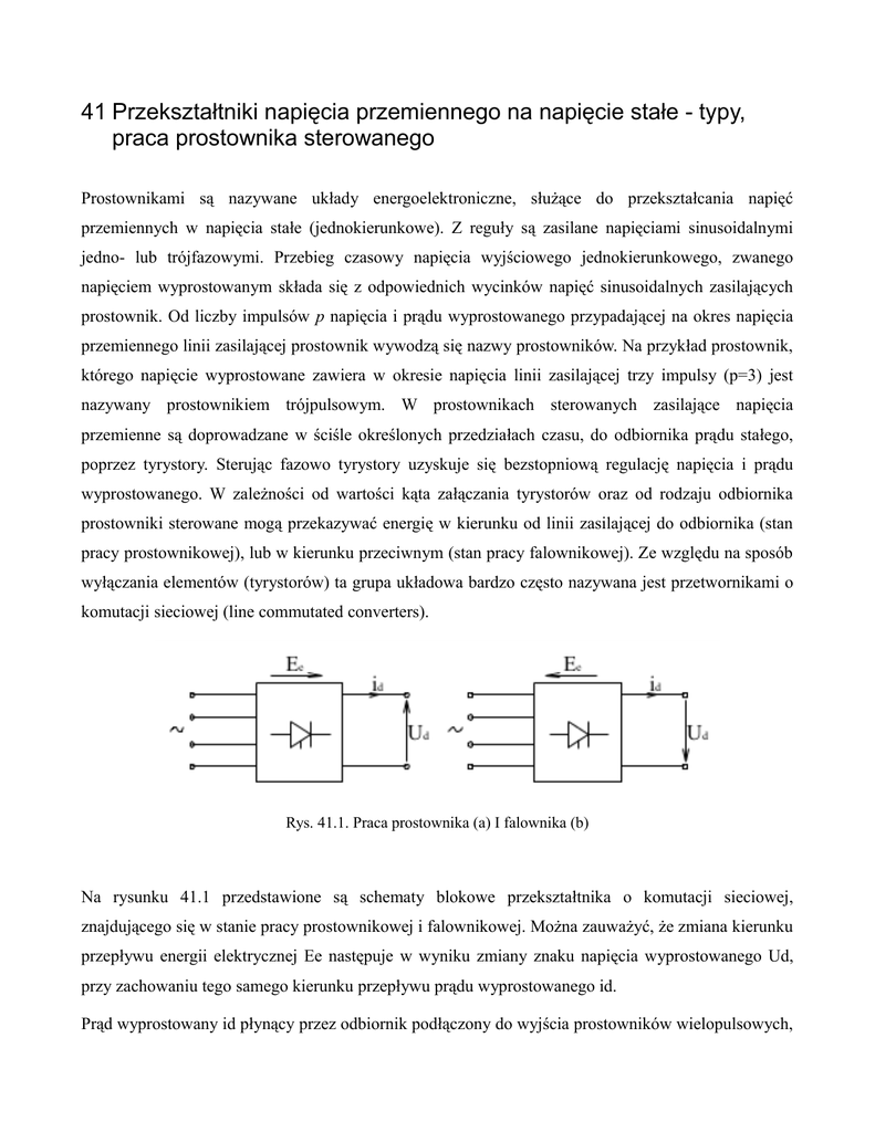 41 Przekształtniki napięcia przemiennego na napięcie stałe - typy, praca prostownika sterowanego Prostownikami są nazywane układy energoelektroniczne, służące do przekształcania napięć przemiennych w napięcia stałe (jednokierunkowe). Z reguły są zasilane napięciami sinusoidalnymi jedno- lub trójfazowymi. Przebieg czasowy napięcia wyjściowego jednokierunkowego, zwanego napięciem wyprostowanym składa się z odpowiednich wycinków napięć sinusoidalnych zasilających prostownik. Od liczby impulsów p napięcia i prądu wyprostowanego przypadającej na okres napięcia przemiennego linii zasilającej prostownik wywodzą się nazwy prostowników. Na przykład prostownik, którego napięcie wyprostowane zawiera w okresie napięcia linii zasilającej trzy impulsy (p=3) jest nazywany prostownikiem trójpulsowym. W prostownikach sterowanych zasilające napięcia przemienne są doprowadzane w ściśle określonych przedziałach czasu, do odbiornika prądu stałego, poprzez tyrystory. Sterując fazowo tyrystory uzyskuje się bezstopniową regulację napięcia i prądu wyprostowanego. W zależności od wartości kąta załączania tyrystorów oraz od rodzaju odbiornika prostowniki sterowane mogą przekazywać energię w kierunku od linii zasilającej do odbiornika (stan pracy prostownikowej), lub w kierunku przeciwnym (stan pracy falownikowej). Ze względu na sposób wyłączania elementów (tyrystorów) ta grupa układowa bardzo często nazywana jest przetwornikami o komutacji sieciowej (line commutated converters). Rys. 41.1. Praca prostownika (a) I falownika (b) Na rysunku 41.1 przedstawione są schematy blokowe przekształtnika o komutacji sieciowej, znajdującego się w stanie pracy prostownikowej i falownikowej. Można zauważyć, że zmiana kierunku przepływu energii elektrycznej Ee następuje w wyniku zmiany znaku napięcia wyprostowanego Ud, przy zachowaniu tego samego kierunku przepływu prądu wyprostowanego id. Prąd wyprostowany id płynący przez odbiornik podłączony do wyjścia prostowników wielopulsowych, może mieć charakter ciągły lub impulsowy. Mówi się wówczas o przewodzeniu ciągłym prostownika lub impulsowym. W wielu przypadkach prostowniki są zasilane z transformatorów. Transformatory prostownikowe dopasowują przede wszystkim wartość napięcia linii zasilającej oaz ich fazę do wymagań układu tyrystorowego i odbiornika. Oprócz tego transformatory te ograniczają wpływ zakłóceń powstających w linii zasilającej na przekształtnik oraz wpływ pracującego przekształtnika na linię zasilającą. Indukcyjności rozproszenia uzwojeń transformatora prostownikowego znacznie ograniczają także prądy zwarciowe. Układy prostownikowe można podzielić na • sterowane (z tyrystorami SCR) , • niesterowane (diodowe). W obydwu powyższych grupach można dokonać podziału uwzględniającego sposób zasilania topologię układu: • jednofazowe (jedno i dwupulsowe) • trójfazowe (trójpulsowe, sześciopulsowe, wielopulsowe) Ponieważ prostowniki niesterowane można potraktować jako szczególny przypadek prostowników sterowanych, w niniejszym opracowaniu opisane będą tylko prostowniki sterowane. PROSTOWNIKI JEDNOPULSOWE Na rys. 41.2. przedstawiono podstawowy schemat prostownika jednopulsowego, a na kolejnych rysunkach można znaleźć odpowiednie przebiegi prądów i napięć dla obciążenia typu R (Rys. 41.3), RL (Rys. 41.4) i RLE (Rys. 41.5 i Rys. 41.6). Rys. 41.2. Schemat prostownika jednopulsowego Rys. 41.3. Przebiegi napięć, prądu i impulsu sterującego w prostowniku jednopulsowym dla obciążenia typu R Rys. 41.4. Przebiegi napięć, prądu i impulsu sterującego w prostowniku jednopulsowym dla obciążenia typu R L Rys. 41.5. Przebiegi napięć, prądu i impulsu sterującego w prostowniku jednopulsowym dla obciążenia typu R LE Rys. 41.6. Przebiegi napięć, prądu i impulsu sterującego w prostowniku jednofazowym, jednopulsowym dla obciążenia typu RLE (praca falownikowa) Załączenie tyrystora jest możliwe tylko w przypadku jego dodatniej polaryzacji tzn. W zakresie kątów załączenia 0 < θz < π .W przypadku obciążenia typu R (Rys. 41.3) na wyjściu układu prostownikowego pojawiają się tylko dodatnie wycinki sinusoidy. Natomiast w przypadku obciążenia typu RL (Rys. 41.4) napięcie wyjściowe zawiera również składową ujemną, co powoduje zmniejszenie wartości średniej napięcia wyprostowanego. Aby wyeliminować to zjawisko stosuje się układ przedstawiony na rys. 41.7, w którym dodano tzw. „diodę zerową”. Odpowiednie przebiegi prądów i napięć przedstawiono na rys. 41.8. Na wyjściu układu otrzymujemy tylko dodatnie wartości napięcia i prądu. Zatem w tym układzie praca falownikowa jest niemożliwa. Rys.41.7. Prostownik jednopulsowy z diodą zerową Rys.41.8. Przebiegi napięć, prądu w prostowniku jednopulsowym z diodą zerową dla obciążenia typu RL PROSTOWNIKI DWUPULSOWE Na rys. 41.9. pokazano dwie możliwe konfiguracje prostowników dwupulsowych. Układ z rys. 41.9a. składa się z typowego jednofazowego, dwuuzwojeniowego transformatora i czterech tyrystorów w układzie mostkowym. W tej wersji możliwe jest również zastosowanie dwu tyrystorów i dwu diod. Natomiast układ z rys. 41.9b wymaga zastosowania dwu tyrystorów oraz jednofazowego transformatora trójuzwojeniowego. Rys.41.9. Prostownik jednofazowy , dwupulsowy : a) mostkowy, b) dwuelementowy Rys.41.10. Przebiegi napięć, prądu i impulsu sterującego w prostowniku jednofazowym, dwupulsowym dla obciążenia typu R Rys. 41.11. Przebiegi napięć, prądu i impulsu sterującego w prostowniku jednofazowym, dwupulsowym dla obciążenia typu RL a) prądy przerywane, b) prądy ciągłe PROSTOWNIKI TRÓJPULSOWE Efekt prostowania trójpulsowego uzyskuje się się w układzie przedstawionym na rys.41.20. Składa się on z transformatora trójfazowego z dostępnym punktem neutralnym oraz trzech tyrystorów połączonych w układ g