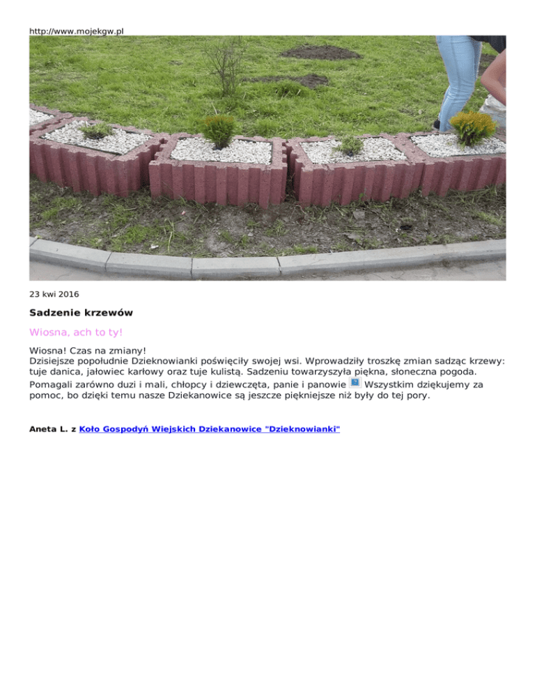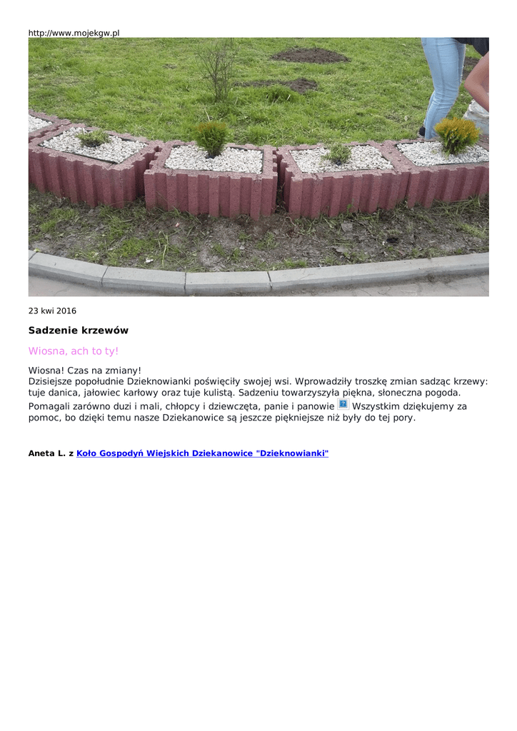 http://www.mojekgw.pl 23 kwi 2016 Sadzenie krzewów Wiosna, ach to ty! Wiosna! Czas na zmiany! Dzisiejsze popołudnie Dzieknowianki poświęciły swojej wsi. Wprowadziły troszkę zmian sadząc krzewy: tuje danica, jałowiec karłowy oraz tuje kulistą. Sadzeniu towarzyszyła piękna, słoneczna pogoda. Pomagali zarówno duzi i mali, chłopcy i dziewczęta, panie i panowie Wszystkim dziękujemy za pomoc, bo dzięki temu nasze Dziekanowice są jeszcze piękniejsze niż były do tej pory. Aneta L. z Koło Gospodyń Wiejskich Dziekanowice "Dzieknowianki"