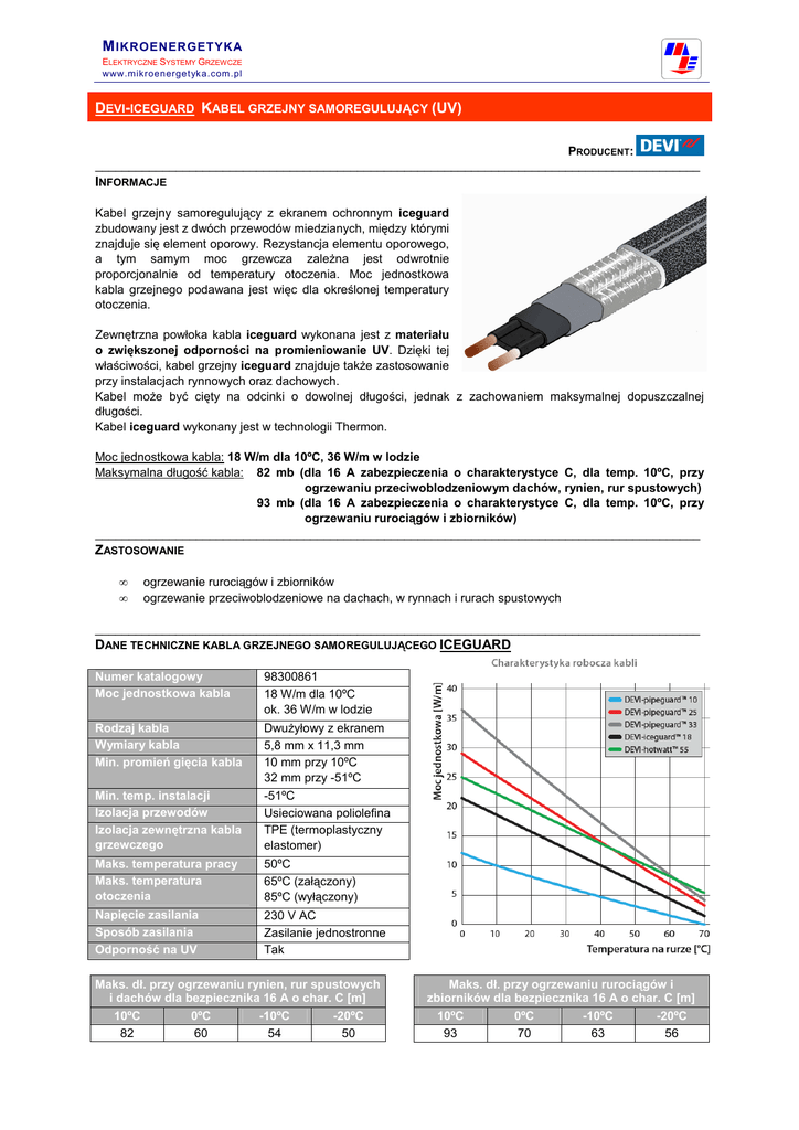 M IKROENERGETYKA ELEKTRYCZNE SYSTEMY GRZEWCZE www.mikroenergetyk a.com.pl DEVI-ICEGUARD KABEL GRZEJNY SAMOREGULUJĄCY (UV) PRODUCENT: __________________________________________________________________________________________ INFORMACJE Kabel grzejny samoregulujący z ekranem ochronnym iceguard zbudowany jest z dwóch przewodów miedzianych, między którymi znajduje się element oporowy. Rezystancja elementu oporowego, a tym samym moc grzewcza zależna jest odwrotnie proporcjonalnie od temperatury otoczenia. Moc jednostkowa kabla grzejnego podawana jest więc dla określonej temperatury otoczenia. Zewnętrzna powłoka kabla iceguard wykonana jest z materiału o zwiększonej odporności na promieniowanie UV. Dzięki tej właściwości, kabel grzejny iceguard znajduje także zastosowanie przy instalacjach rynnowych oraz dachowych. Kabel może być cięty na odcinki o dowolnej długości, jednak z zachowaniem maksymalnej dopuszczalnej długości. Kabel iceguard wykonany jest w technologii Thermon. Moc jednostkowa kabla: 18 W/m dla 10ºC, 36 W/m w lodzie Maksymalna długość kabla: 82 mb (dla 16 A zabezpieczenia o charakterystyce C, dla temp. 10ºC, przy ogrzewaniu przeciwoblodzeniowym dachów, rynien, rur spustowych) 93 mb (dla 16 A zabezpieczenia o charakterystyce C, dla temp. 10ºC, przy ogrzewaniu rurociągów i zbiorników) __________________________________________________________________________________________ ZASTOSOWANIE • • ogrzewanie rurociągów i zbiorników ogrzewanie przeciwoblodzeniowe na dachach, w rynnach i rurach spustowych __________________________________________________________________________________________ DANE TECHNICZNE KABLA GRZEJNEGO SAMOREGULUJĄCEGO ICEGUARD Numer katalogowy Moc jednostkowa kabla 98300861 18 W/m dla 10ºC ok. 36 W/m w lodzie Rodzaj kabla Wymiary kabla Min. promień gięcia kabla Dwużyłowy z ekranem 5,8 mm x 11,3 mm 10 mm przy 10ºC 32 mm przy -51ºC Min. temp. instalacji Izolacja przewodów Izolacja zewnętrzna kabla grzewczego -51ºC Usieciowana poliolefina TPE (termoplastyczny elastomer) Maks. temperatura pracy Maks. temperatura otoczenia 50ºC 65ºC (załączony) 85ºC (wyłączony) Napięcie zasilania Sposób zasilania Odporność na UV 230 V AC Zasilanie jednostronne Tak Maks. dł. przy ogrzewaniu rynien, rur spustowych i dachów dla bezpiecznika 16 A o char. C [m] 10ºC 0ºC -10ºC -20ºC 82 60 54 50 Maks. dł. przy ogrzewaniu rurociągów i zbiorników dla bezpiecznika 16 A o char. C [m] 10ºC 0ºC -10ºC -20ºC 93 70 63 56 1