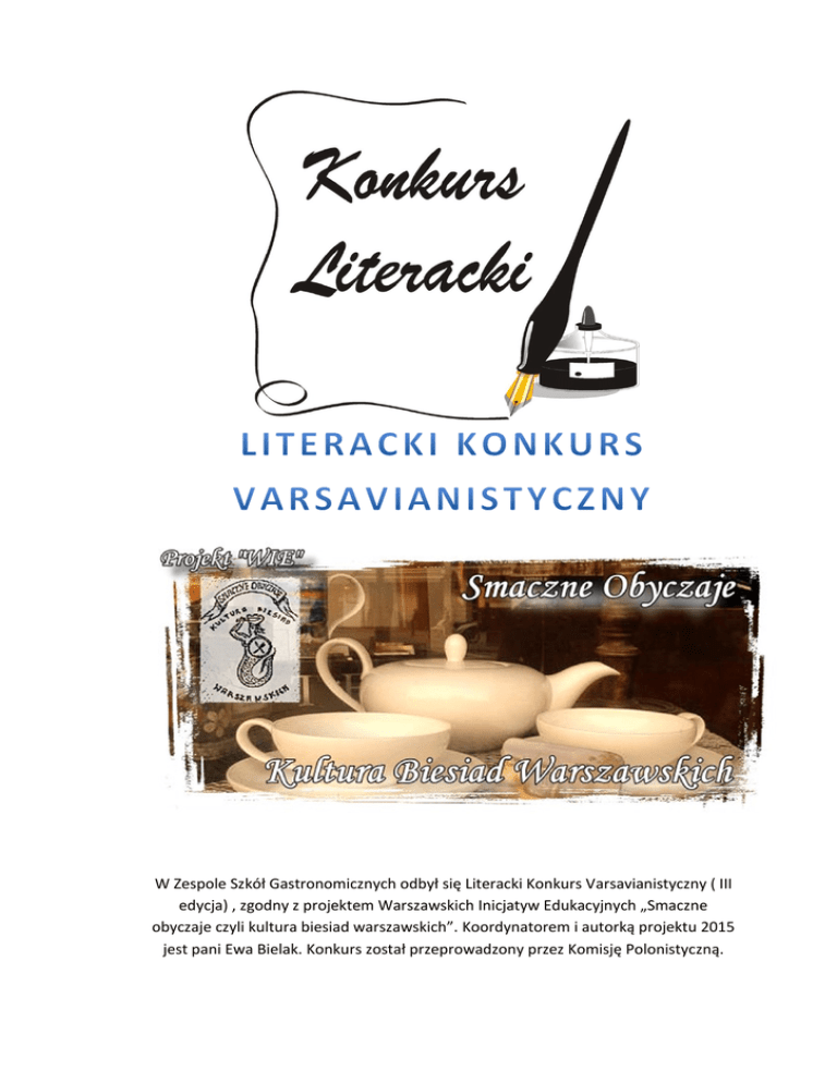 W Zespole Szkół Gastronomicznych odbył się Literacki Konkurs Varsavianistyczny ( III edycja) , zgodny z projektem Warszawskich Inicjatyw Edukacyjnych „Smaczne obyczaje czyli kultura biesiad warszawskich”. Koordynatorem i autorką projektu 2015 jest pani Ewa Bielak. Konkurs został przeprowadzony przez Komisję Polonistyczną. Młodzież musiała przeczytać ze zrozumieniem tekst literacki, a następnie wypełnić formularz konkursowy, zawierający pytania formalnie związane z konstrukcją wypowiedzi problemowej wymaganej na Nowej Maturze 2016. Wyboru tekstu dokonała sekcja Zespołu ds. Promocji ( j. polski, etyka) , aranżacji na potrzeby projektowe - polonistki. Jury składało się z nauczycieli ( polonistów) , studentów UW, przedstawicieli uczniów, a weryfikacja prac przebiegała w trakcie dwóch etapów. Oficjalne ogłoszenie wyników nastąpiło w trakcie varsavianistycznej Konferencji Naukowo-Kulturowej w dniu 16 kwietnia 2015 roku. Uroczyste rozdanie nagród odbyło się w trakcie Gali zorganizowanej przez wicedyrektor Marzenę Cieślak w dniu 20 kwietnia 2015 roku. I miejsce zdobyła Anna Szczęsna z klasy III i. II miejsce zdobyła Dominika Sienkiewicz z klasy III i. III miejsce zdobyła Katarzyna Wierzchowska z klasy III i. Wszystkie uczennice są uczestniczkami Kursów Wiedzy o Warszawie, prowadzonych przez panią Ewę Bielak i w tym roku starają się o uzyskanie Złotej Odznaki Młodego Przyjaciela Warszawy. Są również zaangażowane w utrzymanie przez ZSG Certyfikatu Varsavianistycznej Szkoły, który został przyznany w 2014 roku. Wyróżnienia w konkursie otrzymały uczennice klas III c i III h: Wiktoria Nowicka z klasy III h Aleksandra Dudek z klasy III c Natalia Gos z klasy III c. Serdecznie gratulujemy! Serdeczne podziękowania dla koleżanek-polonistek zaangażowanych w przedsięwzięcie- Elżbiety Zarębskiej, Katarzyny Goliszewskiej i Małgorzaty Łukaszewskiej oraz kolegi- etyka Andrzeja Wołosewicza! Nagrody książkowe w konkursie literackim zostały ufundowane ze środków projektu „Smaczne obyczaje czyli kultura biesiad warszawskich”, przy wsparciu Rady Rodziców ZSG. Podziękowania dla przedstawicieli uczniów działających w JURY! Podziękowania dla koordynatora projektu – pani wicedyrektor Marzeny Cieślak. Podziękowania dla wszystkich życzliwych przyjaciół wspierających działanie!!!