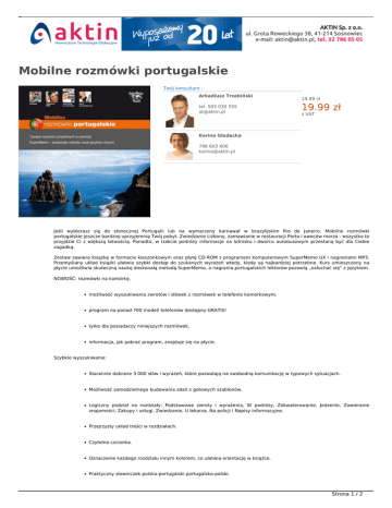 Mobilne rozmówki portugalskie Twój konsultant Arkadiusz Trzebiński tel. 503 030 555 [email protected] NOWOŚĆ W OFERCIE 19.99 zł 19.99 zł z VAT Karina Gładecka 796 603 606 [email protected] Jeśli wybierasz się do słonecznej Portugalii lub na wymarzony karnawał w brazylijskim Rio de Janeiro, Mobilne rozmówki portugalskie jeszcze bardziej uprzyjemnią Twój pobyt. Zwiedzanie Lizbony, zamawianie w restauracji Porto i owoców morza - wszystko to przyjdzie Ci z większą łatwością. Ponadto, w trakcie podróży informacje na lotnisku i dworcu autobusowym przestaną być dla Ciebie zagadką. Zestaw zawiera książkę w formacie kieszonkowym oraz płytę CD-ROM z programem komputerowym SuperMemo UX i nagraniami MP3. Przemyślany układ książki ułatwia szybki dostęp do szukanych wyrażeń wtedy, kiedy są najbardziej potrzebne. Kurs umieszczony na płycie umożliwia skuteczną naukę doskonałą metodą SuperMemo, a nagrania portugalskich lektorów pozwolą „osłuchać się” z językiem. NOWOŚĆ: rozmówki na komórkę. możliwość wyszukiwania zwrotów i słówek z rozmówek w telefonie komórkowym, program na ponad 700 modeli telefonów dostępny GRATIS! tylko dla posiadaczy niniejszych rozmówek, informacja, jak pobrać program, znajduje się na płycie. Szybkie wyszukiwanie: Starannie dobrane 3 000 słów i wyrażeń, które pozwalają na swobodną komunikację w typowych sytuacjach. Możliwość samodzielnego budowania zdań z gotowych szablonów. Logiczny podział na rozdziały: Podstawowe zwroty i wyrażenia, W podróży, Zakwaterowanie, Jedzenie, Zawieranie znajomości, Zakupy i usługi, Zwiedzanie, U lekarza, Na policji i Napisy informacyjne. Przejrzysty układ treści w rozdziałach. Czytelna czcionka. Oznaczenie każdego rozdziału innym kolorem, co ułatwia orientację w książce. Praktyczny słowniczek polsko-portugalski portugalsko-polski. Strona 1 / 2 Skuteczna nauka: Doskonały program komputerowy SuperMemo UX do nauki słownictwa zawartego w książce. Pozwala opanować cały materiał rozmówek nawet w ciągu jednego miesiąca dzięki genialnej metodzie optymalizacji powtórek. Pliki MP3 z nagraniami wszystkich słów i wyrażeń, wykonane przez profesjonalnych lektorów polskich i portugalskich. Można je wgrać na odtwarzacz MP3, iPod®, komórkę lub komputer, aby słuchać i powtarzać w dowolnej chwili. Ponad 5 godzin nagrań! Prosty przewodnik ułatwiający zapamiętywanie uznaną metodą SuperMemo, do wykorzystania bez użycia komputera. Wymagania sprzętowe programu: Procesor 400 MHz, 256 MB RAM, CD-ROM, karta dźwiękowa, mikrofon, Windows 2000 SP3, XP lub Vista. Wymagania sprzętowe dla nagrań MP3: dowolny odtwarzacz MP3. Informacje dodatkowe: 224 strony, 14 x 10 cm, oprawa miękka, lakierowana. Strona 2 / 2 Powered by TCPDF (www.tcpdf.org)