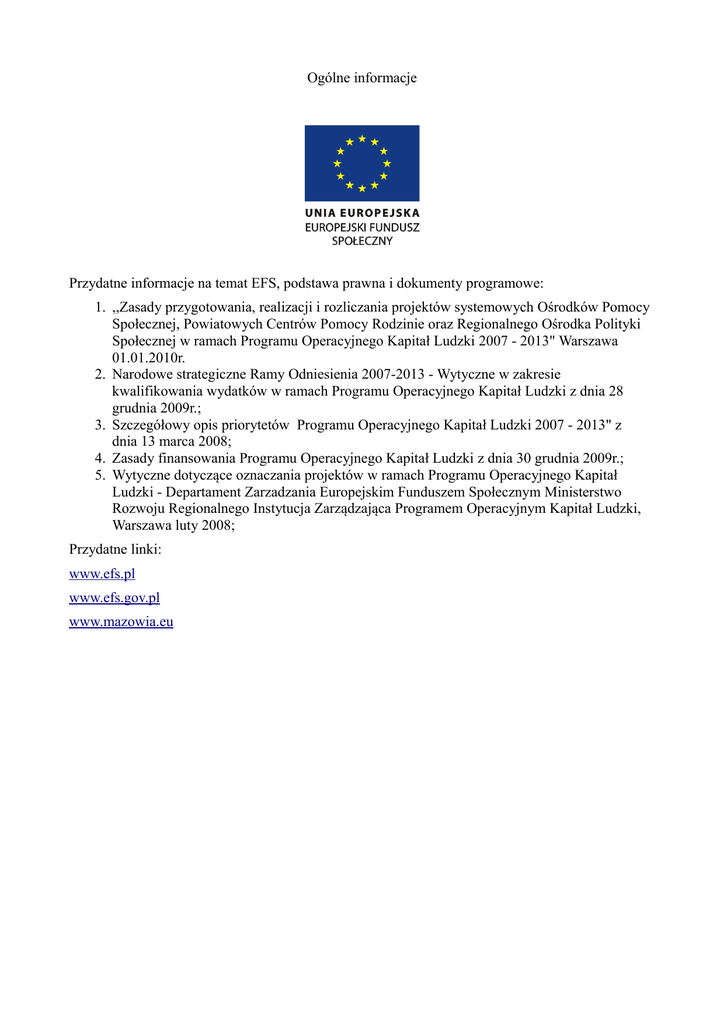 Ogólne informacje Przydatne informacje na temat EFS, podstawa prawna i dokumenty programowe: 1. ,,Zasady przygotowania, realizacji i rozliczania projektów systemowych Ośrodków Pomocy Społecznej, Powiatowych Centrów Pomocy Rodzinie oraz Regionalnego Ośrodka Polityki Społecznej w ramach Programu Operacyjnego Kapitał Ludzki 2007 - 2013" Warszawa 01.01.2010r. 2. Narodowe strategiczne Ramy Odniesienia 2007-2013 - Wytyczne w zakresie kwalifikowania wydatków w ramach Programu Operacyjnego Kapitał Ludzki z dnia 28 grudnia 2009r.; 3. Szczegółowy opis priorytetów Programu Operacyjnego Kapitał Ludzki 2007 - 2013" z dnia 13 marca 2008; 4. Zasady finansowania Programu Operacyjnego Kapitał Ludzki z dnia 30 grudnia 2009r.; 5. Wytyczne dotyczące oznaczania projektów w ramach Programu Operacyjnego Kapitał Ludzki - Departament Zarzadzania Europejskim Funduszem Społecznym Ministerstwo Rozwoju Regionalnego Instytucja Zarządzająca Programem Operacyjnym Kapitał Ludzki, Warszawa luty 2008; Przydatne linki: www.efs.pl www.efs.gov.pl www.mazowia.eu