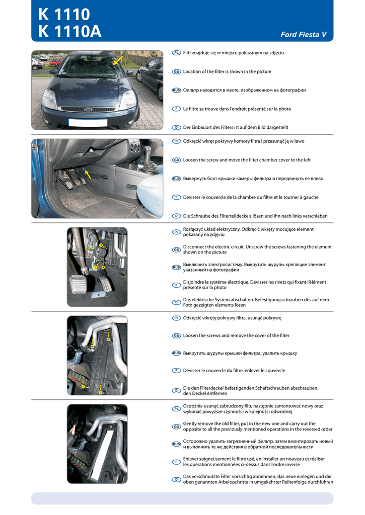 K 1110 K 1110A Ford Fiesta V PL Filtr znajduje się w miejscu pokazanym na zdjęciu GB Location of the filter is shown in the picture RUS Фильтр находится в месте, изображенном на фотографии F Le filtre se trouve dans l’endroit présenté sur la photo D Der Einbauort des Filters ist auf dem Bild dargestellt PL Odkręcić wkręt pokrywy komory filtra i przesunąć ją w lewo GB Loosen the screw and move the filter chamber cover to the left RUS Вывернуть болт крышки камеры фильтра и передвинуть ее влево F Dévisser le couvercle de la chambre du filtre et le tourner à gauche D Die Schraube des Filterteildeckels lösen und ihn nach links verschieben PL Rozłączyć układ elektryczny. Odkręcić wkręty mocujące element pokazany na zdjęciu GB Disconnect the electric circuit. Unscrew the screws fastening the element shown on the picture RUS Выключить электросистему. Выкрутить шурупы крепящие элемент указанный на фотографии F Disjoindre le systéme électrique. Dévisser les rivets qui fixent l’élément présenté sur la photo D Das elektrische System abschalten. Befestigungsschrauben des auf dem Foto gezeigten elements lösen PL Odkręcić wkręty pokrywy filtra, usunąć pokrywę GB Loosen the screws and remove the cover of the filter RUS Выкрутить шурупы крышки фильтра, удалить крышку F Dévisser le couvercle du filtre, enlever le couvercle D Die den Filterdeckel befestigenden Schaftschrauben abschrauben, den Deckel entfernen PL Ostrożnie usunąć zabrudzony filtr, następnie zamontować nowy oraz wykonać powyższe czynności w kolejności odwrotnej GB Gently remove the old filter, put in the new one and carry out the opposite to all the previously mentioned operations in the reversed order RUS Осторожно удалить загрязненный фильтр, затем вмонтировать новый и выполнить те же действия в обратной последовательности F Enlever soigneusement le filtre usé, en installer un nouveau et réaliser les opérations mentionnées ci-dessus dans l’ordre inverse D Das verschmutzte Filter vorsichtig abnehmen, das neue einlegen und die oben genannten Arbeitsschritte in umgekehrter Reihenfolge durchführen