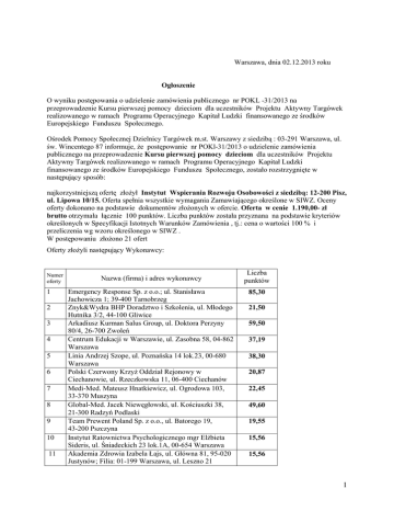 Warszawa, dnia 02.12.2013 roku Ogłoszenie O wyniku postępowania o udzielenie zamówienia publicznego nr POKL -31/2013 na przeprowadzenie Kursu pierwszej pomocy dzieciom dla uczestników Projektu Aktywny Targówek realizowanego w ramach Programu Operacyjnego Kapitał Ludzki finansowanego ze środków Europejskiego Funduszu Społecznego. Ośrodek Pomocy Społecznej Dzielnicy Targówek m.st. Warszawy z siedzibą : 03-291 Warszawa, ul. św. Wincentego 87 informuje, Ŝe postępowanie nr POKl-31/2013 o udzielenie zamówienia publicznego na przeprowadzenie Kursu pierwszej pomocy dzieciom dla uczestników Projektu Aktywny Targówek realizowanego w ramach Programu Operacyjnego Kapitał Ludzki finansowanego ze środków Europejskiego Funduszu Społecznego, zostało rozstrzygnięte w następujący sposób: najkorzystniejszą ofertę złoŜył Instytut Wspierania Rozwoju Osobowości z siedzibą: 12-200 Pisz, ul. Lipowa 10/15. Oferta spełnia wszystkie wymagania Zamawiającego określone w SIWZ. Oceny oferty dokonano na podstawie dokumentów złoŜonych w ofercie. Oferta w cenie 1.190,00- zł brutto otrzymała łącznie 100 punktów. Liczba punktów została przyznana na podstawie kryteriów określonych w Specyfikacji Istotnych Warunków Zamówienia , tj.: cena o wartości 100 % i przeliczenia wg wzoru określonego w SIWZ . W postępowaniu złoŜono 21 ofert Oferty złoŜyli następujący Wykonawcy: Numer oferty 1 2 3 4 5 6 7 8 9 10 11 Nazwa (firma) i adres wykonawcy Emergency Response Sp. z o.o.; ul. Stanisława Jachowicza 1; 39-400 Tarnobrzeg Znyk&Wydra BHP Doradztwo i Szkolenia, ul. Młodego Hutnika 3/2, 44-100 Gliwice Arkadiusz Kurman Salus Group, ul. Doktora Perzyny 80/4, 26-700 Zwoleń Centrum Edukacji w Warszawie, ul. Zasobna 58, 04-862 Warszawa Linia Andrzej Szope, ul. Poznańska 14 lok.23, 00-680 Warszawa Polski Czerwony KrzyŜ Oddział Rejonowy w Ciechanowie, ul. Rzeczkowska 11, 06-400 Ciechanów Medi-Med. Mateusz Hnatkiewicz, ul. Ogrodowa 103, 33-370 Muszyna Global-Med. Jacek Niewęgłowski, ul. Kościuszki 38, 21-300 Radzyń Podlaski Team Prewent Poland Sp. z o.o., ul. Batorego 19, 43-200 Pszczyna Instytut Ratownictwa Psychologicznego mgr ElŜbieta Sideris, ul. Śniadeckich 23 lok.1A, 00-654 Warszawa Akademia Zdrowia Izabela Łajs, ul. Główna 81, 95-020 Justynów; Filia: 01-199 Warszawa, ul. Leszno 21 Liczba punktów 85,30 21,50 59,50 37,19 38,30 20,87 22,45 49,60 19,55 15,56 15,56 1 12 Bartłomiej Paweł Domian Ratownictwo i Szkolenia, ul. Ksawerego Dunikowskiego 4, 07-415 Olszewo Borki 36,62 13 Security Training and Consulting Sp. z o.o., ul. Wały Dwernickiego 117/121 lok. P212, 42-200 Częstochowa 43,27 14 Szostak Rafał, Aleja Zwycięstwa 95/28, 42-520 Dąbrowa Górnicza Medicus Monika Struensee, 86-011 Wtelno, Wiosenna 5, Tryszczyn SEKA S.A., ul. Paca 37, 04-386 Warszawa 44,07 15 16 17 Ośrodek Szkolenia Zawodowego ElŜbieta Czerniawska, ul. Grunwaldzka 52, 13-300 Nowe Miasto Lubawskie 18 Instytut Wspierania Rozwoju Osobowości, ul. Lipowa 10/15, 12-200 Pisz Autek Aldona Szymaniak, ul. Obrońców Tobruku 38 m.311, 01-494 Warszawa R medicon Małgorzata Oleksów, ul. Olsztyńska 39 m.47, 26-600 Radom Fundacja Rozwoju Przedsiębiorczości „Twójstartup” Ul. śurawia 22/212, 00-515 Warszawa 19 20 21 15,06 40,07 17,63 100 91,61 39,67 41,00 Zamawiający dziękuje wszystkim Wykonawcom za udział w postępowaniu. Dyrektor Ośrodka Pomocy Społecznej Dzielnicy Targówek m.st. Warszawy Alicja Witoszyńska 2