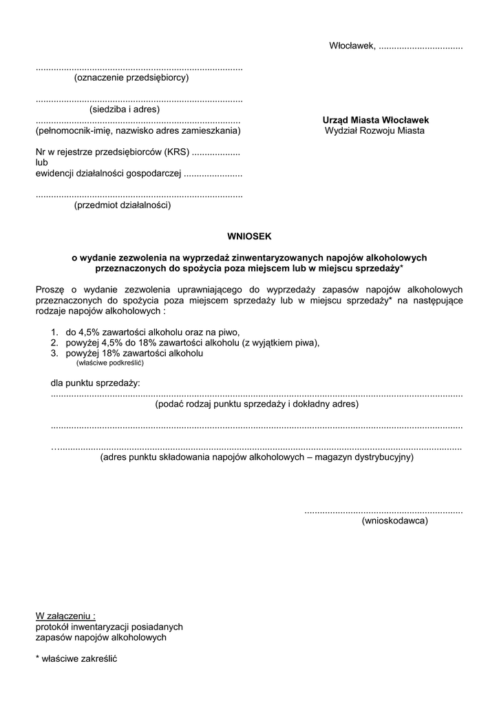 Włocławek, ................................. ................................................................................. (oznaczenie przedsiębiorcy) ................................................................................. (siedziba i adres) ................................................................................ (pełnomocnik-imię, nazwisko adres zamieszkania) Urząd Miasta Włocławek Wydział Rozwoju Miasta Nr w rejestrze przedsiębiorców (KRS) ................... lub ewidencji działalności gospodarczej ....................... ................................................................................. (przedmiot działalności) WNIOSEK o wydanie zezwolenia na wyprzedaż zinwentaryzowanych napojów alkoholowych przeznaczonych do spożycia poza miejscem lub w miejscu sprzedaży* Proszę o wydanie zezwolenia uprawniającego do wyprzedaży zapasów napojów alkoholowych przeznaczonych do spożycia poza miejscem sprzedaży lub w miejscu sprzedaży* na następujące rodzaje napojów alkoholowych : 1. do 4,5% zawartości alkoholu oraz na piwo, 2. powyżej 4,5% do 18% zawartości alkoholu (z wyjątkiem piwa), 3. powyżej 18% zawartości alkoholu (właściwe podkreślić) dla punktu sprzedaży: ................................................................................................................................................................. (podać rodzaj punktu sprzedaży i dokładny adres) ................................................................................................................................................................. …............................................................................................................................................................. (adres punktu składowania napojów alkoholowych – magazyn dystrybucyjny) .............................................................. (wnioskodawca) W załączeniu : protokół inwentaryzacji posiadanych zapasów napojów alkoholowych * właściwe zakreślić Oświadczam, iż przyjmuję do wiadomości, że: 1. 2. 3. 4. 5. administratorem powyższych danych osobowych jest Gmina Miasto Włocławek, Zielony Rynek 11/13, moje dane będą przetwarzane w celu przeprowadzenia postępowań dotyczących zezwoleń na sprzedaż napojów alkoholowych, moje dane bez podstawy prawnej nie zostaną udostępnione innym podmiotom, obowiązek podania danych wynika z ustawy z dnia 14 czerwca 1960 r. Kodeks postępowania administracyjnego (Dz. U.2016.poz.23 ) oraz ustawy z dnia 26 października 1982 r. o wychowaniu w trzeźwości i przeciwdziałaniu alkoholizmowi (Dz. U. 2016.poz. 487), mam prawo dostępu do treści swoich danych oraz ich poprawiania wraz z prawem do kontroli przetwarzania danych zawartych w zbiorze zgodnie z art. 32 ustawy z dnia 29 sierpnia 1997 r. o ochronie danych osobowych (Dz. U. z 2015 r. poz. 2135). ................................................................................................. Czytelny podpis(y) i pieczęć imienna przedsiębiorcy(ów) lub pełnomocnika(ów) *
