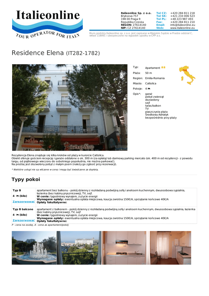 Italieonline Sp. z o.o. Bryksova 757 198 00 Praga 9 Republika Czeska REGON: 27614140 NIP: CZ 27614140 Tel CZ: Tel SK: Tel PL: Fax: Email: Web: +420 284 811 218 +421 233 006 523 +48 223 987 493 +420 284 811 210 [email protected] www.italieonline.eu Biuro podróży Italieonline sp. z o.o. jest zapisane w Miejskim Sądzie w Pradze oddział C, wkład 118991 i ubezpieczone na wypadek upadku w ČPP a.s. Residence Elena (IT282-1782) Typ: Apartament Plaża: 50 m Region: Emilia-Romania Miasto: Cattolica Pokoje: 4 Opis*: garaż pobyt zwierząt dozwolony sejf taras/balkon TV piaszczysta plaża Środkowy Adriatyk bezpośrednio przy plaży Rezydencja Elena znajduje się kilka kroków od plaży w kurorcie Cattolica. Obiekt oferuje gościom recepcję i garaże oddalone o ok. 300 m (za opłatą) lub darmowy parking mercato (ok. 400 m od rezydencji - z powodu targu, od piątkowego wieczoru do sobotniego popołudnia, nie można parkować). Na prośbę jest dozwolony pobyt z małym psem (należy go zgłosić przy rezerwacji). * Niektóre usługi nie są wliczone w cenę i mogą być świadczone za dopłatą. Typy pokoi Typ B apartament bez balkonu - pokój dzienny z rozkładaną podwójną sofą i aneksem kuchennym, dwuosobowa sypialnia, łazienka (bez kabiny prysznicowej), TV, sejf. 4 (bilo) W cenie: tygodniowy wynajem, zużycie energii Wymagane opłaty: ewentualna opłata miejscowa, kaucja zwrotna 150€/A, sprzątanie końcowe 40€/A Zarezerwować Opłaty fakultatywne: Typ B balcone apartament z balkonem - pokój dzienny z rozkładaną podwójną sofą i aneksem kuchennym, dwuosobowa sypialnia, łazienka (bez kabiny prysznicowej), TV, sejf 4 (bilo) W cenie: tygodniowy wynajem, zużycie energii Wymagane opłaty: ewentualna opłata miejscowa, kaucja zwrotna 150€/A, sprzątanie końcowe 40€/A Zarezerwować Opłaty fakultatywne: P - cena na osobę, A - cena za apartament/pokój Prezentowane zdjęcia są przykładowe. Typ B 4 Sezon (bilo) Terminy Cena za noc / A Początek pobytu Koniec pobytu Min. ilość nocy A 02.05. - 29.05.2017 220 zł Sob Sob 7 B 30.05. - 26.06.2017 275 zł Sob Sob 7 C 27.06. - 03.07.2017 322 zł Sob Sob 7 D 04.07. - 24.07.2017 400 zł Sob Sob 7 E 25.07. - 31.07.2017 440 zł Sob Sob 7 F 01.08. - 14.08.2017 550 zł Sob Sob 7 G 15.08. - 21.08.2017 471 zł Sob Sob 7 H 22.08. - 28.08.2017 353 zł Sob Sob 7 I 29.08. - 19.09.2017 275 zł Sob Sob 7 Typ B balcone 4 Sezon (bilo) Terminy Cena za noc / A Początek pobytu Koniec pobytu Min. ilość nocy A 02.05. - 29.05.2017 259 zł Sob Sob 7 B 30.05. - 26.06.2017 314 zł Sob Sob 7 C 27.06. - 03.07.2017 361 zł Sob Sob 7 D 04.07. - 24.07.2017 440 zł Sob Sob 7 E 25.07. - 31.07.2017 479 zł Sob Sob 7 F 01.08. - 14.08.2017 589 zł Sob Sob 7 G 15.08. - 21.08.2017 510 zł Sob Sob 7 H 22.08. - 28.08.2017 393 zł Sob Sob 7 I 29.08. - 19.09.2017 314 zł Sob Sob 7 https://www.italieonline.eu/pl/cattolica/residence-elena-1782.html www.ITALIEONLINE.eu TOUR OPERATOR FOR ITALY