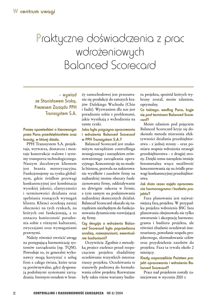 W centrum uwagi Praktyczne doświadczenia z prac wdrożeniowych Balanced Scorecard – wywiad ze Stanisławem Sroką, Prezesem Zarządu PPH Transsystem S.A. 2 ży samochodowej jest przesuwanie się produkcji do tańszych krajów Dalekiego Wschodu (Chin i Indii). Wyzwaniem dla nas jest poradzenie sobie z problemami, jakie wynikają z wchodzenia na tamte rynki. Proszę opowiedzieć o kierowanym przez Pana przedsiębiorstwie oraz branży, w której działa. Jaka była przyczyna opracowania i wdrożenia Balanced Scorecard w PPH Transsystem S.A.? PPH Transsystem S.A. projektuje, wytwarza, dostarcza i montuje konstrukcje stalowe i systemy transportu technologicznego. Naszym docelowym klientem jest branża motoryzacyjna. Funkcjonujemy na rynku globalnym, gdzie źródłem przewagi konkurencyjnej jest kombinacja wysokiej jakości, elastyczności i terminowości działania oraz spełniania rosnących wymagań klienta. Klienci oczekują naszej obecności na tych rynkach, na których oni funkcjonują, a to oznacza konieczność poradzenia sobie z różnymi kulturami, zwyczajami oraz wymaganiami prawnymi. Należy również zwrócić uwagę na postępującą harmonizację systemów zarządzania (np. TQM). Powoduje to, że generalni wykonawcy mogą korzystać z usług firm z całego świata, które teraz są porównywalne, gdyż dysponują podobnymi systemami zarządzania. Istotnym trendem w bran- Balanced Scorecard jest znakomitym narzędziem controllingu strategicznego i narzędziem zrównoważonego zarządzania operacyjnego. Koncentruje się na modelu biznesu, pozwala na nakierowanie wysiłków i zasobów firmy na najbardziej istotne obszary funkcjonowania firmy, oddziaływanie na dźwignie sukcesu w firmie, a tym samym na podejmowanie najbardziej skutecznych działań. Balanced Scorecard okazała się narzędziem niezbędnym do funkcjonowania dynamicznie rozwijającej się firmy. Czy decyzja o wdrożeniu Balanced Scorecard była poprzedzona analizą, rozważaniami, ewentualnie badaniami? Oczywiście. Zgodnie z metodyką project exelence przed rozpoczęciem projektu zbadaliśmy oczekiwania wszystkich interesariuszy projektu. Oczekiwania te stanowiły podstawę do formułowania celów projektu. Rozważane były także różne warianty budże- CONTROLLING I RACHUNKOWOŚĆ ZARZĄDCZA NR 8/2004 tu projektu, spośród których wybrany został, moim zdaniem, optymalny. Co takiego, według Pana, kryje się pod terminem Balanced Scorecard? Moim zdaniem pod pojęciem Balanced Scorecard kryje się doskonała metoda mierzenia efektywności działania przedsiębiorstwa – z jednej strony – oraz pomiaru stopnia wdrożenia strategii przedsiębiorstwa – z drugiej strony. Dzięki temu narzędziu istnieje fenomenalna wręcz możliwość koncentrowania się na źródle przewagi konkurencyjnej przedsiębiorstwa. Jak dużo czasu zajęło opracowanie harmonogramu i budżetu projektu? Faza planowania jest najważniejszą fazą projektu. W przypadku projektu wdrożenia BSC faza planowania obejmowała nie tylko stworzenie i akceptację harmonogramu i budżetu projektu, ale również zbadanie oczekiwań interesariuszy, powołanie zespołu projektowego, sformułowanie celów oraz przydzielenie zasobów do projektu. Faza ta trwała około 2 miesięcy. Kiedy rozpoczęliście Państwo projekt opracowania i wdrożenia Balanced Scorecard? Prace nad projektem zostały zainicjowane w styczniu 2001 r. W centrum uwagi Jaki jest zakres projektu? Początkowo projekt obejmował wypracowanie koncepcji mapy strategii, czyli zestawu celów strategicznych połączonych relacjami przyczynowo-skutkowymi, ale później dostrzegliśmy konieczność zakupu specjalnego oprogramowania ułatwiającego administrowanie Balanced Scorecard. miemy i wiemy, w jaki sposób możemy dalej rozwijać nasze przedsiębiorstwo. Kto w organizacji korzysta z modelu Balanced Scorecard? Z modelu korzysta zarząd, komórka controllingu, właściciele tematów strategicznych i (jeśli zaistnieje taka potrzeba) właściciele procesów. cepcyjnej, gdy ujawniły się trudności w administrowaniu modelem przy użyciu stosowanych dotychczas przez PPH Transsystem S.A. narzędzi. Jakie efekty dało wdrożenie i stosowanie Balanced Scorecard w PPH Transsystem S.A.? Na jakim etapie obecnie się Państwo znajdują? Kto opracowywał model Balanced Scorecard? Oprogramowanie zostało wdrożone i funkcjonuje. W tym momencie koncentrujemy się na uproszczeniu funkcjonującego modelu mapy strategii oraz na większym zaangażowaniu menedżerów średniego szczebla w problematykę Balanced Scorecard. Model został wypracowany w toku warsztatów koncepcyjnych przez zespół projektowy, powołany do prac nad wdrożeniem Balanced Scorecard. Przy przeglądzie strategii i wdrożeniu BSC korzystaliśmy ze wsparcia firmy doradczej BENTEN, jednak trzeba podkreślić, że większość prac wykonali nasi specjaliści. Odnieśliśmy wiele korzyści, spośród których najważniejsze to: koncentracja na wdrażaniu strategii, poprawa efektywności działania oraz świadomość powziętych przez przedsiębiorstwo założeń strategicznych wśród pracowników. Dodatkowym elementem jest uświadomienie sobie przez kierownictwo firmy i pracowników sensu funkcjonowania firmy, mechanizmów decydujących o jej efektach oraz związków przyczynowo-skutkowych w modelu biznesu. Która część modelu BSC jest najważniejsza? Jakie były największe wyzwania i problemy projektowe? Myślę, że ważny jest cały model Balanced Scorecard. Cała mapa strategii z celami, miernikami i relacjami przyczynowo-skutkowymi jest niezmiernie ważna dla długofalowego rozwoju przedsiębiorstwa. Istotne jest powiązanie celów i mierników z systemem motywacyjnym funkcjonującym w przedsiębiorstwie, w tym z płacami pracowników. Należy zaznaczyć, że projekty tego typu do najłatwiejszych nie należą. My w Transsystemie mieliśmy łatwiej, ponieważ praca z projektami to dla nas „chleb powszedni”. Jednak do n