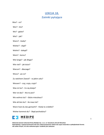 LEKCJA 18. Zaimki pytające Was? - co? Wer? - kto? Wo? - gdzie? Wie? - jak? Wann? - kiedy? Woher? - skąd? Wohin? - dokąd? Wem? - komu? Wie lange? - jak długo? Wie viel? - jak dużo? Warum? - dlaczego? Wozu? - po co? Zu welchem Zweck? - w jakim celu? Wessen? - czyj, czyja, czyje? Was ist los? - Co się dzieje? Wer ist das? - Kto to jest? Wo wohnst du? - Gdzie mieszkasz? Wie alt bist du? - Ile masz lat? Wann hast du das gemacht? - Kiedy to zrobiłeś? Woher kommst du? - Skąd pochodzisz? 1 Materiał stanowi własność firmy Medipe Sp. z o.o. ul. Szewska 8, 50-122 Wrocław Reprodukcja, rozpowszechnianie lub inne wykorzystywanie całości lub części materiału w jakiejkolwiek formie dla celów innych, niż cele niekomercyjne i osobiste jest zakazane Wohin fährst du? - Dokąd jedziesz? Wem hilfst du? - Komu pomagasz? Wie lange lernst du? - Jak długo się uczysz? Wie viel kostet das? - Jak dużo (ile) to kosztuje? Wozu gehst du dort? - Po co tam idziesz? Wessen Buch ist das? - Czyja to jest książka? Was kostet dieses Buch? (Ile kosztuje ta książka?) Wer ist der klügste? (Kto jest najmądrzejszy?) Wie lange dauert die Reise? (Jak długo trwa podróż?) Wohin fahren wir? (Dokąd jedziemy?) Wo befindet sich die Post? (Gdzie znajduje się poczta?) Wie spät ist es?/ Wie viel Uhr ist es? ( Która jest godzina?) Uzupełnij zdania odpowiednimi zaimkami pytającymi- (wie, wie viel, wie lange, wo, wohin, wie spät, woher, was, wer, warum). 1..……………..hat keine Hausaufgabe für heute? die Hausaufgabe- zadanie 2………………..fährt man von Krakau nach Wien? fahren- jechać 3………………..fühlst du dich heute? sich fühlen –czuć się 4………………..hast du da in der Tasche? die Tasche- torba 5…………………kostet ein Kilo Bananen? kosten- kosztować 6…………………hast du diese Bluse gekauft? kaufen- kupować 7. Entschuldigung,………………… ist es jetzt? Entschuldigung- przepraszam 8…………………fährt Nina im Sommer? im Sommer- w lecie 9…………………kommt die neue Schülerin? die Schülerin- uczennica 10……………….bist du traurig? traurig- smutny 2 Materiał stanowi własność firmy Medipe Sp. z o.o. ul. Szewska 8, 50-122 Wrocław Reprodukcja, rozpowszechnianie lub inne wykorzystywanie całości lub części materiału w jakiejkolwiek formie dla celów innych, niż cele niekomercyjne i osobiste jest zakazane Przysłowia: Man soll die Äpfel erst zählen, bevor man sie aufteilt. Nie dzieli sie skóry na niedźwiedziu. Kümmere dich nicht um ungelegte Eier. Nie martw sie na zapas. Odpowiedzi : 1.Wer 2. Wie lange 3.Wie 4.Was 5.Wie viel 6.Wo 7. Wie 8. Wohin 9. Wann 10. Warum 3 Materiał stanowi własność firmy Medipe Sp. z o.o. ul. Szewska 8, 50-122 Wrocław Reprodukcja, rozpowszechnianie lub inne wykorzystywanie całości lub części materiału w jakiejkolwiek formie dla celów innych, niż cele niekomercyjne i osobiste jest zakazane