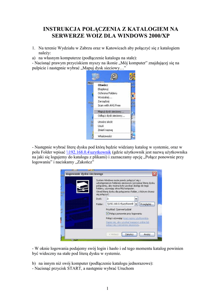 INSTRUKCJA POŁĄCZENIA Z KATALOGIEM NA SERWERZE WOIZ DLA WINDOWS 2000/XP 1. Na terenie Wydziału w Zabrzu oraz w Katowicach aby połączyć się z katalogiem naleŜy: a) na własnym komputerze (podłączenie katalogu na stałe): - Nacisnąć prawym przyciskiem myszy na ikonie „Mój komputer” znajdującej się na pulpicie i następnie wybrać „Mapuj dysk sieciowy…” - Następnie wybrać literę dysku pod którą będzie widziany katalog w systemie, oraz w polu Folder wpisać \\192.168.0.4\uzytkownik (gdzie uŜytkownik jest nazwą uŜytkownika na jaki się logujemy do katalogu z plikami) i zaznaczamy opcję „Połącz ponownie przy logowaniu” i naciskamy „Zakończ” - W oknie logowania podajemy swój login i hasło i od tego momentu katalog powinien być widoczny na stałe pod literą dysku w systemie. b) na innym niŜ swój komputer (podłączenie katalogu jednorazowe): - Nacisnąć przycisk START, a następnie wybrać Uruchom 1 - Wpisać w polu: \\192.168.0.4\uŜytkownik (gdzie uŜytkownik jest nazwą uŜytkownika na jaki się logujemy do katalogu z plikami) - Po wyskoczeniu okna z prośbą o zalogowanie się, wpisać swój login i hasło dostępu. POŁĄCZENIE SPOZA TERENU WYDZIAŁU OiZ, Z UśYCIEM TUNELU VPN 2. Najpierw tworzymy połączenie VPN (bezpieczne szyfrowane połączenie): Z menu "Start" wybieramy "Wszystkie programy" - "Akcesoria" - "Komunikacja" - "Kreator nowego połączenia" 2 3. W okienku kreatora klikamy "Dalej" 4. Zaznaczamy "Połącz się z siecią w miejscu pracy" a następnie klikamy "Dalej" 3 5. Zaznaczamy "Połączenie wirtualnej sieci prywatnej" i klikamy "Dalej" 6. W kolejnym oknie wpisujemy nazwę dla naszego połączenia np. VPN 4 7. Następnie wpisujemy adres serwera, z którym chcemy się połączyć - w naszym przypadku jest to adres 157.158.144.1 i klikamy "Dalej". 8. Zaznaczamy dla kogo będzie moŜliwe połączenie VPN, dla nas czy dla wszystkich uŜytkowników tego komputera i klikamy "Dalej" 5 9. Następnie zaznaczamy pole "Dodaj skrót tego połączenie na moim pulpicie" i klikamy "Zakończ”. 10. Po tych operacjach na pulpicie powinien pojawić się skrót do połączenia VPN o nazwie, którą nadaliśmy na początku pracy z kreatorem. 6 11. Po dwukrotnym kliknięciu na ikonie skrótu pojawi się okno logowania, gdzie przed pierwszym połączeniem z siecią WOIZ naleŜy jeszcze dodatkowo skonfigurować połączenie poprzez kliknięcie opcji „Właściwości”. 12. W oknie które się pojawi naleŜy wybrać zakładkę „Sieć”, w niej następnie zaznaczyć „Protokół Internetowy (TCP/IP)” i kliknąć przycisk „Właściwości” 7 13. W poniŜszym oknie które się pojawi naleŜy kliknąć przycisk „Zaawansowane” 14. W oknie które się pojawi w zakładce „Ogólne” naleŜy usunąć zaznaczenie przy opcji „UŜyj domyślnej bramy w sieci zdalnej” i potwierdzić operację przyciskając następnie przycisk „OK” (równieŜ w kolejnych oknach). Nie przeprowadzenie kroków 10 – 13 moŜe spowodować problemy z działaniem sieci Internet na komputerze, na którym ustanawiane jest połączenie VPN. 8 15. Po powrocie do okna logowania (przy kolejnych połączeniach z siecią WOIZ kroki 10 – 13 naleŜy ominąć, wykonuje się je tylko przy pierwszym połączeniu), wpisujemy nazwę naszego uŜytkownika oraz hasło a następnie klikamy "Połącz". 16. Po prawidłowym połączeniu się z siecią WOIZ, obok zegara systemowego powinna ukazać się ikona ustanowionego połączenia VPN. Od tego momentu moŜna połączyć się z katalogiem z danymi. W celu połączenia się z katalogiem z danymi naleŜy: a) Nacisnąć przycisk START, a następnie wybrać Uruchom b) Wpisać w polu: \\192.168.0.4\uŜytkownik (gdzie uŜytkownik jest nazwą uŜytkownika na jaką się logujemy do VPN oraz do katalogu z plikami) c) Po wyskoczeniu okna z prośbą o zalogowanie się, wpisać swój login i hasło dostępu. 9 17. W celu rozłączenia się z siecią WOIZ, naleŜy na ikonę połączenia VPN kliknąć prawym przyciskiem myszy i z opcji wybrać „Rozłącz” 10