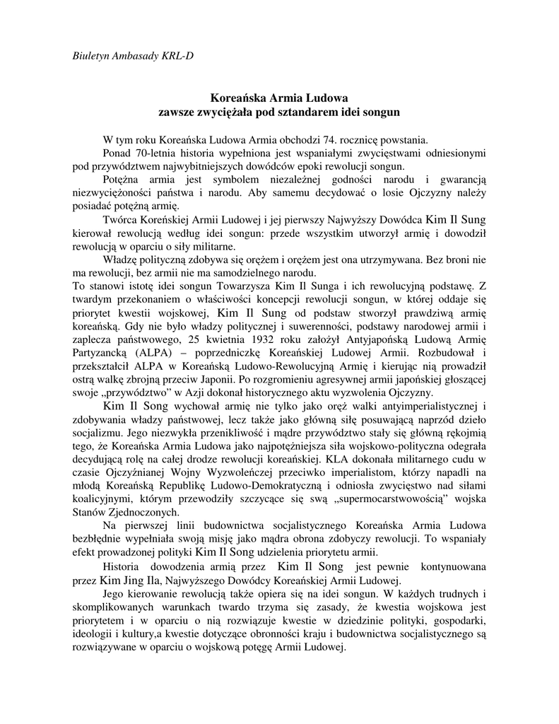 Biuletyn Ambasady KRL-D Koreańska Armia Ludowa zawsze zwyciężała pod sztandarem idei songun W tym roku Koreańska Ludowa Armia obchodzi 74. rocznicę powstania. Ponad 70-letnia historia wypełniona jest wspaniałymi zwycięstwami odniesionymi pod przywództwem najwybitniejszych dowódców epoki rewolucji songun. Potężna armia jest symbolem niezależnej godności narodu i gwarancją niezwyciężoności państwa i narodu. Aby samemu decydować o losie Ojczyzny należy posiadać potężną armię. Twórca Koreńskiej Armii Ludowej i jej pierwszy Najwyższy Dowódca Kim Il Sung kierował rewolucją według idei songun: przede wszystkim utworzył armię i dowodził rewolucją w oparciu o siły militarne. Władzę polityczną zdobywa się orężem i orężem jest ona utrzymywana. Bez broni nie ma rewolucji, bez armii nie ma samodzielnego narodu. To stanowi istotę idei songun Towarzysza Kim Il Sunga i ich rewolucyjną podstawę. Z twardym przekonaniem o właściwości koncepcji rewolucji songun, w której oddaje się priorytet kwestii wojskowej, Kim Il Sung od podstaw stworzył prawdziwą armię koreańską. Gdy nie było władzy politycznej i suwerenności, podstawy narodowej armii i zaplecza państwowego, 25 kwietnia 1932 roku założył Antyjapońską Ludową Armię Partyzancką (ALPA) – poprzedniczkę Koreańskiej Ludowej Armii. Rozbudował i przekształcił ALPA w Koreańską Ludowo-Rewolucyjną Armię i kierując nią prowadził ostrą walkę zbrojną przeciw Japonii. Po rozgromieniu agresywnej armii japońskiej głoszącej swoje „przywództwo” w Azji dokonał historycznego aktu wyzwolenia Ojczyzny. Kim Il Song wychował armię nie tylko jako oręż walki antyimperialistycznej i zdobywania władzy państwowej, lecz także jako główną siłę posuwającą naprzód dzieło socjalizmu. Jego niezwykła przenikliwość i mądre przywództwo stały się główną rękojmią tego, że Koreańska Armia Ludowa jako najpotężniejsza siła wojskowo-polityczna odegrała decydującą rolę na całej drodze rewolucji koreańskiej. KLA dokonała militarnego cudu w czasie Ojczyźnianej Wojny Wyzwoleńczej przeciwko imperialistom, którzy napadli na młodą Koreańską Republikę Ludowo-Demokratyczną i odniosła zwycięstwo nad siłami koalicyjnymi, którym przewodziły szczycące się swą „supermocarstwowością” wojska Stanów Zjednoczonych. Na pierwszej linii budownictwa socjalistycznego Koreańska Armia Ludowa bezbłędnie wypełniała swoją misję jako mądra obrona zdobyczy rewolucji. To wspaniały efekt prowadzonej polityki Kim Il Song udzielenia priorytetu armii. Historia dowodzenia armią przez Kim Il Song jest pewnie kontynuowana przez Kim Jing Ila, Najwyższego Dowódcy Koreańskiej Armii Ludowej. Jego kierowanie rewolucją także opiera się na idei songun. W każdych trudnych i skomplikowanych warunkach twardo trzyma się zasady, że kwestia wojskowa jest priorytetem i w oparciu o nią rozwiązuje kwestie w dziedzinie polityki, gospodarki, ideologii i kultury,a kwestie dotyczące obronności kraju i budownictwa socjalistycznego są rozwiązywane w oparciu o wojskową potęgę Armii Ludowej. W historii dowodzenia armią przez Kim Jong Ila szczególne miejsce zajmuje okres „trudnego marszu” w końcu ubiegłego wieku. W trudnych czasach, gdy naród koreański przeżywał ciężkie próby, zdecydowanie uczynił politykę songun podstawową metodą rządzenia obecnie państwem i kontynuował nieprzerwanie daleką drogę songun. Pod jego mądrym przywództwem znacznie wzmocnił się podmiot rewolucji na wzór Armii Ludowej i wzmocniła się potęga militarna zdolna zdusić i przerwać amerykańską politykę z pozycji siły oraz groźbę wojny, w wyniku czego tak jak nigdy wzrosła państwowa potęga Korei. W czasie, kiedy los Ojczyzny, narodu i socjalizmu znalazły się w śmiertelnym niebezpieczeństwie, odniesiono wspaniałe zwycięstwo w walce o socjalizm przeciwko imperializmowi i rozpoczęła się nowa epoka budowania potężnego rozkwitającego mocarstwa. To jest cud historii dokonany dzięki polityce songun. W ciągu ponad 70 lat Koreańska Armia Ludowa przeszła niełatwą drogę, tworząc pełną chwały historię, kiedy zwyciężyła w dwóch wojnach rewolucyjnych (antyjapońska wojna rewolucyjna i trzyletnia Ojczyźniana Wojna Wyzwoleńcza) i w silnej konkurencji ze Stanami Zjednoczonymi, bez wystrzałów, w końcu zeszłego wieku obroniła suwerenność kraju i socjalizm. Armia Ludowa – kochająca gorąco Ojczyznę – odegrała rolę awangardy we wzmocnieniu bazy socjalizmu oraz wypełniła rolę przodującego oddziału w obronie zdobyczy rewolucji i stworzeniu deowo-politycznej i militarnej podstawy rewolucji koreańskiej w warunkach trwających ponad pół wieku zmagań z USA. Dzisiaj, gdy polityka songun wszechstronnie wprowadzana jest w życie, Koreańska Armia Ludowa, wychowana przez najwybitniejszych dowódców na niezwyciężone siły zbrojne, jest doskonale przygotowana pod względem ideowo-politycznym oraz wojskowotechnicznym i stanowi potężną, główną siłę rewolucji. Dzięki głównej roli Armii Ludowej znacznie wzmocniła się jednomyślność i solidarność Korei. Koreańska Armia Ludowa jest gwardią, która jako awangarda społeczeństwa broni najwyższego przywództwa siłą oręża i ideowych przekonań. Żołnierze Koreańskiej Armii Ludowej stworzyli charakterystyczny dla swojej epoki przykład niezłomnego ducha rewolucyjnego i niezachwiania w walce. Dzięki potędze armii, pewnie bronione jest centrum zjednoczenia oraz niezmiennie tradycja zjednoczenia. Obecnie w Korei przejawia się wysoki duch jedności armii i narodu – armia aktywnie pomaga narodowi, a naród okazuje szczerą pomoc żołnierzom. Cała armia i cały naród duszą i czynem oddani są swojemu przywódcy i zjednoczeni jak towarzysze. W tym zawiera się niezwyciężoność koreańskiego socjalizmu. Dzięki awangardowej roli Armii Ludowej tworzy się nowa histori