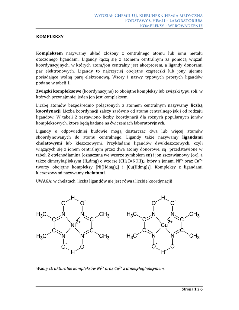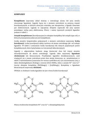 Wydział Chemii UJ, kierunek Chemia medyczna Podstawy Chemii - Laboratorium kompleksy - wprowadzenie KOMPLEKSY Kompleksem nazywamy układ złożony z centralnego atomu lub jonu metalu otoczonego ligandami. Ligandy łączą się z atomem centralnym za pomocą wiązań koordynacyjnych, w których atom/jon centralny jest akceptorem, a ligandy donorami par elektronowych. Ligandy to najczęściej obojętne cząsteczki lub jony ujemne posiadające wolną parę elektronową. Wzory i nazwy typowych prostych ligandów podano w tabeli 1. Związki kompleksowe (koordynacyjne) to obojętne kompleksy lub związki typu soli, w których przynajmniej jeden jon jest kompleksem. Liczbę atomów bezpośrednio połączonych z atomem centralnym nazywamy liczbą koordynacji. Liczba koordynacji zależy zarówno od atomu centralnego jak i od rodzaju ligandów. W tabeli 2 zestawiono liczby koordynacji dla różnych popularnych jonów kompleksowych, które będą badane na ćwiczeniach laboratoryjnych. Ligandy o odpowiedniej budowie mogą dostarczać dwa lub więcej atomów skoordynowanych do atomu centralnego. Ligandy takie nazywamy ligandami chelatowymi lub kleszczowymi. Przykładami ligandów dwukleszczowych, czyli wiążących się z jonem centralnym przez dwa atomy donorowe, są przedstawione w tabeli 2 etylenodiamina (oznaczana we wzorze symbolem en) i jon szczawianowy (ox), a także dimetyloglioksym (H2dmg) o wzorze (CH3C=NOH)2, który z jonami Ni2+ oraz Cu2+ tworzy obojętne kompleksy [Ni(Hdmg)2] i [Cu(Hdmg)2]. Kompleksy z ligandami kleszczowymi nazywamy chelatami. UWAGA: w chelatach liczba ligandów nie jest równa liczbie koordynacji! Wzory strukturalne kompleksów Ni2+ oraz Cu2+ z dimetyloglioksymem. Strona 1 z 6 Wydział Chemii UJ, kierunek Chemia medyczna Podstawy Chemii - Laboratorium kompleksy - wprowadzenie Tabela 1 Przykłady typowych ligandów (w nawiasie alternatywne nazwy); podkreślony atom donorowy. UWAGA: Nazwa liganda najczęściej nie jest tożsama z nazwą związku/jonu! Wzór Nazwa liganda Wzór Nazwa liganda H2O akwa OH− hydrokso NH3 amina O2− okso CO karbonyl S2− sulfido (tio) NO nitrozyl NCS− tiocyjaniano-N Cl− chloro SCN− tiocyjaniano-S F− fluoro CN− cyjano NO3− azotano(V) CO32− węglano NO2− azotano(III)-N ONO− azotano(III)-O (nitrito-N) H2N-CH2-CH2-NH2 en (nitrito-O) etylenodiamina (COO)22− (1,2-diaminoetan) szczawiano ox (oksalato) Tabela 2 Liczba koordynacji w wybranych kompleksach typu [MLn] w roztworach wodnych. LIGAND H2O OH− Al3+ 6 4 Cu2+ 6 4 4 4 Co2+ 6 6 4 4 4 Cr3+ 6 6 6 6 6 Fe3+ 6 4 6 6 Ni2+ 6 Zn2+ 6 6 NH3 Cl− NCS− 6 6 4 F− 4 4 4 4 Strona 2 z 6 Wydział Chemii UJ, kierunek Chemia medyczna Podstawy Chemii - Laboratorium kompleksy - wprowadzenie Zasady zapisywania wzorów i nazewnictwa związków kompleksowych Wzór kompleksu zapisujemy w nawiasach kwadratowych podając najpierw symbol metalu a następnie wzory ligandów (wieloatomowe ligandy w nawiasach okrągłych) w kolejności alfabetycznej (według symboli). Poza nawiasem kwadratowym zapisujemy ładunek jonu kompleksowego. We wzorze związku kompleksowego, podobnie jak dla soli, zapisujemy najpierw kation potem anion. W nazwie kompleksu wymieniamy najpierw ligandy w kolejności alfabetycznej (według nazw) poprzedzone przedrostkami określającymi ich ilość, podanymi w tabeli 3. Następnie zapisujemy nazwę metalu: w mianowniku dla kompleksów obojętnych, w dopełniaczu dla kompleksów dodatnich oraz z przyrostkiem -an/-ian dla kompleksów ujemnych, oraz jego stopień utlenienia (cyfrą rzymską w nawiasie bez spacji). W związkach koordynacyjnych podajemy najpierw nazwę anionu potem kationu. Tabela 3 Przedrostki określające liczbę ligandów. liczba ligandów przedrostek forma długa (dla ligandów chelatowych) 2 di bis 3 tri tris 4 tetra tetrakis 5 penta pentakis 6 heksa heksakis Przykłady wzorów i nazw: [Cr(H2O)4(NO3)2]+ kation tetraakwadiazotano(V)chromu(III) [Fe(H2O)(NCS)5]2− anionakwapenta(tiocyjaniano-N)żelazianowy(III) kompleksy [Ni(en)3]2+ kation tris(etylenodiamina)niklu(II) [PtCl2(NH3)2] diaminadichloroplatyna(II) [Mn(H2O)6]SO4 siarczan(VI) heksaakwamanganu(II) związki [CoCl2(NH3)4]Cl chlorek teraaminadichlorokobaltu(III) kompleksowe Na2[Zn(OH)4] tetrahydroksocynkan sodu (koordynacyjne) K4[Fe(CN)6] heksacyjanożelazian(II) potasu Strona 3 z 6 Wydział Chemii UJ, kierunek Chemia medyczna Podstawy Chemii - Laboratorium kompleksy - wprowadzenie Równowagi w roztworach związków kompleksowych Większość jonów metali, np. Fe3+, Cu2+, Cr3+, Al3+, Zn2+ w roztworach wodnych i w krystalicznych hydratach występuje w postaci akwakompleksów. Przedstawiając równania reakcji w roztworach wodnych najczęściej używamy zapisu uproszczonego np. Ni2+ - trzeba jednak pamiętać, że w rzeczywistości oznacza on [Ni(H2O)6]2+. Wodne roztwory soli wielu metali wykazują odczyn kwasowy, co spowodowane jest reakcją deprotonacji skoordynowanych cząsteczek wody, np.: [Cr(H2O)6]3+ + H2O ⇄ [Cr(H2O)5(OH)]2+ + H3O+ K1 (1) [Cr(H2O)5(OH)]2+ + H2O ⇄ [Cr(H2O)4(OH)2]+ + H3O+ K2 (2) przy czym K1 >> K2. Obecność jonów OH¯ w roztworze powoduje przesunięcie równowagi reakcji w prawo, co w konsekwencji powoduje wytrącenie osadów akwahydroksokompleksów, w których liczba cząsteczek wody nie jest ściśle ustalona. W formie skróconej zapisujemy je w postaci wodorotlenków lub uwodnionych tlenków, np. Ni(OH)2, Cu(OH)2, Al(OH)3, Cr(OH)2, Cr2O3·nH2O, Fe2O3·nH2O. W przypadku wodorotlenków amfoterycznych w obecności nadmiaru jonów OH¯ zachodzi dalsza deprotonacja cząsteczek wody i tworzą się rozpuszczalne hydroksokompleksy, np. ¯ [Zn(H2O)6]2+ ⇄ Zn(OH)2aq ¯ ⇄ [Zn(OH)4]2− (3) Reakcje tworzenia hydroksokompleksów są odwracalne i w obecności jonów H3O+ następuje protonacja jonów OH¯ prowadząca w kwaśnym roztworze do odtworzenia akwakompleksu. Podobnie jak w przypadku hydroksokompleksów, tworzenie aminakompleksów ze względu na zasadowy charakter wodnego roztwor