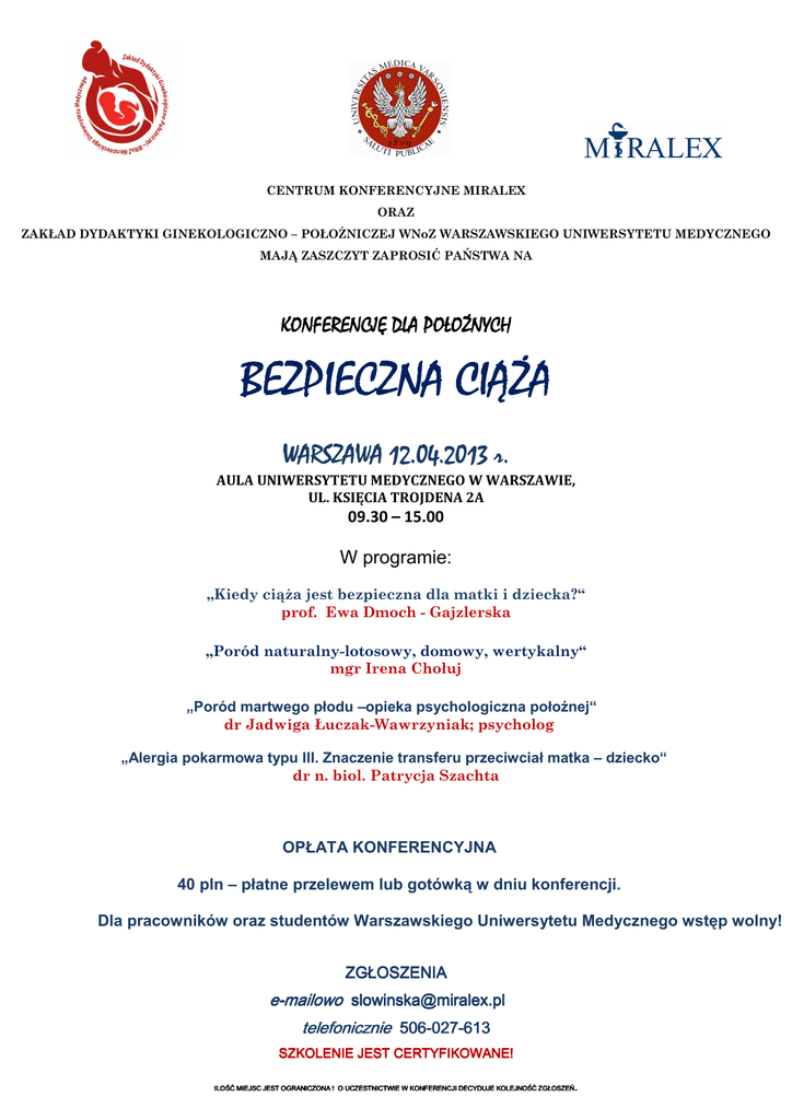 CENTRUM KONFERENCYJNE MIRALEX ORAZ ZAKŁAD DYDAKTYKI GINEKOLOGICZNO – POŁOŻNICZEJ WNoZ WARSZAWSKIEGO UNIWERSYTETU MEDYCZNEGO MAJĄ ZASZCZYT ZAPROSIĆ PAŃSTWA NA KONFERENCJĘ DLA POŁOŻNYCH BEZPIECZNA CIĄŻA WARSZAWA 12.04. 12.04.2013 r. AULA UNIWERSYTETU MEDYCZNEGO W WARSZAWIE, UL. KSIĘCIA TROJDENA 2A 09.30 – 15.00 W programie: „Kiedy ciąża jest bezpieczna dla matki i dziecka?“ prof. Ewa Dmoch - Gajzlerska „Poród naturalny-lotosowy, domowy, wertykalny“ mgr Irena Chołuj „Poród martwego płodu –opieka psychologiczna położnej“ dr Jadwiga Łuczak-Wawrzyniak; psycholog „Alergia pokarmowa typu III. Znaczenie transferu przeciwciał matka – dziecko“ dr n. biol. Patrycja Szachta OPŁATA KONFERENCYJNA 40 pln – płatne przelewem lub gotówką w dniu konferencji. Dla pracowników oraz studentów Warszawskiego Uniwersytetu Medycznego wstęp wolny! ZGŁOSZENIA e-mailowo [email protected] [email protected] telefonicznie 506506-027027-613 SZKOLENIE JEST CERTYFIKOWANE! CERTYFIKOWANE! . ILOŚĆ MIEJSC JEST OGRANICZONA ! O UCZESTNICTWIE W KONFERENCJI DECYDUJE KOLEJNOŚĆ ZGŁOSZEŃ