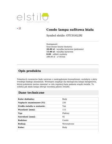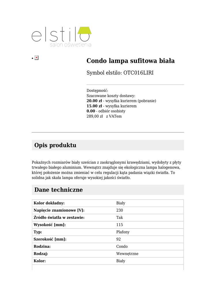 Condo lampa sufitowa biała ● Symbol elstilo: OTC016LIRI Dostępność: Szacowane koszty dostawy: 20.00 zł - wysyłka kurierem (pobranie) 15.00 zł - wysyłka kurierem 0.00 - odbiór osobisty 289,00 zł z VATem Opis produktu Pokaźnych rozmiarów biały sześcian z zaokrąglonymi krawędziami, wydobyty z płyty trwałego białego aluminium. Wewnątrz znajduje się ekologiczna lampa halogenowa, której położenie można zmieniać w celu regulacji kąta padania wiązki światła. To solidna jak skała lampa oferuje wysokiej jakości światło. Dane techniczne Kolor dokładny: Biały Napięcie znamionowe [V]: 230 Źródło światła w zestawie: Tak Wysokość [mm]: 115 Typ: Plafony Szerokość [mm]: 92 Rodzina: Condo Rodzaj: Wewnętrzne Kolor: Biały Ilość źródeł światła: 1 EEL - klasa energetyczna żarówki: D Długość [mm]: 144