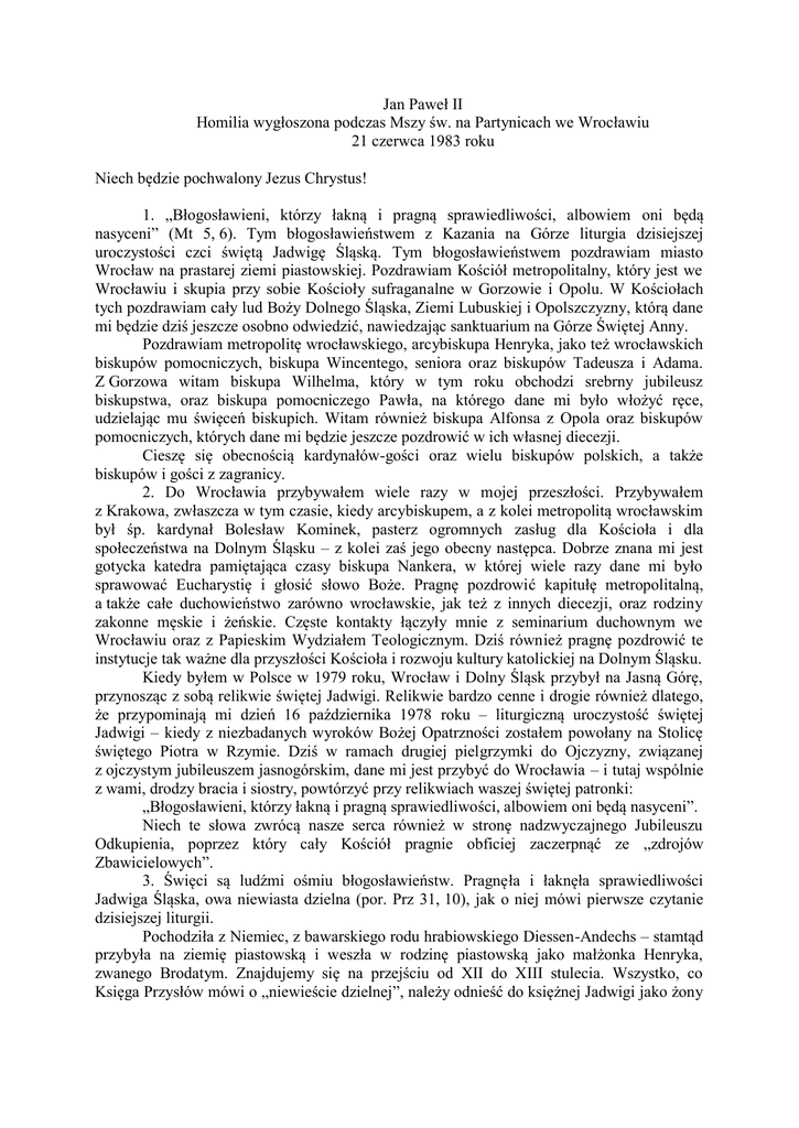 Jan Paweł II Homilia wygłoszona podczas Mszy św. na Partynicach we Wrocławiu 21 czerwca 1983 roku Niech będzie pochwalony Jezus Chrystus! 1. „Błogosławieni, którzy łakną i pragną sprawiedliwości, albowiem oni będą nasyceni” (Mt 5, 6). Tym błogosławieństwem z Kazania na Górze liturgia dzisiejszej uroczystości czci świętą Jadwigę Śląską. Tym błogosławieństwem pozdrawiam miasto Wrocław na prastarej ziemi piastowskiej. Pozdrawiam Kościół metropolitalny, który jest we Wrocławiu i skupia przy sobie Kościoły sufraganalne w Gorzowie i Opolu. W Kościołach tych pozdrawiam cały lud Boży Dolnego Śląska, Ziemi Lubuskiej i Opolszczyzny, którą dane mi będzie dziś jeszcze osobno odwiedzić, nawiedzając sanktuarium na Górze Świętej Anny. Pozdrawiam metropolitę wrocławskiego, arcybiskupa Henryka, jako też wrocławskich biskupów pomocniczych, biskupa Wincentego, seniora oraz biskupów Tadeusza i Adama. Z Gorzowa witam biskupa Wilhelma, który w tym roku obchodzi srebrny jubileusz biskupstwa, oraz biskupa pomocniczego Pawła, na którego dane mi było włożyć ręce, udzielając mu święceń biskupich. Witam również biskupa Alfonsa z Opola oraz biskupów pomocniczych, których dane mi będzie jeszcze pozdrowić w ich własnej diecezji. Cieszę się obecnością kardynałów-gości oraz wielu biskupów polskich, a także biskupów i gości z zagranicy. 2. Do Wrocławia przybywałem wiele razy w mojej przeszłości. Przybywałem z Krakowa, zwłaszcza w tym czasie, kiedy arcybiskupem, a z kolei metropolitą wrocławskim był śp. kardynał Bolesław Kominek, pasterz ogromnych zasług dla Kościoła i dla społeczeństwa na Dolnym Śląsku – z kolei zaś jego obecny następca. Dobrze znana mi jest gotycka katedra pamiętająca czasy biskupa Nankera, w której wiele razy dane mi było sprawować Eucharystię i głosić słowo Boże. Pragnę pozdrowić kapitułę metropolitalną, a także całe duchowieństwo zarówno wrocławskie, jak też z innych diecezji, oraz rodziny zakonne męskie i żeńskie. Częste kontakty łączyły mnie z seminarium duchownym we Wrocławiu oraz z Papieskim Wydziałem Teologicznym. Dziś również pragnę pozdrowić te instytucje tak ważne dla przyszłości Kościoła i rozwoju kultury katolickiej na Dolnym Śląsku. Kiedy byłem w Polsce w 1979 roku, Wrocław i Dolny Śląsk przybył na Jasną Górę, przynosząc z sobą relikwie świętej Jadwigi. Relikwie bardzo cenne i drogie również dlatego, że przypominają mi dzień 16 października 1978 roku – liturgiczną uroczystość świętej Jadwigi – kiedy z niezbadanych wyroków Bożej Opatrzności zostałem powołany na Stolicę świętego Piotra w Rzymie. Dziś w ramach drugiej pielgrzymki do Ojczyzny, związanej z ojczystym jubileuszem jasnogórskim, dane mi jest przybyć do Wrocławia – i tutaj wspólnie z wami, drodzy bracia i siostry, powtórzyć przy relikwiach waszej świętej patronki: „Błogosławieni, którzy łakną i pragną sprawiedliwości, albowiem oni będą nasyceni”. Niech te słowa zwrócą nasze serca również w stronę nadzwyczajnego Jubileuszu Odkupienia, poprzez który cały Kościół pragnie obficiej zaczerpnąć ze „zdrojów Zbawicielowych”. 3. Święci są ludźmi ośmiu błogosławieństw. Pragnęła i łaknęła sprawiedliwości Jadwiga Śląska, owa niewiasta dzielna (por. Prz 31, 10), jak o niej mówi pierwsze czytanie dzisiejszej liturgii. Pochodziła z Niemiec, z bawarskiego rodu hrabiowskiego Diessen-Andechs – stamtąd przybyła na ziemię piastowską i weszła w rodzinę piastowską jako małżonka Henryka, zwanego Brodatym. Znajdujemy się na przejściu od XII do XIII stulecia. Wszystko, co Księga Przysłów mówi o „niewieście dzielnej”, należy odnieść do księżnej Jadwigi jako żony i matki. Z kolei zaś jako do wdowy – stąd też drugie czytanie liturgiczne mówi dzisiaj o wdowieństwie. We wdowieństwie już odkryła, że poprzez powołanie małżeńskie i macierzyńskie Chrystus przygotował ją do innego jeszcze powołania, przez które miała do końca wypełnić wolę Bożą, stając się – przez całkowite i wyłączne oddanie Boskiemu Oblubieńcowi w przyjęciu stylu życia zakonnego – siostrą i matką Chrystusa, stosownie do Jego własnych słów: „Kto pełni wolę Bożą, ten Mi jest bratem, siostrą i matką” (Mk 3, 35). Słowa te czytamy w dzisiejszej Ewangelii. Jadwiga wypełniła do końca wolę Bożą, stając się w Duchu Świętym „siostrą i matką” samego Chrystusa. A to jej – Jadwigi – duchowe macierzyństwo miało się w szczególny sposób wypełnić i potwierdzić w stosunku do własnego syna: Henryka, zwanego Pobożnym. Poległ on – jak wszyscy wiemy – w nierównej walce pod Legnicą z Tatarami, którzy wtedy (w pierwszej połowie XIII wieku) zapuścili swe wojownicze zagony daleko na zachód, przez całą ziemię polską. Henryk Pobożny legł na placu boju pod Legnicą, ale Tatarzy dalej na zachód już nie poszli, owszem, cofnęli się ku wschodowi, uwalniając ziemie piastowskie ze swego jarzma. Można powiedzieć, że już wówczas Polska stała się „przedmurzem chrześcijaństwa”. Matka Jadwiga przeżywała w duchu wiary śmierć syna Henryka, podobna w tym do Bogarodzicy, która u stóp krzyża na Kalwarii składała ofiarę ze swego Boskiego Syna dla zbawienia świata. W ten sposób też weszła święta Jadwiga Śląska w dzieje Polski i w dzieje Europy. 4. W dziejach tych stoi ona jakby postać graniczna, która łączy ze sobą dwa narody: naród niemiecki i naród polski. Łączy na przestrzeni wielu wieków historii, która była trudna i bolesna. Święta Jadwiga wśród wszystkich dziejowych doświadczeń pozostaje przez siedem już stuleci orędowniczką wzajemnego zrozumienia i pojednania, stosownie do wymagań prawa narodu, międzynarodowej sprawiedliwości i pokoju. Można powiedzieć, że to również za jej wstawiennictwem Stolica A