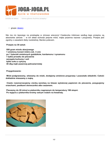 ścieżka do tekstu: / strona główna /kuchnia /przepisy / grupa: desery Nie ma nic lepszego na przekąskę w zimowe wieczory! Ciasteczka imbirowe według tego przepisu są absolutnie zdrowe w ich skład wchodzi jedynie miód, mąka pszenna razowa i przyprawy. Przepis jest zgodny z zasadami diety rozdzielnej. Bardzo polecam. Przepis na 30 sztuk: 500 gram miodu akacjowego 1 zmielony korzeń imbiru (ok. 3 cm) po 1 łyżeczki zmielonych goździków, kardamonu i cynamonu 1 łyżka proszku do pieczenia szczypta kurkumy i soli łyżka soku z cytryny 40 dkg mąki pszennej pełnoziarnistej Przygotowanie: Miód podgrzewamy, wlewamy do miski, dodajemy zmielone przyprawy i pozostałe składniki. Całość dokładnie mieszamy z mąką. Ciasto rozsmarowujemy cienką warstwą na blasze wyłożonej papierem do pieczenia, posypujemy orzechami, pestkami słonecznika albo sezamem. Pieczemy do 20 minut w piekarniku nagrzanym do temperatury 180 stopni. Po wyjęciu z piekarnika kroimy ostrym nożem na kwadraty. 1/2 data wydruku: środa, 8 marca 2017 roku 17:12:31 adres dokumentu: http://www.joga-joga.pl//index.php?LANG=pl&page_ID=139&art_ID=163 2/2