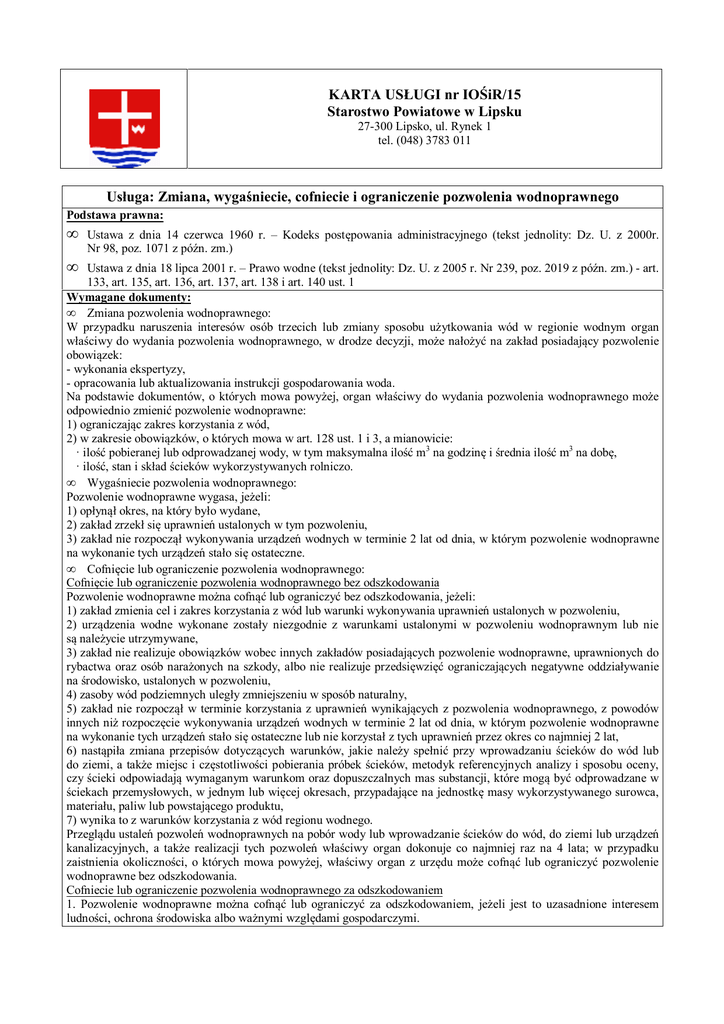 KARTA USŁUGI nr IOŚiR/15 Starostwo Powiatowe w Lipsku Usługa