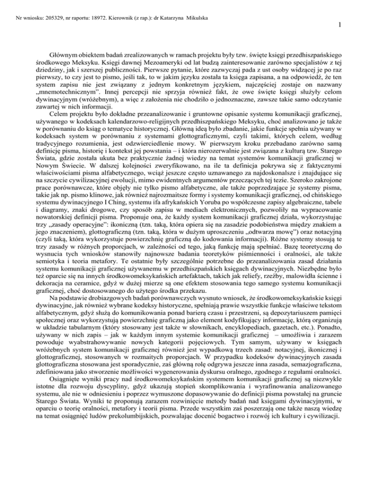 Nr wniosku: 205329, nr raportu: 18972. Kierownik (z rap.): dr Katarzyna Mikulska 1 Głównym obiektem badań zrealizowanych w ramach projektu były tzw. święte księgi przedhiszpańskiego środkowego Meksyku. Księgi dawnej Mezoameryki od lat budzą zainteresowanie zarówno specjalistów z tej dziedziny, jak i szerszej publiczności. Pierwsze pytanie, które zazwyczaj pada z ust osoby widzącej je po raz pierwszy, to czy jest to pismo, jeśli tak, to w jakim języku została ta księga zapisana, a na odpowiedź, że ten system zapisu nie jest związany z jednym konkretnym językiem, najczęściej zostaje on nazwany „mnemotechnicznym”. Innej percepcji nie sprzyja również fakt, że owe święte księgi służyły celom dywinacyjnym (wróżebnym), a więc z założenia nie chodziło o jednoznaczne, zawsze takie samo odczytanie zawartej w nich informacji. Celem projektu było dokładne przeanalizowanie i gruntowne opisanie systemu komunikacji graficznej, używanego w kodeksach kalendarzowo-religijnych przedhiszpańskiego Meksyku, choć analizowano je także w porównaniu do ksiąg o tematyce historycznej. Główną ideą było zbadanie, jakie funkcje spełnia używany w kodeksach system w porównaniu z systemami glottograficznymi, czyli takimi, których celem, według tradycyjnego rozumienia, jest odzwierciedlenie mowy. W pierwszym kroku przebadano zarówno samą definicję pisma, historię i kontekst jej powstania – i która nierozerwalnie jest związana z kulturą tzw. Starego Świata, gdzie została ukuta bez praktycznie żadnej wiedzy na temat systemów komunikacji graficznej w Nowym Świecie. W dalszej kolejności zweryfikowano, na ile ta definicja pokrywa się z faktycznymi właściwościami pisma alfabetycznego, wciąż jeszcze często uznawanego za najdoskonalsze i znajdujące się na szczycie cywilizacyjnej ewolucji, mimo ewidentnych argumentów przeczących tej tezie. Szeroko zakrojone prace porównawcze, które objęły nie tylko pismo alfabetyczne, ale także poprzedzające je systemy pisma, takie jak np. pismo klinowe, jak również najrozmaitsze formy i systemy komunikacji graficznej, od chińskiego systemu dywinacyjnego I Ching, systemu ifa afrykańskich Yoruba po współczesne zapisy algebraiczne, tabele i diagramy, znaki drogowe, czy sposób zapisu w mediach elektronicznych, pozwoliły na wypracowanie nowatorskiej definicji pisma. Proponuje ona, że każdy system komunikacji graficznej działa, wykorzystując trzy „zasady operacyjne”: ikoniczną (tzn. taką, która opiera się na zasadzie podobieństwa między znakiem a jego znaczeniem), glottograficzną (tzn. taką, która w dużym uproszczeniu „odtwarza mowę”) oraz notacyjną (czyli taką, która wykorzystuje powierzchnię graficzną do kodowania informacji). Różne systemy stosują te trzy zasady w różnych proporcjach, w zależności od tego, jaką funkcję mają spełniać. Bazę teoretyczną do wysnucia tych wniosków stanowiły najnowsze badania teoretyków piśmienności i oralności, ale także semiotyka i teoria metafory. Te ostatnie były szczególnie potrzebne do przeanalizowania zasad działania systemu komunikacji graficznej używanemu w przedhiszpańskich księgach dywinacyjnych. Niezbędne było też oparcie się na innych środkowomeksykańskich artefaktach, takich jak reliefy, rzeźby, malowidła ścienne i dekoracja na ceramice, gdyż w dużej mierze są one efektem stosowania tego samego systemu komunikacji graficznej, choć dostosowanego do użytego środka przekazu. Na podstawie drobiazgowych badań porównawczych wysnuto wniosek, że środkowomeksykańskie księgi dywinacyjne, jak również wybrane kodeksy historyczne, spełniają prawie wszystkie funkcje właściwe tekstom alfabetycznym, gdyż służą do komunikowania ponad barierą czasu i przestrzeni, są depozytariuszem pamięci społecznej oraz wykorzystują powierzchnię graficzną jako element kodyfikujący informację, którą organizują w układzie tabularnym (który stosowany jest także w słownikach, encyklopediach, gazetach, etc.). Ponadto, używany w nich zapis – jak w każdym innym systemie komunikacji graficznej – umożliwia i zarazem powoduje wyabstrahowywanie nowych kategorii pojęciowych. Tym samym, używany w księgach wróżebnych system komunikacji graficznej również jest wypadkową trzech zasad: notacyjnej, ikonicznej i glottograficznej, stosowanych w rozmaitych proporcjach. W przypadku kodeksów dywinacyjnych zasada glottograficzna stosowana jest sporadycznie, zaś główną rolę odgrywa jeszcze inna zasada, semazjograficzna, zdefiniowana jako stworzenie możliwości wygenerowania dyskursu oralnego, zgodnego z regułami oralności. Osiągnięte wyniki pracy nad środkowomeksykańskim systemem komunikacji graficznej są niezwykle istotne dla rozwoju dyscypliny, gdyż ukazują stopień skomplikowania i wyrafinowania analizowanego systemu, ale nie w odniesieniu i poprzez wymuszone dopasowywanie do definicji pisma powstałej na gruncie Starego Świata. Wyniki te proponują zarazem rozwinięcie metody badań nad księgami dywinacyjnymi, w oparciu o teorię oralności, metafory i teorii pisma. Przede wszystkim zaś poszerzają one także naszą wiedzę na temat osiągnięć ludów prekolumbijskich, pozwalając docenić bogactwo i rozwój ich kultury i cywilizacji.