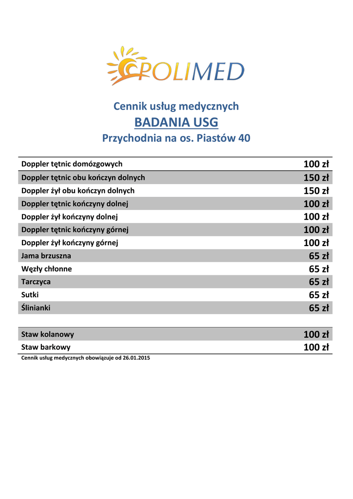 Cennik usług medycznych BADANIA USG Przychodnia na os. Piastów 40 Doppler tętnic domózgowych Doppler tętnic obu kończyn dolnych Doppler żył obu kończyn dolnych Doppler tętnic kończyny dolnej Doppler żył kończyny dolnej Doppler tętnic kończyny górnej Doppler żył kończyny górnej Jama brzuszna Węzły chłonne Tarczyca Sutki Ślinianki Staw kolanowy Staw barkowy Cennik usług medycznych obowiązuje od 26.01.2015 100 zł 150 zł 150 zł 100 zł 100 zł 100 zł 100 zł 65 zł 65 zł 65 zł 65 zł 65 zł 100 zł 100 zł