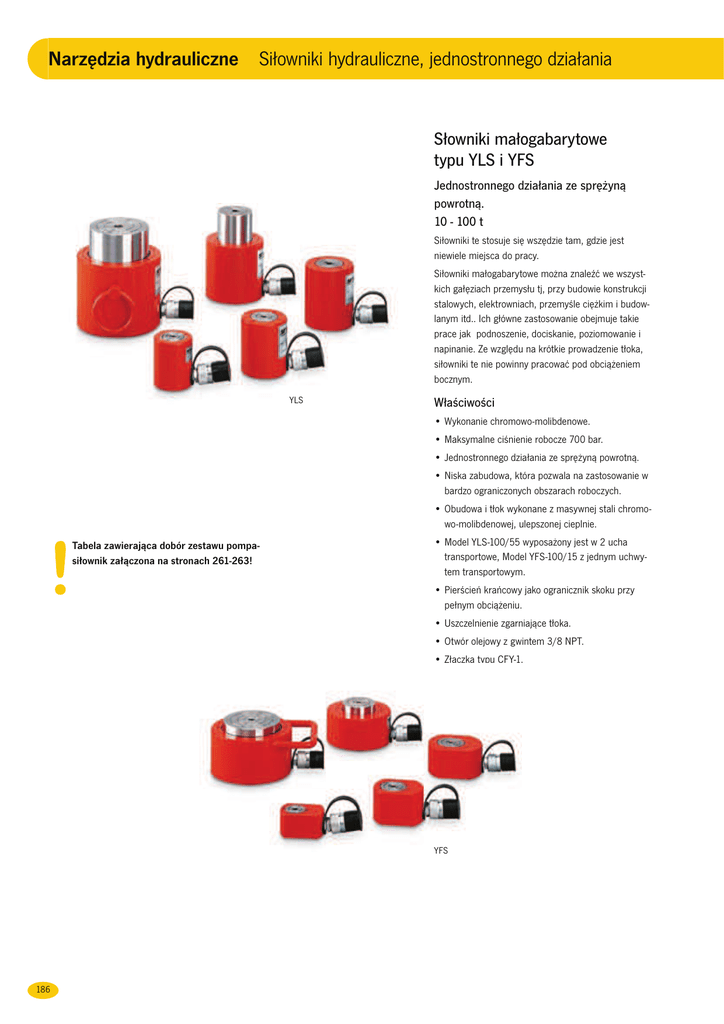 Narzędzia hydrauliczne Siłowniki hydrauliczne, jednostronnego działania Słowniki małogabarytowe typu YLS i YFS Jednostronnego działania ze sprężyną powrotną. 10 - 100 t Siłowniki te stosuje się wszędzie tam, gdzie jest niewiele miejsca do pracy. Siłowniki małogabarytowe można znaleźć we wszystkich gałęziach przemysłu tj, przy budowie konstrukcji stalowych, elektrowniach, przemyśle ciężkim i budowlanym itd.. Ich główne zastosowanie obejmuje takie prace jak podnoszenie, dociskanie, poziomowanie i napinanie. Ze względu na krótkie prowadzenie tłoka, siłowniki te nie powinny pracować pod obciążeniem bocznym. YLS Właściwości • Wykonanie chromowo-molibdenowe. • Maksymalne ciśnienie robocze 700 bar. • Jednostronnego działania ze sprężyną powrotną. • Niska zabudowa, która pozwala na zastosowanie w bardzo ograniczonych obszarach roboczych. • Obudowa i tłok wykonane z masywnej stali chromowo-molibdenowej, ulepszonej cieplnie. Tabela zawierająca dobór zestawu pompasiłownik załączona na stronach 261-263! • Model YLS-100/55 wyposażony jest w 2 ucha transportowe, Model YFS-100/15 z jednym uchwytem transportowym. • Pierścień krańcowy jako ogranicznik skoku przy pełnym obciążeniu. • Uszczelnienie zgarniające tłoka. • Otwór olejowy z gwintem 3/8 NPT. • Złączka typu CFY-1. YFS 186 Siłowniki hydrauliczne, jednostronnego działania Narzędzia hydrauliczne Dane techniczne modelu YLS Nośność Model EAN-Nr. 4025092* Maksymalny napór Skok kN mm cm2 100 200 300 500 1.000 35 45 60 60 55 14,3 28,6 42,9 71,5 143,0 Maksymalny napór Skok kN mm cm2 100 200 300 500 1.000 11 15 15 15 15 14,3 28,6 44,2 71,5 143,0 t 10 20 30 50 100 YLS-10/35 YLS-20/45 YLS-30/60 YLS-50/60 YLS-100/55 *150804 *150811 *150828 *150835 *150842 średnica zewnętrzna siłownika mm Masa cm3 Wysokość minimalna siłownika mm 51 128 266 426 788 86 100 120 122 141 70 85 100 125 170 2,5 4,0 6,5 10,4 24,0 średnica zewnętrzna siłownika mm Masa cm3 Wysokość minimalna siłownika mm 16 31 66 107 215 43 60 60 70 91 56 76 96 145 170 1,5 3,0 4,2 8,7 16,0 Powierzchnia Maksymalna robocza tłoka objętość oleju kg Dane techniczne modelu YFS Nośność Model EAN-Nr. 4025092* t 10 20 30 50 100 YFS-10/11 YFS-20/15 YFS-30/15 YFS-50/15 YFS-100/15 *150750 *150767 *150774 *150781 *150798 Powierzchnia Maksymalna robocza tłoka objętość oleju kg Wymiary modelu YLS i modelu YFS YLS-20/45 YLS-30/60 YLS-50/60 YLS-100/55 YFS-10/11 YFS-20/15 YFS-30/15 YFS-50/15 YFS-100/15 86 121 70 – 43 38 16 – – 54 – 10 100 145 85 – 60 50 17 – – 54 – 10 120 180 100 – 75 57 19 – – 54 – 5 122 182 125 – 95 75 19 – – 54 – 5 141 196 170 – 135 120 26 148 – 54 25 – 43 54 56 83 43 38 16 – 28 54 – 10 60 75 76 95 60 50 19 – 38 54 – 5 60 75 96 115 75 57 19 – 48 54 – 5 70 85 145 – 95 75 19 – – 54 – 5 91 106 170 – 135 120 22 85 – 54 55 – E E F F 0,5 0,5 A, mm B, mm D, mm D1, mm E, mm F, mm H, mm M, mm Q, mm R, mm S, mm Z, ° YLS-10/35 E Ø 32 D A D Model YLS R D R H H H Z Z A G G A F B B B 0,5 M S G Model Q D1 R Model YFS 187