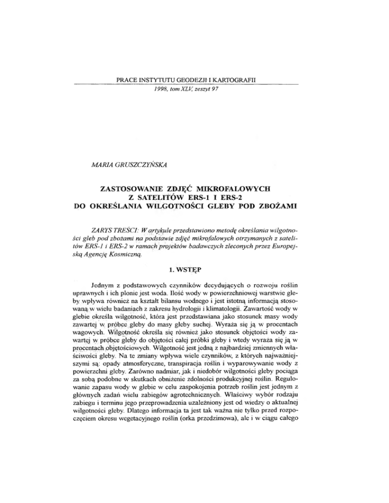 PRACE INSTYTUTU GEODEZJI I KARTOGRAFII 1998, tom XLV, zeszyt 9 7 MARIA GRUSZCZYŃSKA Z A ST O SO W A N IE ZD JĘ Ć M IK R O F A L O W Y C H Z SA TEL ITÓ W E R S-1 I E R S-2 D O O K R E Ś L A N IA W IL G O T N O ŚC I G L E B Y PO D Z B O Ż A M I ZARYS TREŚCI: W artykule przedstawiono metodą określania wilgotno ści gleb p o d zbożami na podstawie zdjąć mikrofalowych otrzymanych z sateli tów ERS-1 i ERS-2 w ramach projektów badawczych zleconych przez Europej ską Agencją Kosmiczną. 1. WSTĘP Jednym z podstawowych czynników decydujących o rozwoju roślin uprawnych i ich plonie jest woda. Ilość wody w powierzchniowej warstwie gle by wpływa również na kształt bilansu wodnego i jest istotną informacją stosow anąw wielu badaniach z zakresu hydrologii i klimatologii. Zawartość wody w glebie określa wilgotność, która jest przedstawiana jako stosunek masy wody zawartej w próbce gleby do masy gleby suchej. Wyraża się ją w procentach wagowych. Wilgotność określa się również jako stosunek objętości wody za wartej w próbce gleby do objętości całej próbki gleby i wtedy wyraża się ją w procentach objętościowych. Wilgotność jest jedną z najbardziej zmiennych wła ściwości gleby. Na te zmiany wpływa wiele czynników, z których najważniej szymi są: opady atmosferyczne, transpiracja roślin i wyparowywanie wody z powierzchni gleby. Zarówno nadmiar, jak i niedobór wilgotności gleby pociąga za sobą podobne w skutkach obniżenie zdolności produkcyjnej roślin. Regulo wanie zapasu wody w glebie w celu zaspokojenia potrzeb roślin jest jednym z głównych zadań wielu zabiegów agrotechnicznych. Właściwy wybór rodzaju zabiegu i terminu jego przeprowadzenia uzależniony jest od wiedzy o aktualnej wilgotności gleby. Dlatego informacja ta jest tak ważna nie tylko przed rozpo częciem okresu wegetacyjnego roślin (orka przedzimowa), ale i w ciągu całego 118 Maria Gruszczyńska okresu jego trwania aż do zbiorów. Pomiary wilgotności gleby powinny być zatem prowadzone w sposób dynamiczny. Konieczność przeprowadzenia w sto sunkowo krótkim czasie dużej liczby oznaczeń stawia metodom oznaczania wilgotności gleby duże wymagania - muszą one być proste, szybkie i dostatecz nie dokładne. 2. METODY OZNACZANIA WILGOTNOŚCI GLEBY Obecnie stosowane metody oznaczania wilgotności gleby można podzie lić na metody bezpośrednie i pośrednie (Roszak [1997]). Metody bezpośrednie polegają na bezpośrednim oznaczaniu ilości wody zawartej w próbce gleby po branej z badanego pola. Próbki pobiera się z określonych głębokości za pomocą świdra glebowego lub specjalnej laski i umieszcza się je w hermetycznie za mkniętych naczyniach. Do tej grupy metod zalicza się m. in. metodę suszarkowo-wagową i metodę Boyoucosa (spalanie alkoholu). Metody pośrednie pole gają na oznaczaniu wilgotności gleby na podstawie pomiaru pewnych jej wła ściwości fizycznych, które zmieniają się w zależności od ilości wody zawartej w glebie. Pomiary wilgotności gleby za pomocą tych metod wykonuje się naj częściej bezpośrednio w polu w warunkach naturalnych. Do tej grupy zalicza się metody oparte na pomiarze przewodnictwa prądu elektrycznego (metoda elektrometryczna), na pomiarze prędkości przepływu fali elektromagnetycznej w zakresie mikrofal (metoda elektromagnetyczna, tzw. TD R - Time Domain Reflectometry), na pomiarze siły ssącej gleby za pomocą tensjometrów (meto da tensjometryczna), na pomiarze liczby "spowolnionych" neutronów przez ato my wodoru znajdujące się w wodzie glebowej (metoda neutronowa) i ostatnio coraz częściej na podstawie technik teledetekcji. Pracochłonność i kosztowność tradycyjnych metod czyni je nieprzydat nymi w przypadku konieczności wykonywania pomiarów z dużą częstotliwo ścią, odpowiadającą czasowej zmienności wilgotności gleby w ciągu okresu wegetacyjnego. Spośród wielu metod oznaczania wilgotności gleby jedynie metody teledetekcji pozwalają na określenie przestrzennego rozkładu tego pa rametru na dowolnie dużym obszarze, w krótkim czasie i za względnie niską cenę (Byme [1981], Idso [1969], Jackson [1982], Moran [1994]). Metody te oparte są na rejestracji promieniowania elektromagnetycznego z pewnej odle głości od powierzchni ziemi, np. z pułapu lotniczego lub satelitarnego (Ciol kosz [1978]). W śród wielu zakresów promieniowania elektromagnetycznego dostępnych do prowadzenia obserwacji powierzchni ziemi z odległości, mikro fale posiadają największy potencjał do określania wilgotności gleby, ponieważ wnikają w głąb gleby na głębokość zależną od długości fali - im dłuższa fala, tym większa głębokość penetracji (Ulaby [1982]). Poza tym promieniowanie mikrofalowe przenika przez chmury, co jest szczególnie ważne w przypadku wykonywania pomiarów wielokrotnych w ściśle określonych terminach okresu Zastosowanie zdjąć mikrofalowych. 119 wegetacyjnego. Jednak podstawową cechą, dzięki której możliwe jest stosowa nie mikrofal do oceny wilgotności gleby jest ich reakcja na wielkość stałej die lektrycznej gleby, która jest w ścisłym związku z ilością zawartej w niej wody. Stała dielektryczna gleb mokrych może być dziesięć razy większa od stałej die lektrycznej gleb suchych, która w tym przypadku wynosi około 3,5 (stała die lektryczna wody wynosi około 80). Właściwość ta spowodowała zainteresowa nie naukowców badaniami wilgotności gleby za pomocą mikrofal już od mo mentu udostępnienia techniki radarowej do celów cywilnych (lata sześćdziesią te naszego stulecia). 3. SZORSTKOŚĆ POWIERZCHNI - WSKAŹNIK LAI Z wielu dotychczas przeprowadzonych badań wynika, że współczynnik rozpraszania wstecznego (wyrażający natężenie odbitego od badanej powierzchni promieniowania mikrofalowego) otrzymany ze zdjęć radarowych, tzw. cr°, w zra sta wraz ze wzrostem wilgotności gleby i zależy również od szorstkości