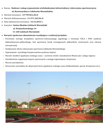 Nazwa: Budowa i zakup wyposażenia wielofunkcyjnej infrastruktury rekreacyjno-sportowej przy ul. Bartoszyckiej w Lidzbarku Warmińskim. Wartość inwestycji : 19 799 821,50 zł Wartość dofinansowania : 11 571 243,56 zł Data zakończenia inwestycji : 15.12.2015 r. Inwestor: Gmina Miejska Lidzbark Warmiński ul. Świętochowskiego 14 11-100 Lidzbark Warmiński Korzyści społeczno-ekonomiczne wynikające z realizacji projektu: Powstanie nowego kompleksu sportowo-rekreacyjnego (zgodnego z normami PZLA i FIFA stadionu lekkoatletyczno-piłkarskiego, hali sportowej, boisk treningowych piłkarskich, tenisowych oraz siłowni zewnętrznej) Zwiększenie oferty rekreacyjno-sportowej Lidzbarka Warmińskiego Zapewnienie wysokiego bezpieczeństwa podczas imprez Wysoki komfort spędzania wolnego czasu – zarówno wśród mieszkańców Miasta jak i całego regionu Umożliwienie organizacji imprez sportowych o zasięgu regionalnym i krajowym Wzrost zatrudnienia Stworzenie warunków do aktywnych form spędzenia wolnego czasu (lekkoatletyka, sporty drużynowe etc.)