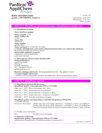 40.0 strona: 1/9 Karta charakterystyki zgodnie z 1907/2006/WE, Artykuł 31 Data druku: 27.01.2015 Aktualizacja: 27.01.2015 Numer wersji 4 SEKCJA 1: Identyfikacja substancji/mieszaniny i identyfikacja przedsiębiorstwa · 1.1 Identyfikator produktu · Nazwa handlowa: metanol · Numer artykułu: A2391 · Numer według CAS: 67-56-1 · Numer WE: 200-659-6 · Numer indeksu: 603-001-00-X · Numer rejestracji 01-2119433307-44-XXXX · 1.2 Istotne zidentyfikowane zastosowania substancji lub mieszaniny oraz zastosowania odradzane Brak dostępnych dalszych istotnych danych · Zastosowanie substancji / preparatu Chemical for various applications Laboratory chemical · 1.3 Dane dotyczące dostawcy karty charakterystyki · Producent/Dostawca: AppliChem GmbH Ottoweg 4 D-64291 Darmstadt Tel.: +49 (0)6151 93570 [email protected] · Komórka udzielająca informacji: Abteilung Qualitätskontrolle / Dep. Quality Control · 1.4 Numer telefonu alarmowego: +49(0)6151 93570 (während der normalen Geschäftszeiten / Inside normal business hours) SEKCJA 2: Identyfikacja zagrożeń · 2.1 Klasyfikacja substancji lub mieszaniny · Klasyfikacja zgodnie z rozporządzeniem (WE) nr 1272/2008 Flam. Liq. 2 H225 Wysoce łatwopalna ciecz i pary. Acute Tox. 3 H301 Działa toksycznie po połknięciu. Acute Tox. 3 H311 Działa toksycznie w kontakcie ze skórą. Acute Tox. 3 H331 Działa toksycznie w następstwie wdychania. STOT SE 1 H370 Powoduje uszkodzenie narządów. · Klasyfikacja zgodnie z dyrektywą Rady 67/548/EWG lub dyrektywą 1999/45/WE T; Produkt toksyczny R23/24/25-39/23/24/25: Działa toksycznie przez drogi oddechowe, w kontakcie ze skórą i po połknięciu. Działa toksycznie przez drogi oddechowe, w kontakcie ze skórą i po połknięciu; zagraża powstaniem bardzo poważnych nieodwracalnych zmian w stanie zdrowia. F; Produkt wysoce łatwopalny R11: Produkt wysoce łatwopalny. · 2.2 Elementy oznakowania · Oznakowanie zgodnie z rozporządzeniem (WE) nr 1272/2008 Substancja jest klasyfikowana i oznakowana zgodnie z przepisami CLP. (ciąg dalszy na stronie 2) PL 40.0 Karta charakterystyki zgodnie z 1907/2006/WE, Artykuł 31 strona: 2/9 Data druku: 27.01.2015 Aktualizacja: 27.01.2015 Numer wersji 4 Nazwa handlowa: metanol (ciąg dalszy od strony 1) · Piktogramy wskazujące rodzaj zagrożenia GHS02 GHS06 GHS08 · Hasło ostrzegawcze Niebezpieczeństwo · Składniki określające niebezpieczeństwo do etykietowania: metanol · Zwroty wskazujące rodzaj zagrożenia H225 Wysoce łatwopalna ciecz i pary. H301+H311+H331 Działa toksycznie po połknięciu, w kontakcie ze skórą lub w następstwiewdychania. H370 Powoduje uszkodzenie narządów. · Zwroty wskazujące środki ostrożności P280 Stosować rękawice ochronne/odzież ochronną/ochronę oczu/ochronę twarzy. P210 Przechowywać z dala od źródeł ciepła/iskrzenia/otwartego ognia/gorących powierzchni. Palenie wzbronione. P233 Przechowywać pojemnik szczelnie zamknięty. P309 W PRZYPADKU narażenia lub złego samopoczucia: P310 Natychmiast skontaktować się z OŚRODKIEM ZATRUĆ lub lekarzem. P302+P352 W PRZYPADKU KONTAKTU ZE SKÓRĄ: Umyć dużą ilością wody z mydłem. · 2.3 Inne zagrożenia · Wyniki oceny właściwości PBT i vPvB · PBT: Nie nadający się do zastosowania. · vPvB: Nie nadający się do zastosowania. SEKCJA 3: Skład/informacja o składnikach · 3.1 Charakterystyka chemiczna: Substancje · Nazwa wg nr CAS 67-56-1 metanol · Numer(y) identyfikacyjny(e) · Numer WE: 200-659-6 · Numer indeksu: 603-001-00-X SEKCJA 4: Środki pierwszej pomocy · 4.1 Opis środków pierwszej pomocy · Wskazówki ogólne: Ochrona osobista dla udzielającego pierwszej pomocy. · Po wdychaniu: Zadbać o świeże powietrze. W razie zatrzymania oddechu: natychmiast zastosować sztuczne oddychanie, w razie konieczności maskę tlenową. Natychmiast wezwać lekarza/pogotowie. · Po styczności ze skórą: Odzież zanieczyszczoną produktem należy niezwłocznie usunąć. Natychmiast zmyć wodą i mydłem i dobrze spłukać. Odwieźć do lekarza. · Po styczności z okiem: Przepłukać oczy z otwartą powieką przez kilka minut pod bieżącą wodą i zasięgnąć porady lekarza. · Po przełknięciu: Przepłukać jamę ustną i obficie popić wodą. Make victim drink ethanol (e.g. 1 drink glass off a 40 % alcoholic beverage). Nie powodować wymiotów i sprowadzić lekarza. · 4.2 Najważniejsze ostre i opóźnione objawy oraz skutki narażenia Dezorientacja Odurzenie (ciąg dalszy na stronie 3) PL 40.0 strona: 3/9 Karta charakterystyki zgodnie z 1907/2006/WE, Artykuł 31 Data druku: 27.01.2015 Aktualizacja: 27.01.2015 Numer wersji 4 Nazwa handlowa: metanol (ciąg dalszy od strony 2) Ból głowy Nudności Zawroty głowy Skurcze · 4.3 Wskazania dotyczące wszelkiej natychmiastowej pomocy lekarskiej i szczególnego postępowania z poszkodowanym Brak dostępnych dalszych istotnych danych SEKCJA 5: Postępowanie w przypadku pożaru · 5.1 Środki gaśnicze · Przydatne środki gaśnicze: CO2 Proszek gaśniczy Piana · Środki gaśnicze nieprzydatne ze względów bezpieczeństwa: Woda pełnym strumieniem · 5.2 Szczególne zagrożenia związane z substancją lub mieszaniną palny. Pary są cięższe od powietrza i mogą zalegać przy powierzchni gruntu. W podwyższonej temperaturze tworzy wybuchowe mieszaniny z powietrzem. W razie pożaru możliwe powstawanie niebezpiecznych palnych gazów lub par. Forms explosive mixtures with air at ambient temperatures. Wystrzegać się zaplonu wstecznego. · 5.3 Informacje dla straży pożarnej · Specjalne wyposażenie ochronne: Nosić urządzenie ochrony dróg oddechowych niezależnie od powietrza otoczenia. In order to avoid contact with skin, keep a safety distance and wear suitable protective clothing. · Inne dane Zagrożone zbiorniki ochłodzić strumieniem wody. Wodę skażoną należy zbierać oddzielnie, nie może ona dostać się do kanalizacji. SEKCJA 6: Postępowanie w przypadku niezamierzonego uwolnienia do środow
