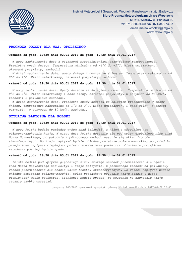 Instytut Meteorologii i Gospodarki Wodnej - Państwowy Instytut Badawczy Biuro Prognoz Meteorologicznych we Wrocławiu 51-616 Wrocław ul. Parkowa 30 tel: 071-320-01-50, fax: 071-348-73-37 email: [email protected] www: www.imgw.pl PROGNOZA POGODY DLA WOJ. OPOLSKIEGO ważność od godz. 19:30 dnia 02.01.2017 do godz. 19:30 dnia 03.01.2017 W nocy zachmurzenie duże z większymi przejaśnieniami przejściowo rozpogodzenia. Przelotne opady śniegu. Temperatura minimalna od -4°C do -2°C. Wiatr umiarkowany, okresami porywisty, zachodni. W dzień zachmurzenie duże, opady śniegu i deszcz ze śniegiem. Temperatura maksymalna od 0°C do 2°C. Wiatr umiarkowany, okresami porywisty, zachodni. ważność od godz. 19:30 dnia 03.01.2017 do godz. 19:30 dnia 04.01.2017 W nocy zachmurzenie duże. Opady deszczu ze śniegiem i deszczu. Temperatura minimalna od 0°C do 2°C. Wiatr umiarkowany i dość silny, okresami porywisty, w porywach do 80 km/h, zachodni i południowo-zachodni. W dzień zachmurzenie duże. Przelotne opady deszczu ze śniegiem przechodzące w opady śniegu. Temperatura maksymalna od 1°C do 3°C. Wiatr umiarkowany i dość silny, okresami porywisty, w porywach do 80 km/h, zachodni. SYTUACJA BARYCZNA DLA POLSKI ważność od godz. 19:30 dnia 02.01.2017 do godz. 19:30 dnia 03.01.2017 W nocy Polska będzie pomiędzy wyżem znad Irlandii, a niżem z ośrodkiem nad północno-zachodnią Rosją. W ciągu dnia Polska dostanie się pod wpływ głębokiego niżu znad Morza Norweskiego, po południu z północnego zachodu nasunie się układ frontów atmosferycznych. Do kraju napływać będzie chłodne powietrze polarno-morskie, po południu przejściowo napłynie cieplejsza polarno-morska masa powietrza. Ciśnienie początkowo wzrośnie, później będzie spadać. ważność od godz. 19:30 dnia 03.01.2017 do godz. 19:30 dnia 04.01.2017 Polska będzie pod wpływem głębokiego niżu, którego ośrodek przemieszczać się będzie znad Morza Norweskiego nad Bałtyk i kraje bałtyckie. Z północnego zachodu na południowy wschód przemieszczać się będzie układ frontów atmosferycznych. Do Polski napływać będzie chłodne powietrze polarno-morskie, tylko początkowo południe kraju będzie w nieco cieplejszej masie powietrza. Ciśnienie będzie spadać, po południu na zachodzie kraju zacznie szybko wzrastać. prognozę 165/2017 opracował synoptyk dyżurny Michał Mercik, dnia 2017-01-02 12:05