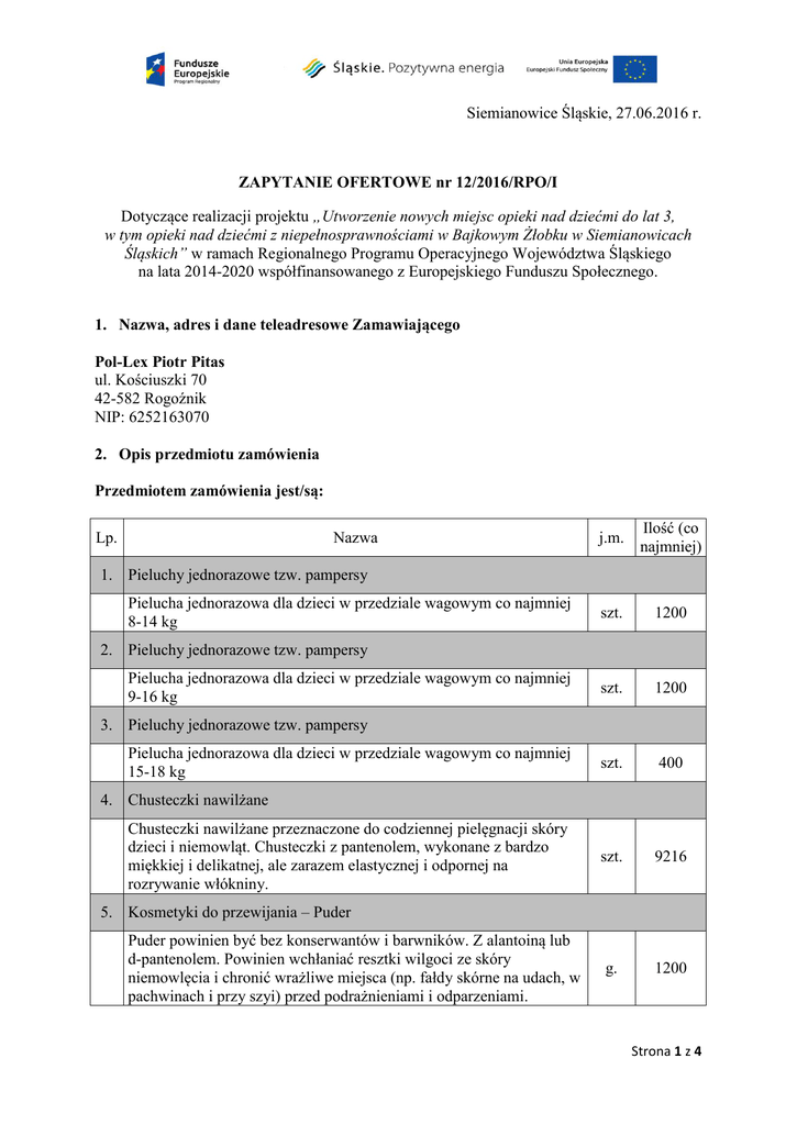 Siemianowice Śląskie, 27.06.2016 r. ZAPYTANIE OFERTOWE nr 12/2016/RPO/I Dotyczące realizacji projektu „Utworzenie nowych miejsc opieki nad dziećmi do lat 3, w tym opieki nad dziećmi z niepełnosprawnościami w Bajkowym Żłobku w Siemianowicach Śląskich” w ramach Regionalnego Programu Operacyjnego Województwa Śląskiego na lata 2014-2020 współfinansowanego z Europejskiego Funduszu Społecznego. 1. Nazwa, adres i dane teleadresowe Zamawiającego Pol-Lex Piotr Pitas ul. Kościuszki 70 42-582 Rogoźnik NIP: 6252163070 2. Opis przedmiotu zamówienia Przedmiotem zamówienia jest/są: Lp. Nazwa j.m. Ilość (co najmniej) szt. 1200 szt. 1200 szt. 400 szt. 9216 g. 1200 1. Pieluchy jednorazowe tzw. pampersy Pielucha jednorazowa dla dzieci w przedziale wagowym co najmniej 8-14 kg 2. Pieluchy jednorazowe tzw. pampersy Pielucha jednorazowa dla dzieci w przedziale wagowym co najmniej 9-16 kg 3. Pieluchy jednorazowe tzw. pampersy Pielucha jednorazowa dla dzieci w przedziale wagowym co najmniej 15-18 kg 4. Chusteczki nawilżane Chusteczki nawilżane przeznaczone do codziennej pielęgnacji skóry dzieci i niemowląt. Chusteczki z pantenolem, wykonane z bardzo miękkiej i delikatnej, ale zarazem elastycznej i odpornej na rozrywanie włókniny. 5. Kosmetyki do przewijania – Puder Puder powinien być bez konserwantów i barwników. Z alantoiną lub d-pantenolem. Powinien wchłaniać resztki wilgoci ze skóry niemowlęcia i chronić wrażliwe miejsca (np. fałdy skórne na udach, w pachwinach i przy szyi) przed podrażnieniami i odparzeniami. Strona 1 z 4 6. Kosmetyki do przewijania – Krem na odparzenia Krem antyseptyczny dla dzieci (np. Sudocrem) powinien działać odkażająco, osłaniająco, ściągająco, łagodząco i ochronnie na skórę (chroniący przed pieluszkowym zapaleniem skór). g. 2000 ml. 6400 ml. 4800 ml. 500 ml. 500 ml. 500 rolka 160 100 % celulozy, min. 2-warstwowy, min. 40 listków, dobrze chłonny i rolka wytrzymały na rozdzieranie. 40 7. Płyn do mycia ciała Płyn powinien pielęgnować wrażliwą skórę dzieci. Nie zawierać mydła ani środków konserwujących i barwiących. 8. Płyn do dezynfekcji w sprayu Gotowy do użycia płynny preparat dezynfekcyjno-myjący na bazie czwartorzędowych związków amoniowych o działaniu bakteriobójczym oraz grzybobójczym (w zakresie drożdżakobójczym). Bezzapachowy, nie wpływa ujemnie na dezynfekowane powierzchnie, nie powoduje korozji, nie niszczy powierzchni lakierowanych. Posiada Atest PZH. 9. Płyn do ozonowania powietrza Płyn oczyszczający powietrze z wolnych rodników i bakterii. 10. Płyn do odkażania powietrza z azotanem srebra Płyn odkażający i odświeżający powietrze. Bakteriobójczy i przeciw wirusowy. 11. Płyn inhalacyjny do jodowania Płyn nawilżający powietrze. 12. Papier toaletowy Posiada atest PZH, 100 % celulozy, min. 3-warstwowy, miękki, delikatny i wytrzymały na rozdzieranie. 13. Ręcznik papierowy kuchenny jednorazowy Uwaga ogólna: Wielkość pojedynczych opakowań ww. artykułów leży po stronie Wykonawcy. Sumaryczna ilość dostarczonego produktu ma wynosić co najmniej wartość wskazaną w kolumnie „Ilość” dla danego produktu, nie jest istotna ilość dostarczonych opakowań. Przekazane produkty mają pozostawać w fabrycznym zamknięciu (nie dotyczy pieluch tetrowych). 3. Warunki udziału w postępowaniu oraz opis sposobu dokonywania oceny ich spełniania. a) O udzielnie zamówienia mogą ubiegać się Wykonawcy, którzy: i) w terminie złożyli wypełniony i podpisany formularz ofertowy, sporządzony w języku polskim, którego wzór stanowi załącznik nr 1 do zapytania ofertowego; Strona 2 z 4 ii) ofertę złożono zgodnie z reprezentacją Wykonawcy lub jego pełnomocnictwem. iii) zadeklarują dostarczenie artykułów przedmiotu zamówienia do Bajkowego Żłobka (ul. Pułaskiego 3, 41-100 Siemianowice Śląskie) nie później niż do 05.07.2016 r. b) Zamawiający po otrzymaniu ofert zobowiązany jest do ich analizy w oparciu o powyższe informacje na podstawie oferty i zawartych w niej informacji. c) Powyższe warunki maja charakter obligatoryjny. 4. Informację o kryteriach oceny oraz wagach punktowych lub procentowych przypisanych do poszczególnych kryteriów oceny oferty. a) cena 100% 5. Opis sposobu przyznawania punktacji za spełnienie danego kryterium oceny oferty. Do porównania ofert będzie brana cena brutto. Najkorzystniejszą ofertą zostanie wybrana ta, z najwyższą liczbą uzyskanych punktów, obliczaną według poniższego wzoru: Ad. a. C = Cena brutto najtańszej oferty/Oferowana cena brutto x 100pkt Zamawiający wybierze ofertę/y najkorzystniejszą na podstawie kryteriów oceny ofert określonych w niniejszym zapytaniu ofertowym dla poszczególnych części zapytania. Oferta, która uzyska największa liczbę punktów w danej części zapytania wg powyższych kryteriów i metodologii obliczania zostanie uznana za najkorzystniejszą dla danej części zapytania. W przypadku gdy najkorzystniejsza oferta w całości przekroczy budżet przeznaczony na działania będące przedmiotem zapytania, Zamawiający może podjąć negocjacje z oferentami. 6. Termin i miejsce składania ofert. Podpisany formularz ofertowy należy przesłać w formie skanu za pośrednictwem poczty elektronicznej na adres: [email protected] lub oryginał za pomocą poczty, kuriera bądź też dostarczyć osobiście na adres: ul. Pułaskiego 3 41-100 Siemianowice Śląskie (Bajkowy Żłobek) nie później niż do 30.06.2016 r. do godziny 13:00 do biura Dyrektora/ki Żłobka. Oferty złożone po terminie nie będą rozpatrywane. Decyduje data i godzina wpłynięcia oferty do Zamawiającego. 7. Informacje na temat zakresu wykluczenia. Wykluczeniu z postępowania podlegają Wykonawcy: a) w stosunku do których otwarto likwidację lub których upadłość ogłoszono; b) którzy zalegają z uiszczeniem podatków, opłat lub składek na ubezpieczenia społeczne lub zdrowotne, z wyjątkiem przy