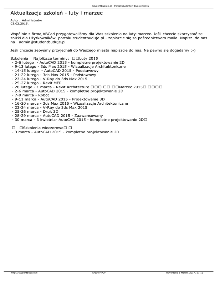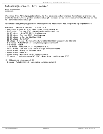 StudentBuduje.pl - Portal Studentów Budownictwa Aktualizacja szkoleń - luty i marzec Autor: Administrator 03.02.2015. Wspólnie z firmą ABCad przygotowaliśmy dla Was szkolenia na luty-marzec. Jeśli chcecie skorzystać ze zniżki dla Użytkowników portalu studentbuduje.pl - zapiszcie się za pośrednictwem maila. Napisz do nas na [email protected] Jeśli chcecie żebyśmy przyjechali do Waszego miasta napiszcie do nas. Na pewno się dogadamy :-) Szkolenia Najbliższe terminy: Luty 2015 - 2-6 lutego - AutoCAD 2015 - kompletne projektowanie 2D - 9-13 lutego - 3ds Max 2015 - Wizualizacje Architektoniczne - 14-15 lutego - AutoCAD 2015 - Podstawowy - 21-22 lutego - 3ds Max 2015 - Podstawowy - 23-24 lutego - V-Ray do 3ds Max 2015 - 25-27 lutego - Revit MEP - 28 lutego - 1 marca - Revit Architecture Marzec 2015 - 2-6 marca - AutoCAD 2015 - kompletne projektowanie 2D - 7-8 marca - Robot - 9-11 marca - AutoCAD 2015 - Projektowanie 3D - 16-20 marca - 3ds Max 2015 - Wizualizacje Architektoniczne - 23-24 marca - V-Ray do 3ds Max 2015 - 25-26 marca - Druk 3D - 28-29 marca - AutoCAD 2015 - Zaawansowany - 30 marca - 3 kwietnia- AutoCAD 2015 - kompletne projektowanie 2D Szkolenia wieczorowe - 3 marca - AutoCAD 2015 - kompletne projektowanie 2D http://studentbuduje.pl Kreator PDF Utworzono 8 March, 2017, 17:12