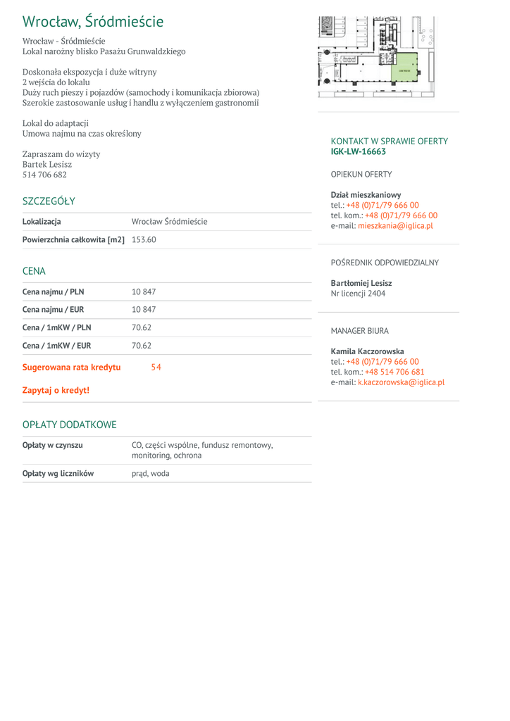 Wrocław, Śródmieście Wrocław - Śródmieście Lokal narożny blisko Pasażu Grunwaldzkiego Doskonała ekspozycja i duże witryny 2 wejścia do lokalu Duży ruch pieszy i pojazdów (samochody i komunikacja zbiorowa) Szerokie zastosowanie usług i handlu z wyłączeniem gastronomii Lokal do adaptacji Umowa najmu na czas określony KONTAKT W SPRAWIE OFERTY IGK-LW-16663 Zapraszam do wizyty Bartek Lesisz 514 706 682 OPIEKUN OFERTY SZCZEGÓŁY Lokalizacja Wrocław Śródmieście Dział mieszkaniowy tel.: +48 (0)71/79 666 00 tel. kom.: +48 (0)71/79 666 00 e-mail: [email protected] Powierzchnia całkowita [m2] 153.60 POŚREDNIK ODPOWIEDZIALNY CENA Cena najmu / PLN 10 847 Cena najmu / EUR 10 847 Cena / 1mKW / PLN 70.62 Cena / 1mKW / EUR 70.62 Sugerowana rata kredytu 54 Zapytaj o kredyt! OPŁATY DODATKOWE Opłaty w czynszu CO, części wspólne, fundusz remontowy, monitoring, ochrona Opłaty wg liczników prąd, woda Bartłomiej Lesisz Nr licencji 2404 MANAGER BIURA Kamila Kaczorowska tel.: +48 (0)71/79 666 00 tel. kom.: +48 514 706 681 e-mail: [email protected]